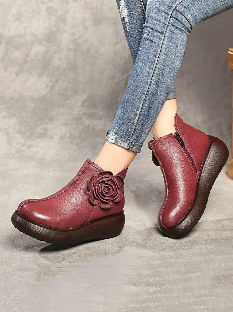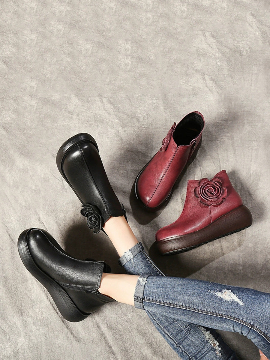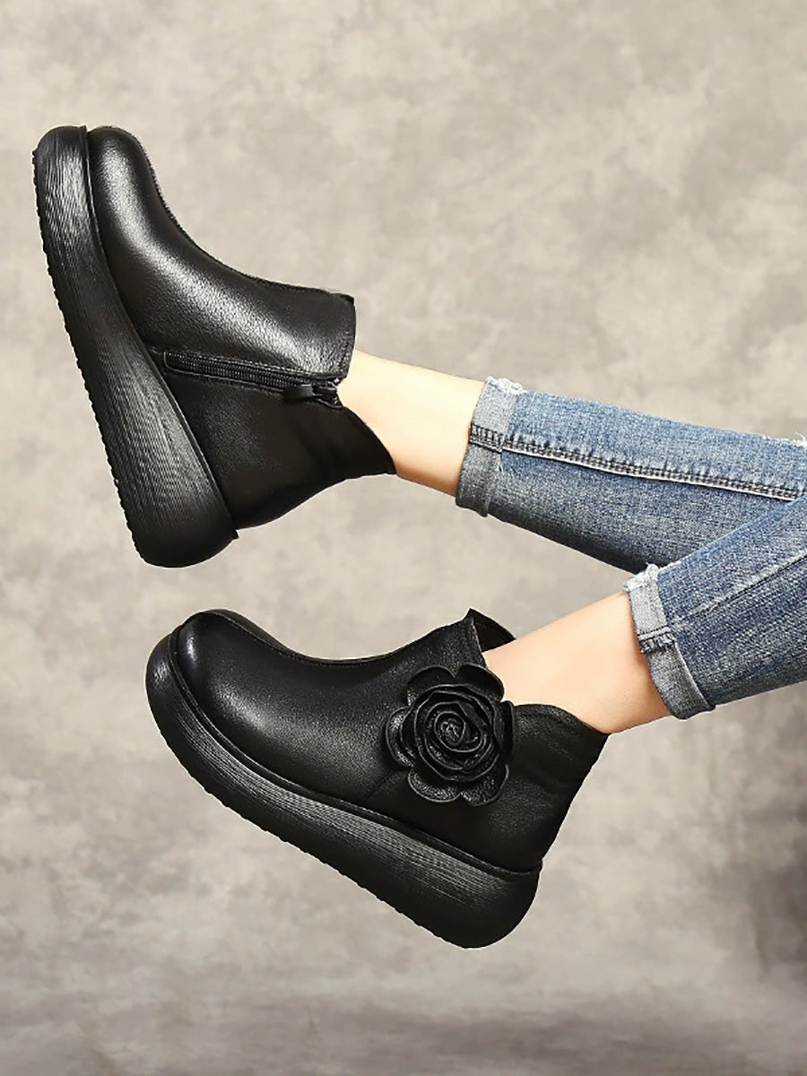 Dámské zimní kožené kotníkové boty na platformě s květinovým vzorem