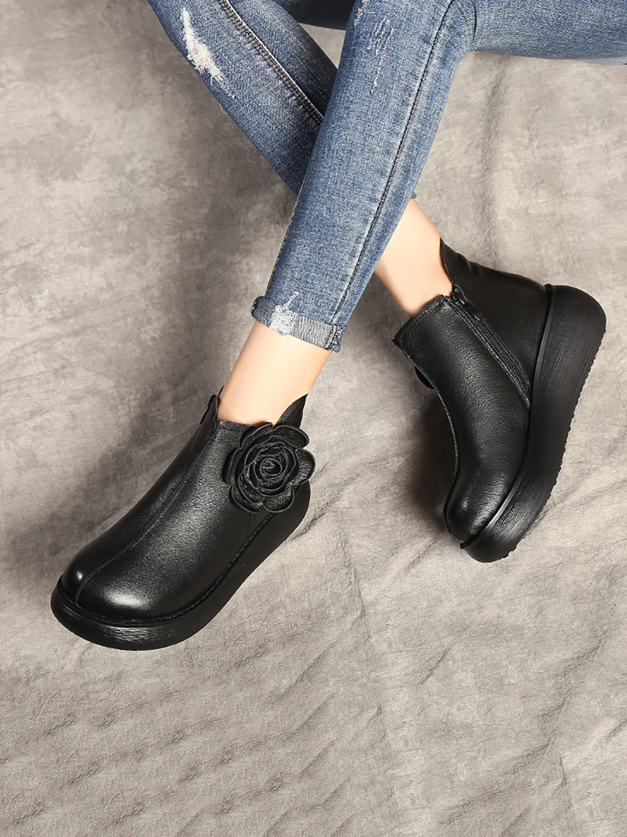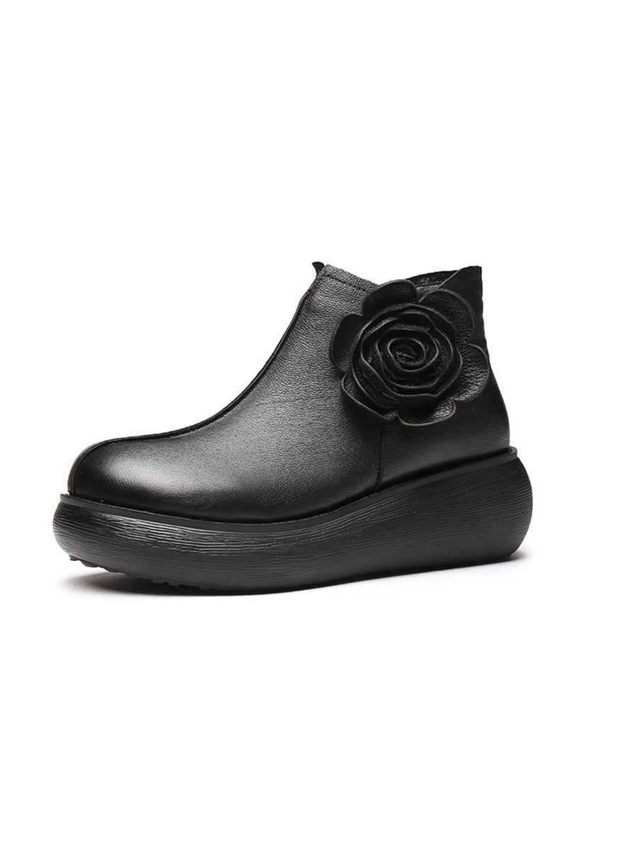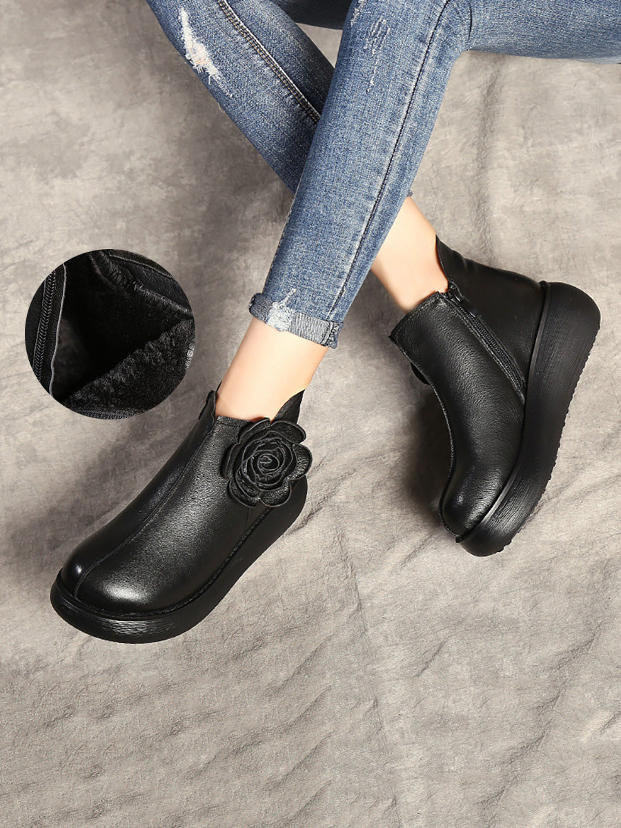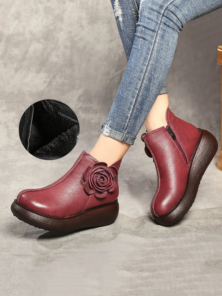 Dámské zimní kožené kotníkové boty na platformě s květinovým vzorem