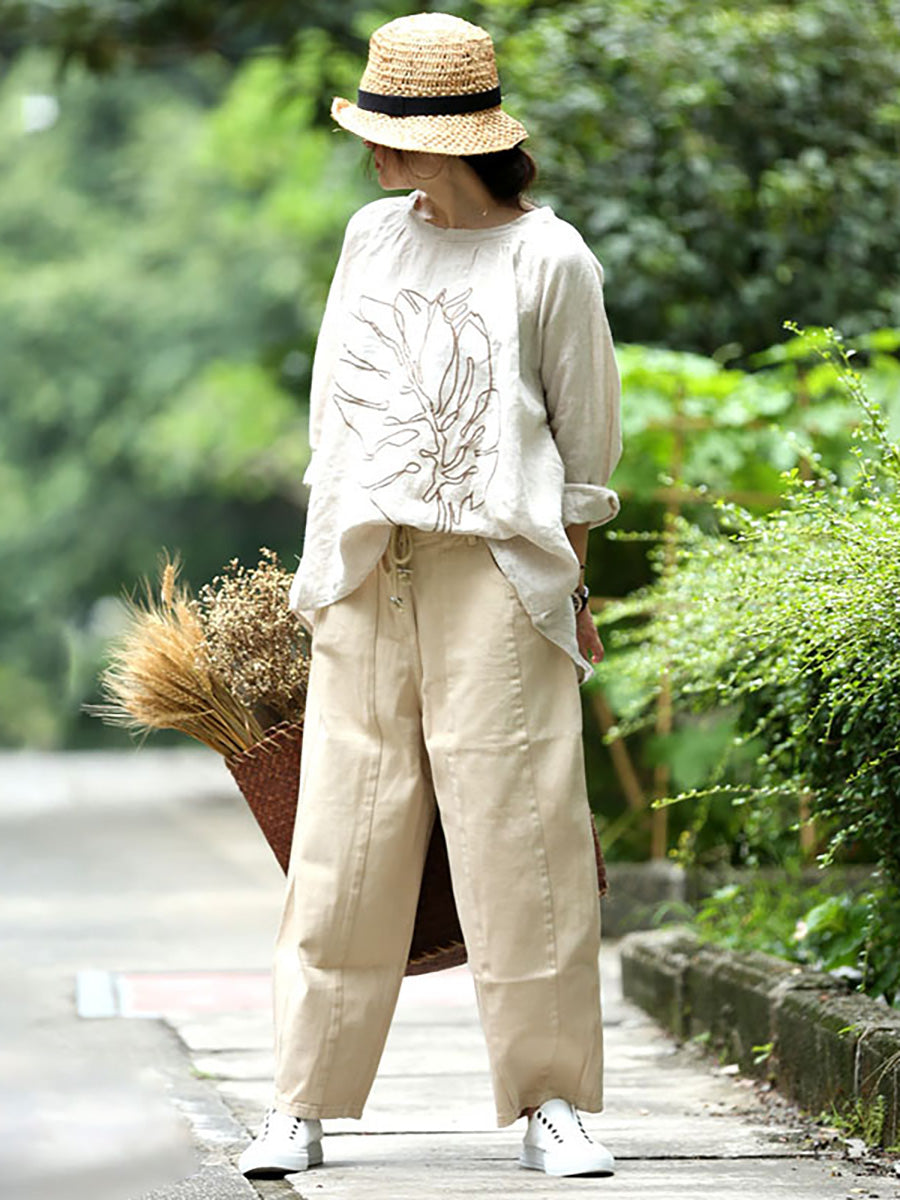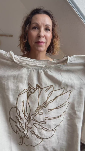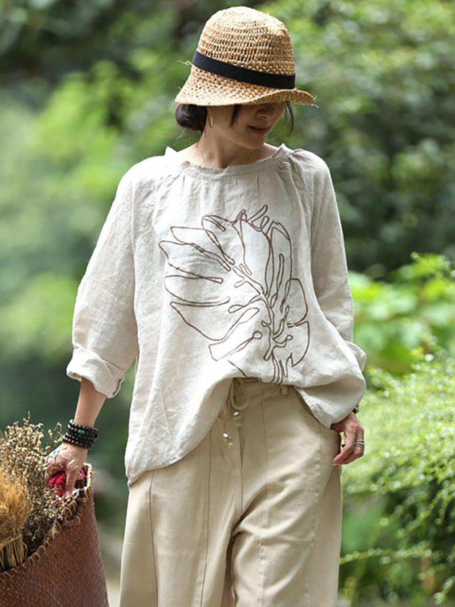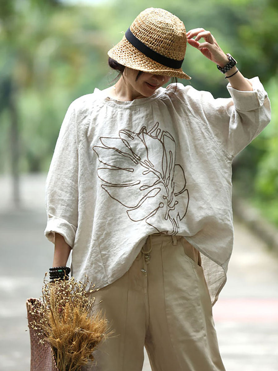 Plus Size - Broderi Langærmede efterår Løs T-shirt i hør