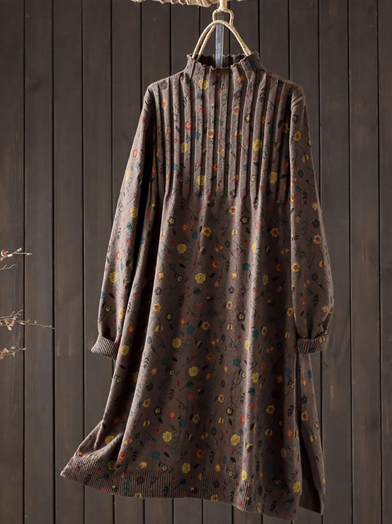 Kvinder Efterår Vintage Blomster Halv-Turtleneck Strikket Kjole