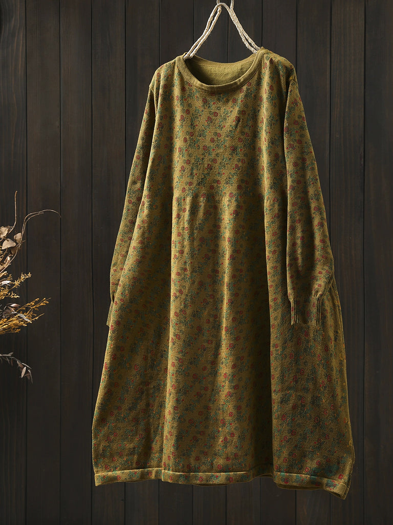 Kvinder Efterår Vintage Blomster O-hals Strikket Kjole