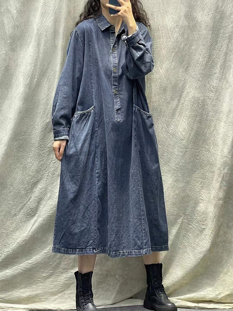 Plus Size Kvinder Forår Retro Pocket Button Loose Denim Kjole