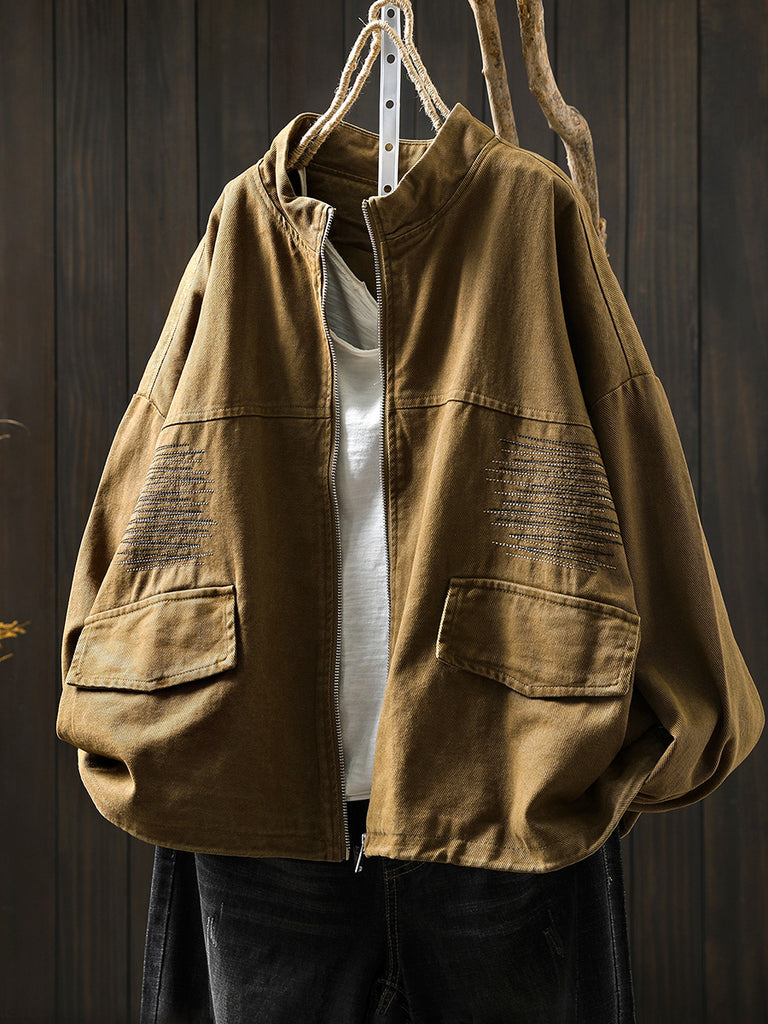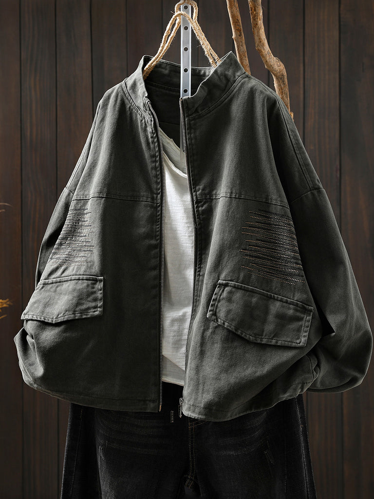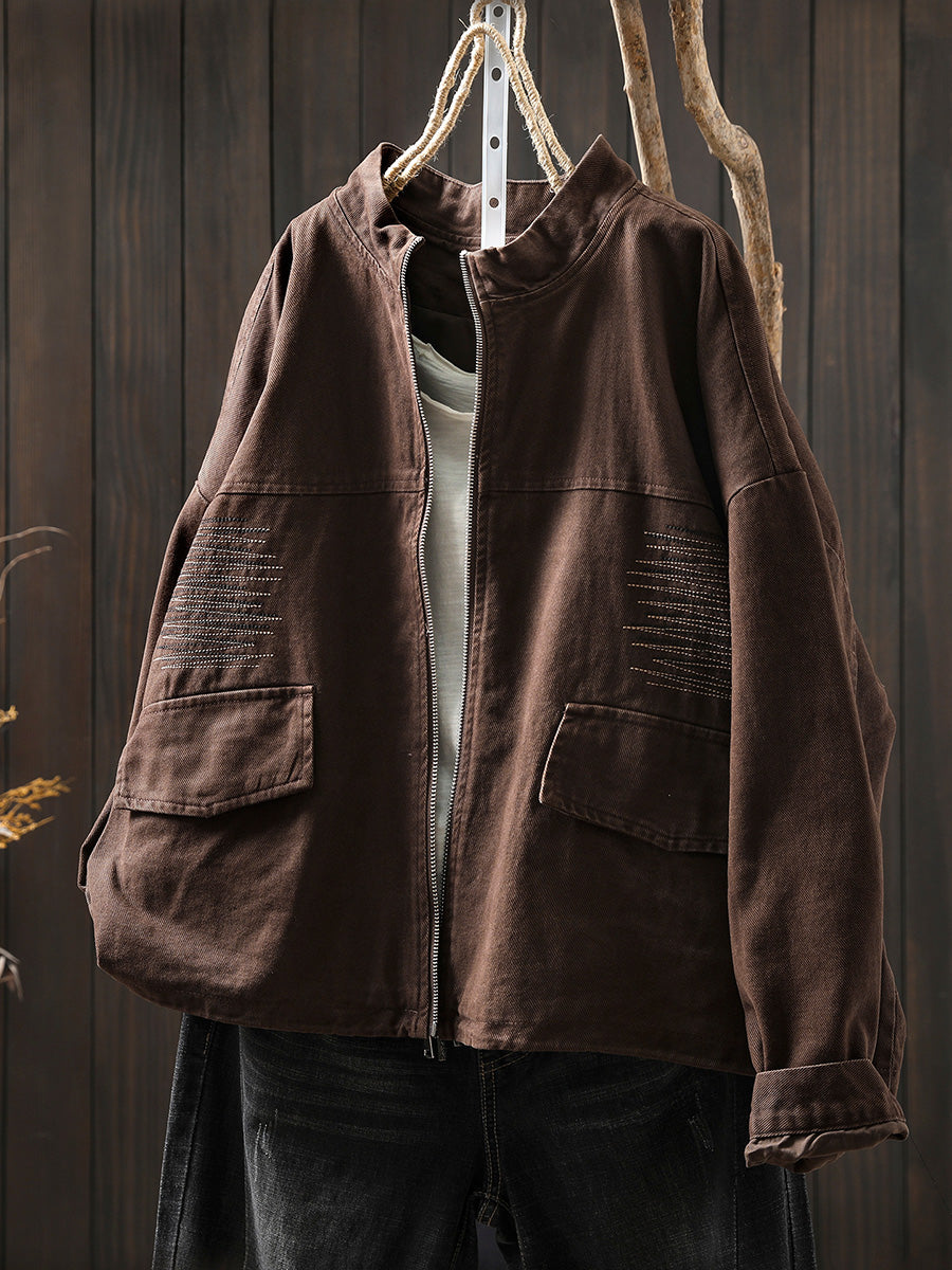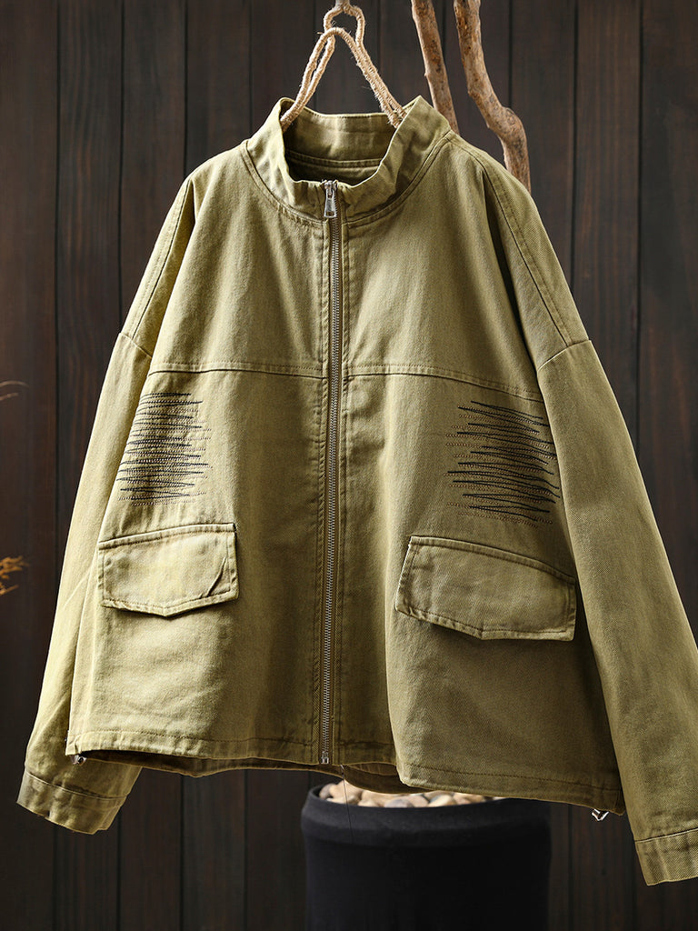 Dame Casual Ren Farve Stand Collar Broderi 100% Bomuldsskjorte