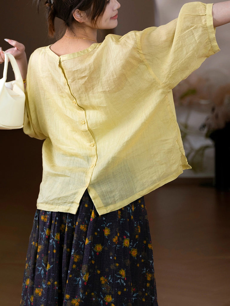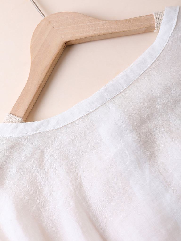 Kvinder Sommer Kunstnerisk Ren Farve O-Hals 100% Ramie Skjorte