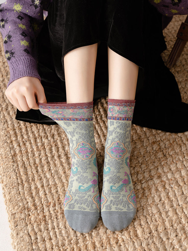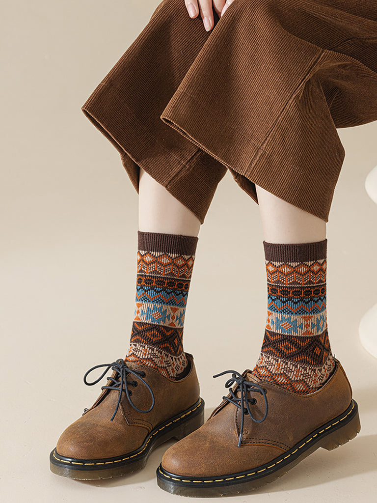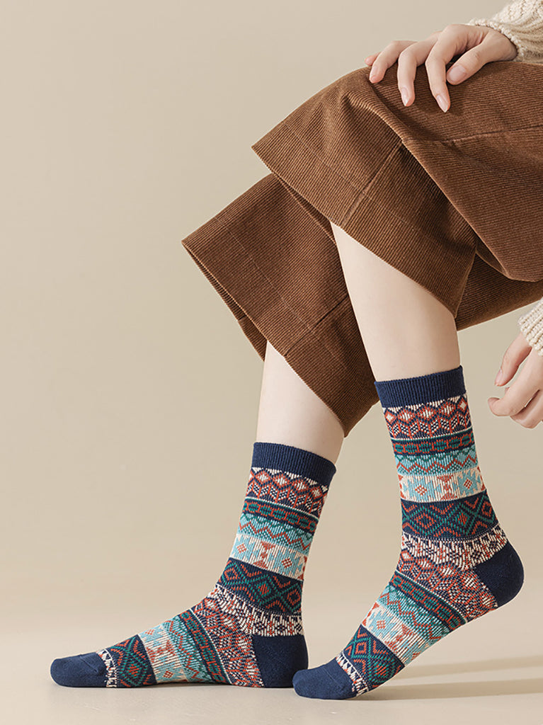 5 par vintersokker med etnisk blomst og mellemhøj hæl
