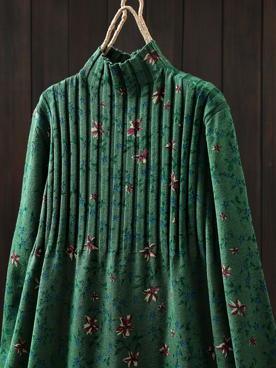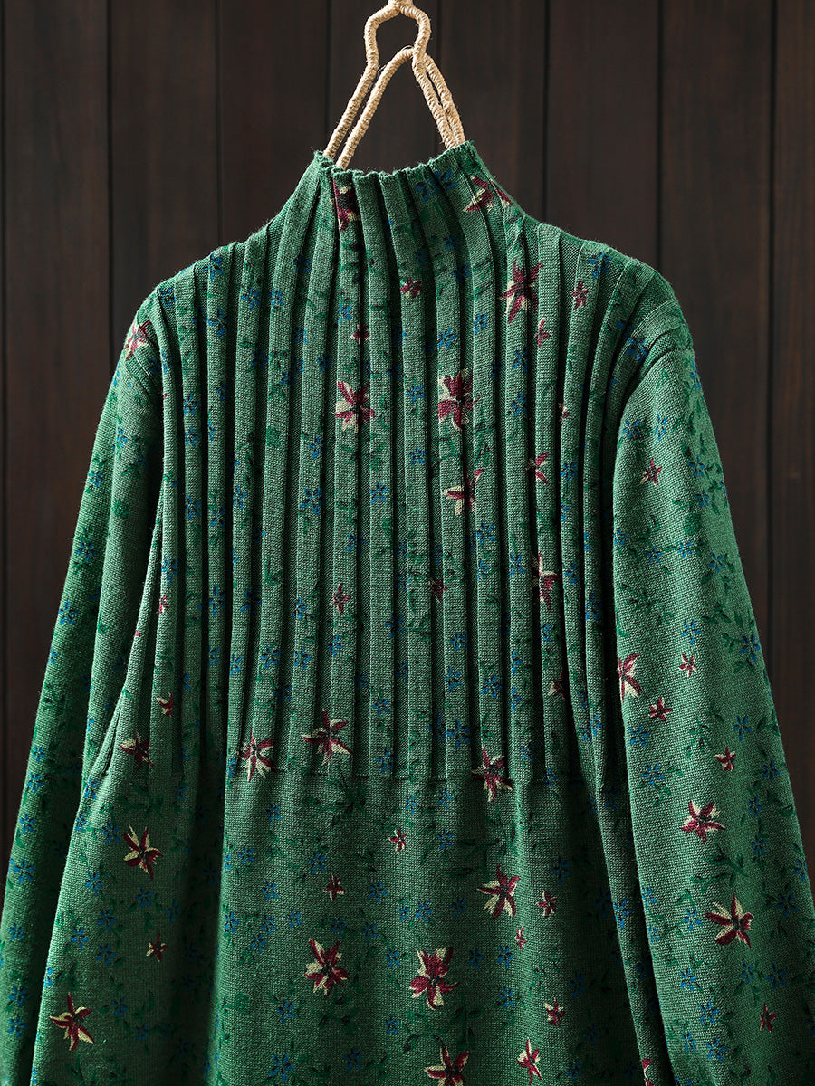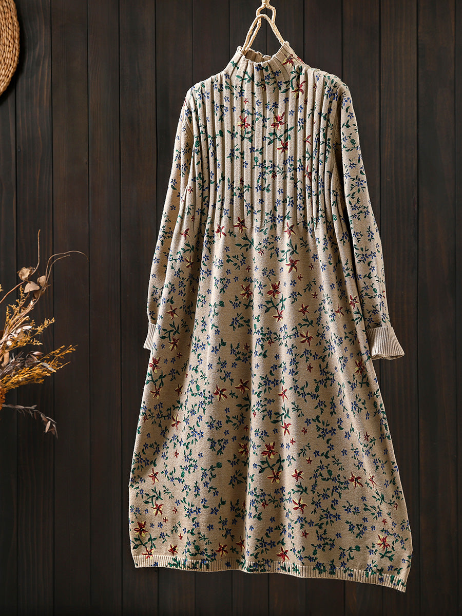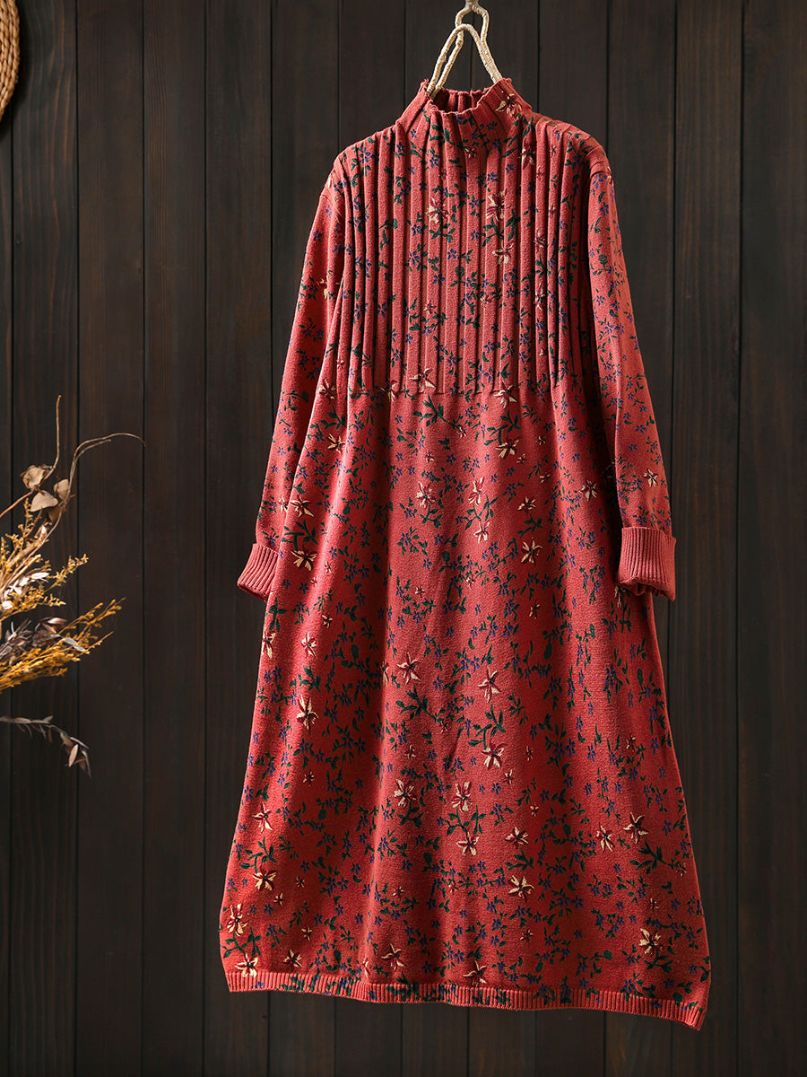 Kvinder Efterår Vintage Blomster Halv-Turtleneck Strikket Kjole