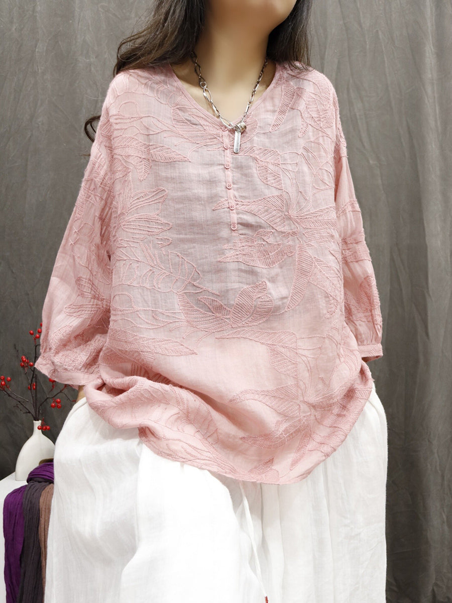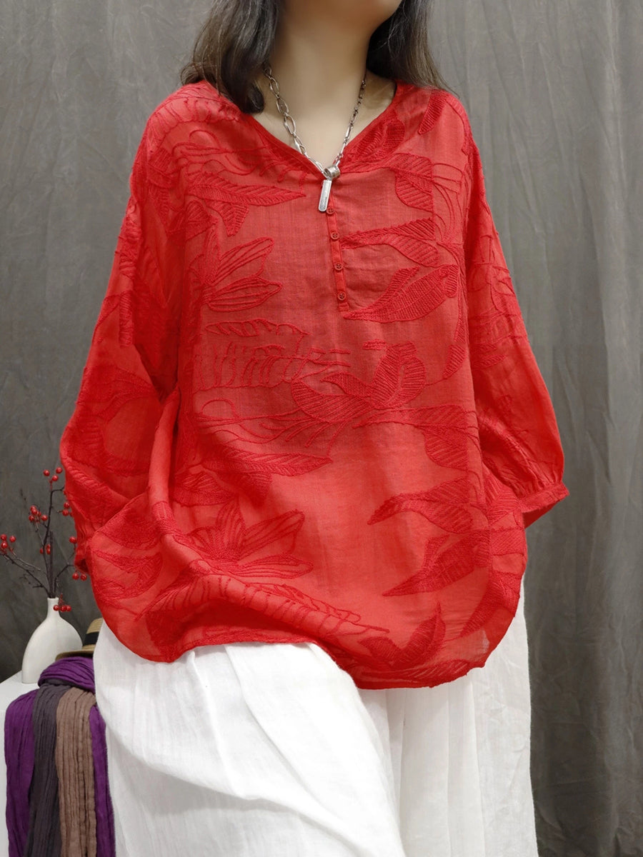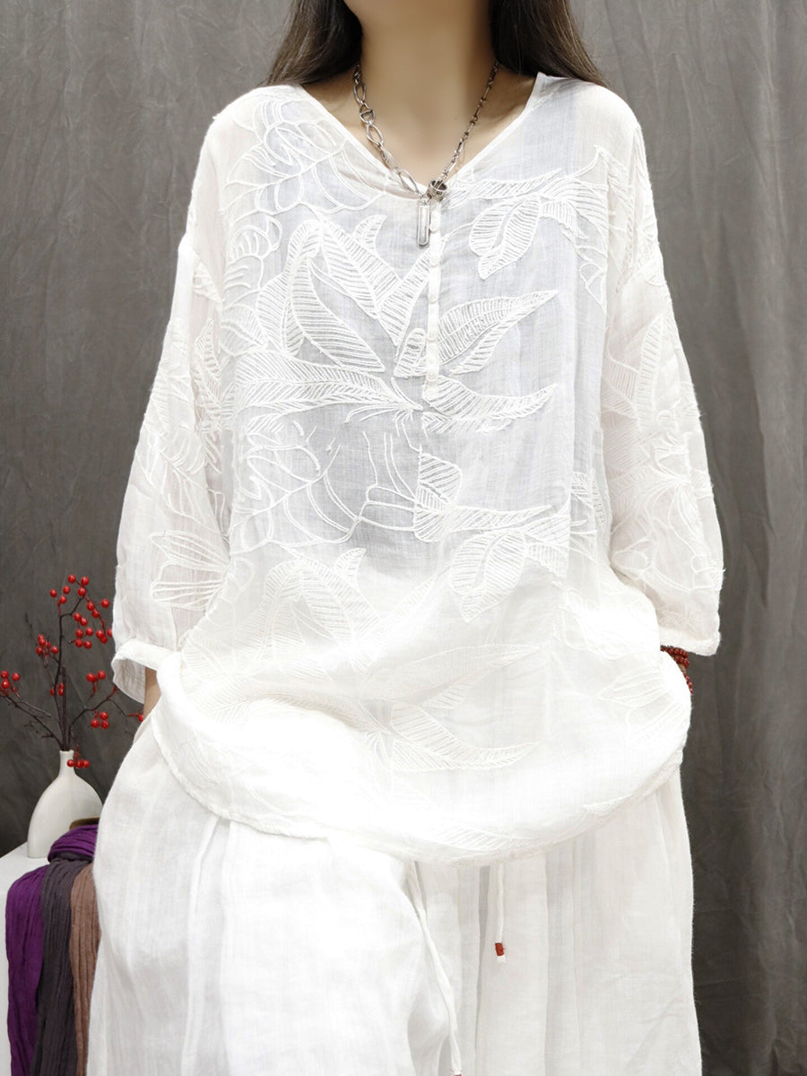 Kvinder Sommer Kunstnerisk Blomsterbroderi 100% Ramie Bluse