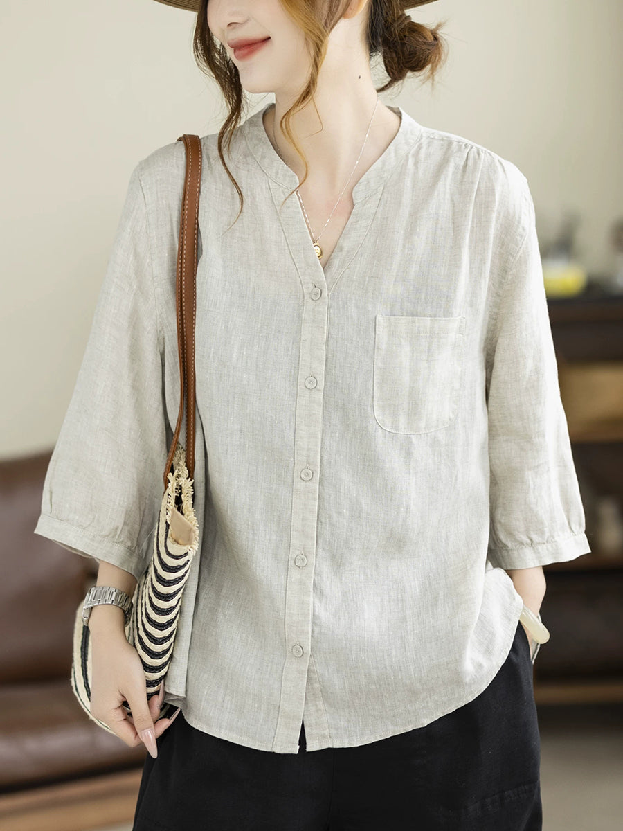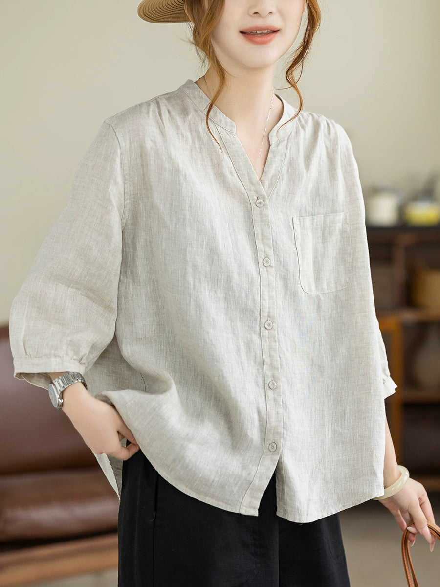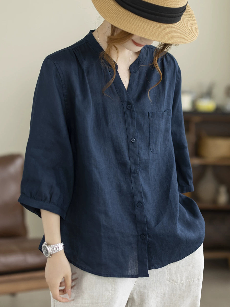 Dame Sommer Kunstnerisk Ren Farve V-Hals 100% Hørskjorte