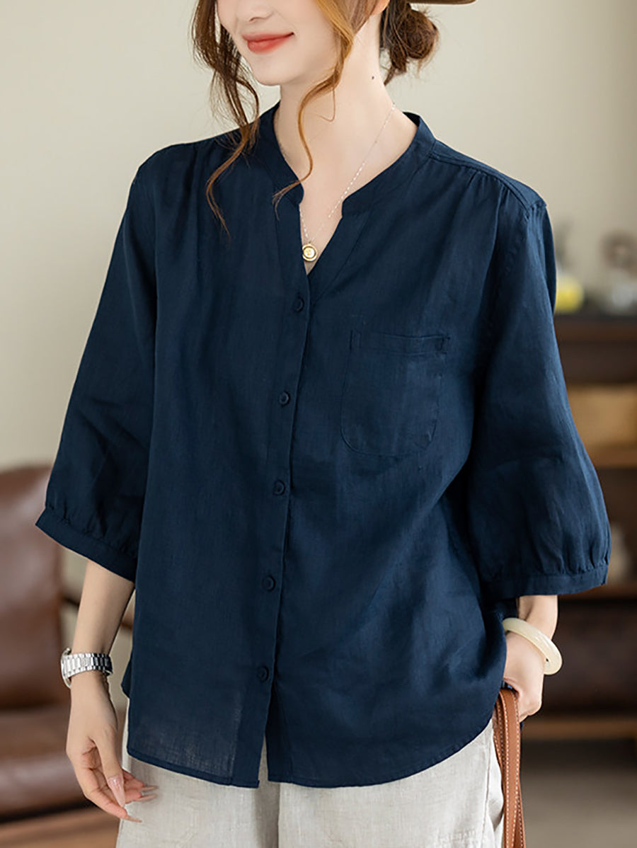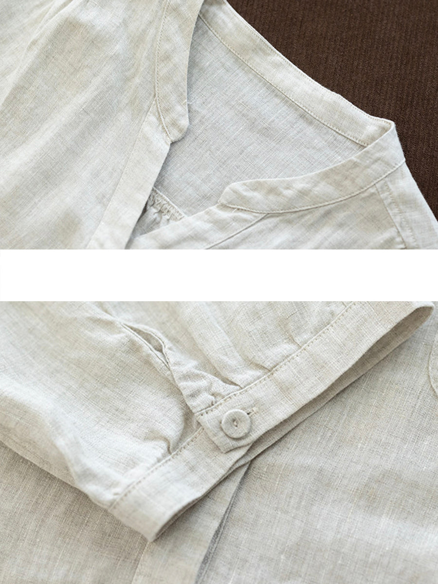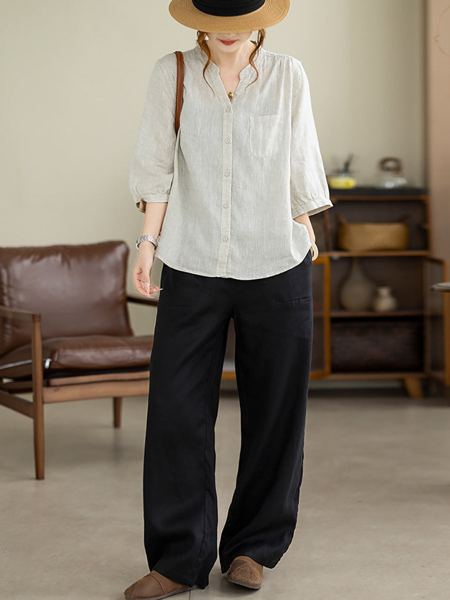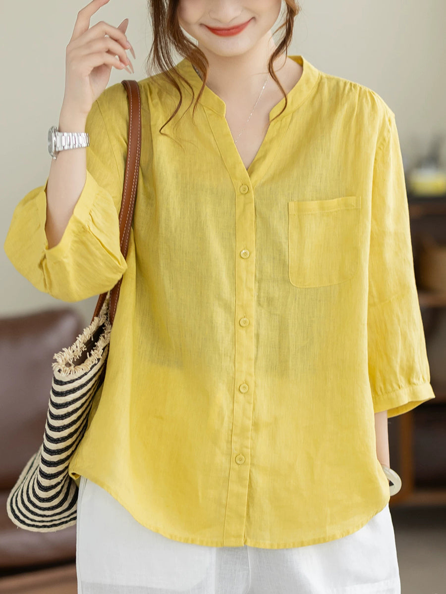 Dame Sommer Kunstnerisk Ren Farve V-Hals 100% Hørskjorte