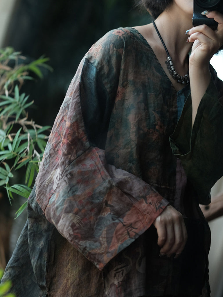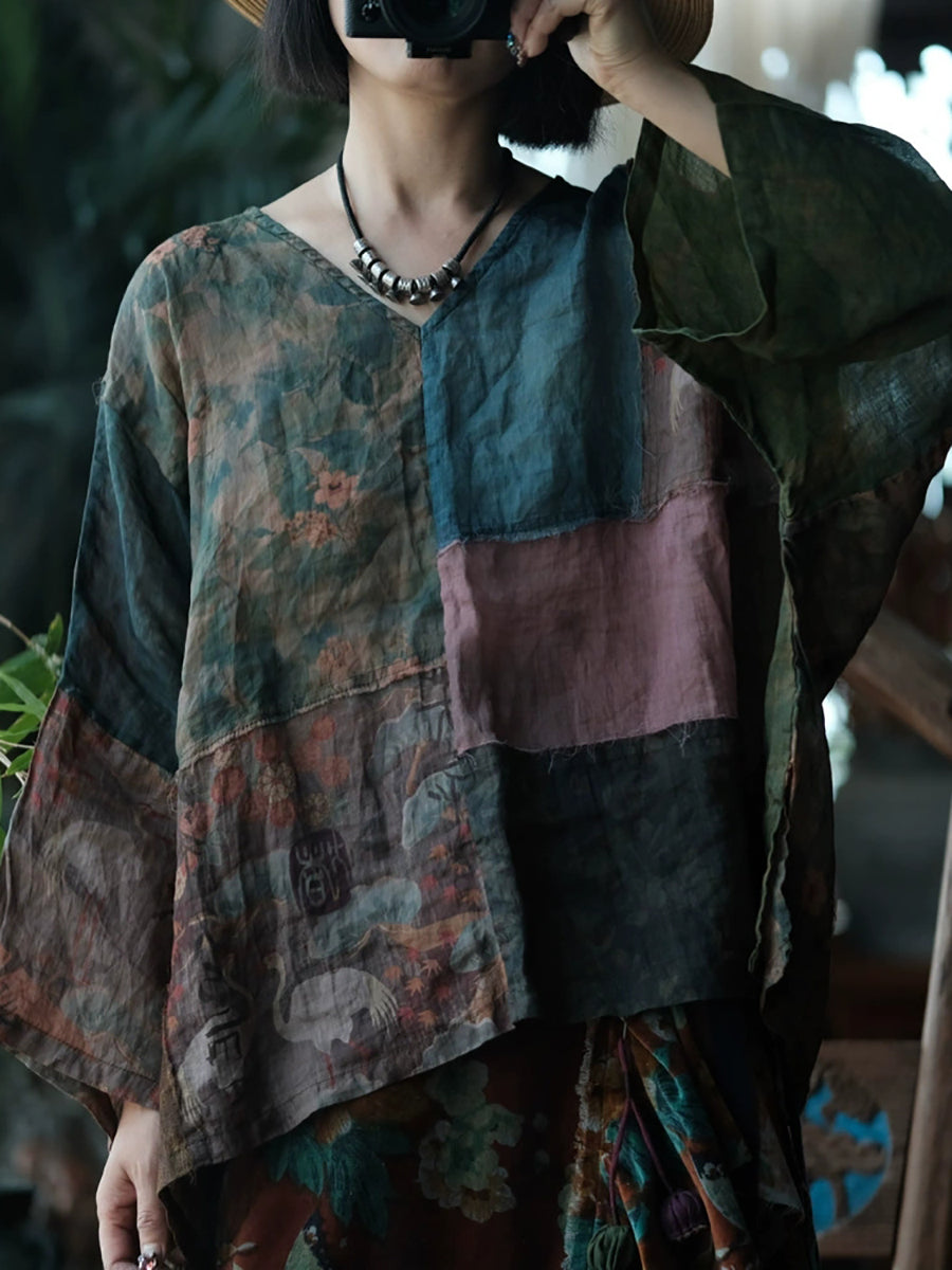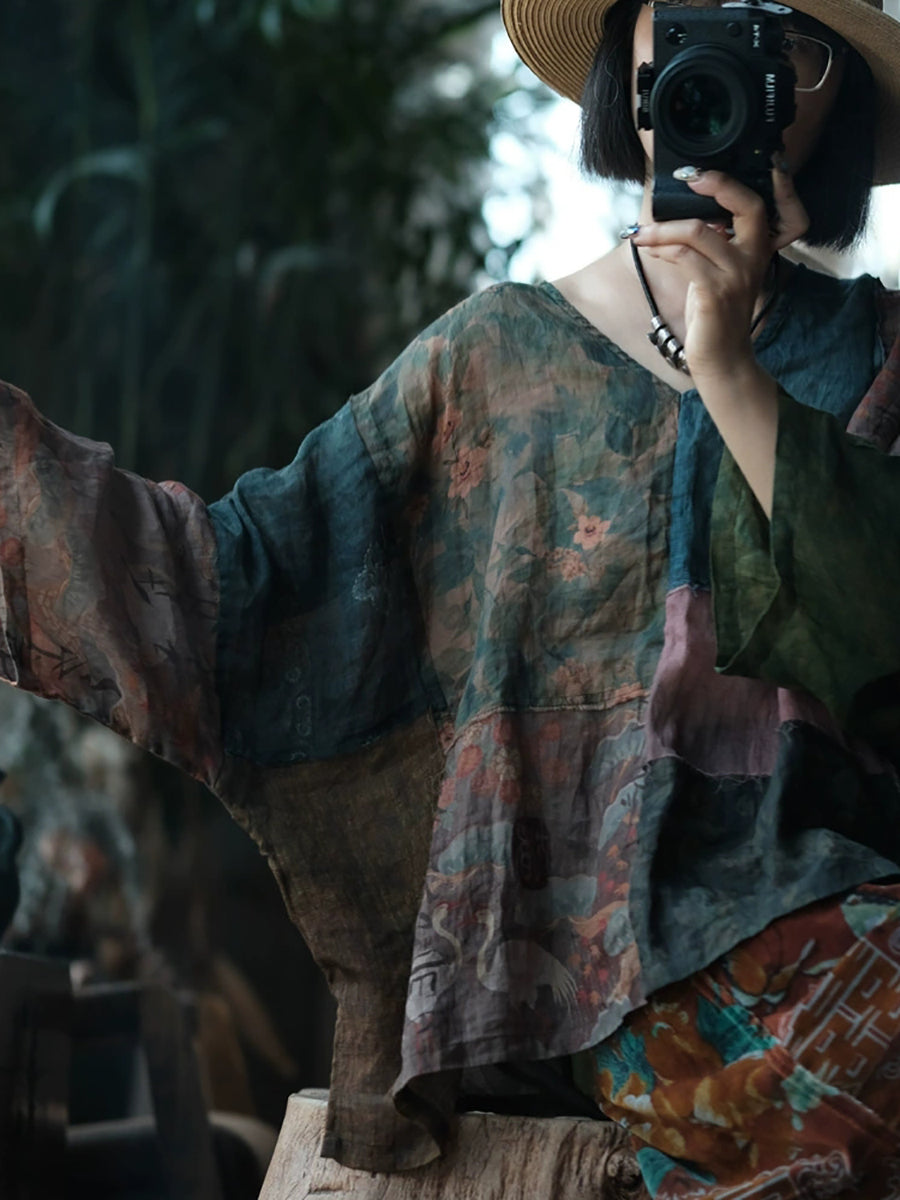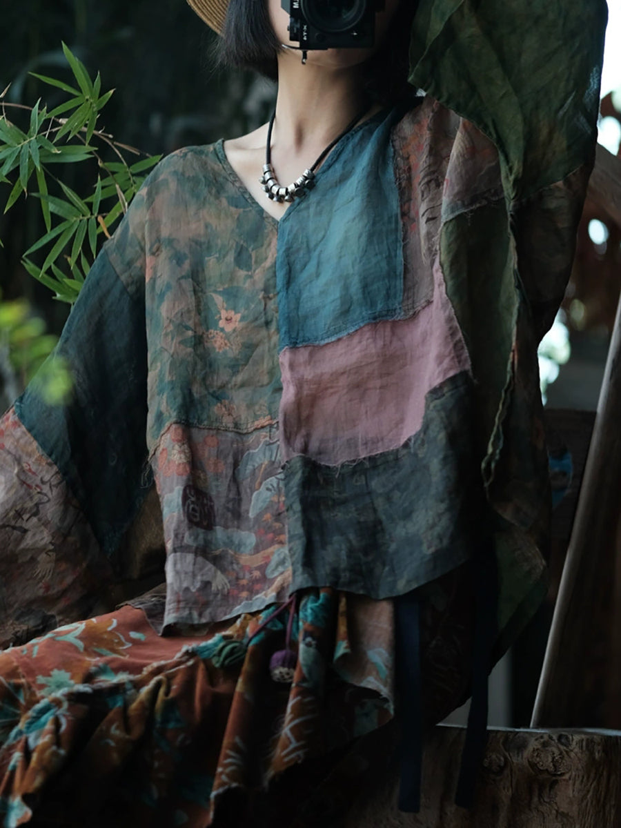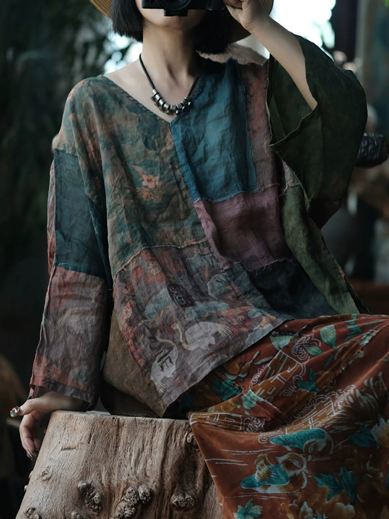 Kvinder Sommer Vintage Blomster Patchwork Ramie Skjorte