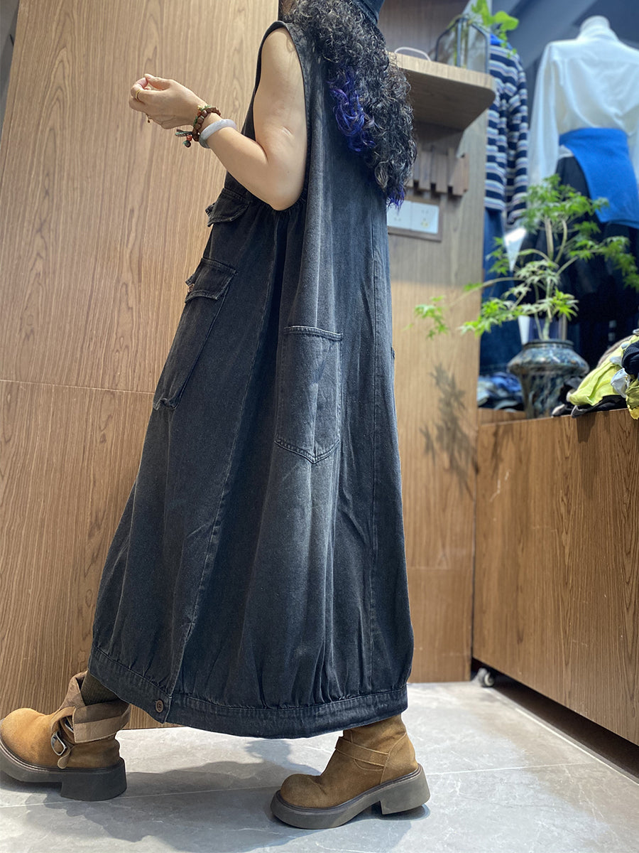 Denne sommerkjole med O-hals og vintage-udskæring til kvinder er lavet af denimmateriale og har en klassisk O-halskrave. Kjolen har et smukt, rent farvemønster og et ærmeløst design, perfekt til varmere årstider som sommer og forår. Kjolen går ned til anklen, hvilket gør den til en alsidig og stilfuld tilføjelse til enhver garderobe.