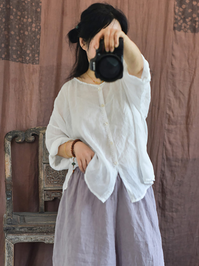Denne Vintage Solid Summer Stitching Bluse til kvinder har et solidt mønster. Den har en o-hals krave, fyldige raglanærmer og en vintage stil, der er perfekt til forårs- og sommersæsonen.