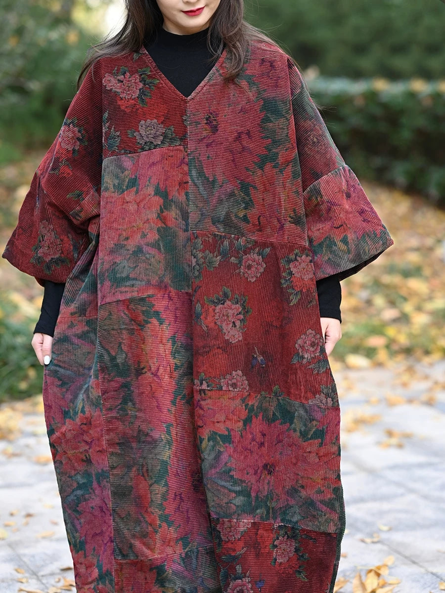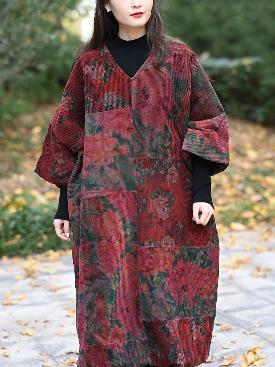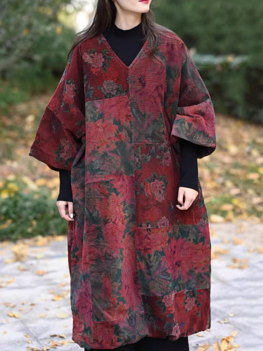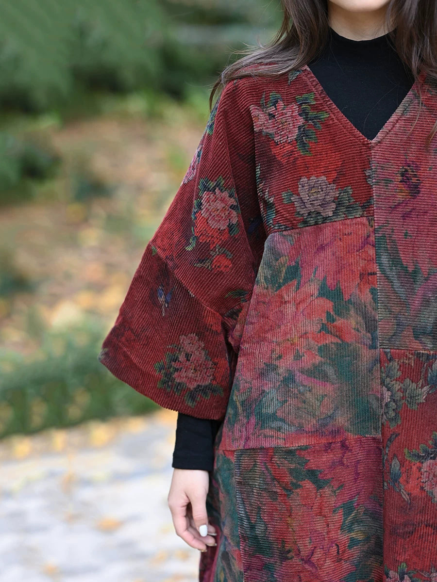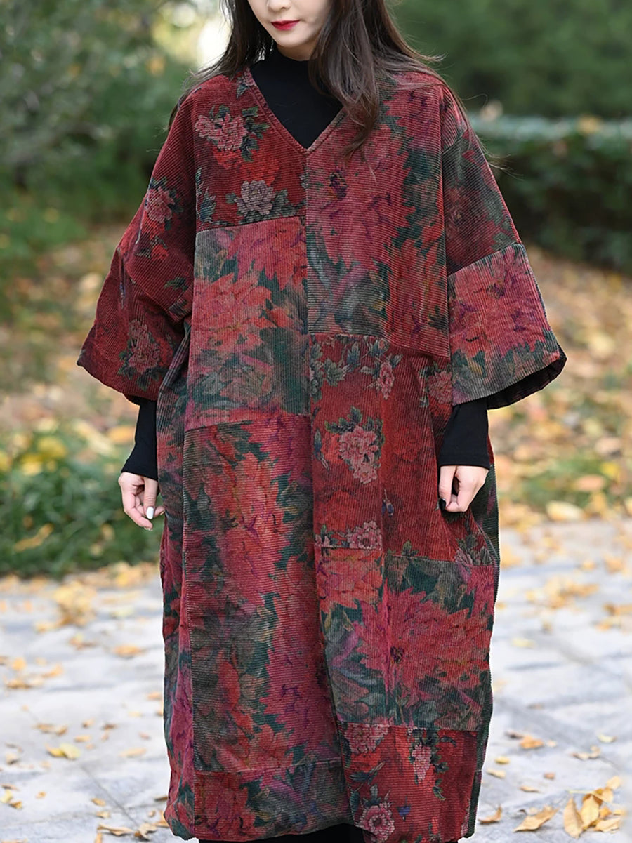 Kvinder Vinter Vintage Blomsterpatch Spliced V-hals Frakke