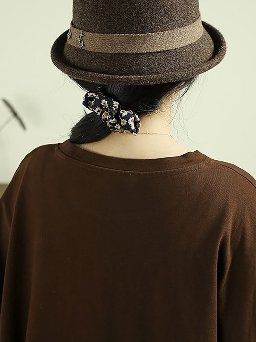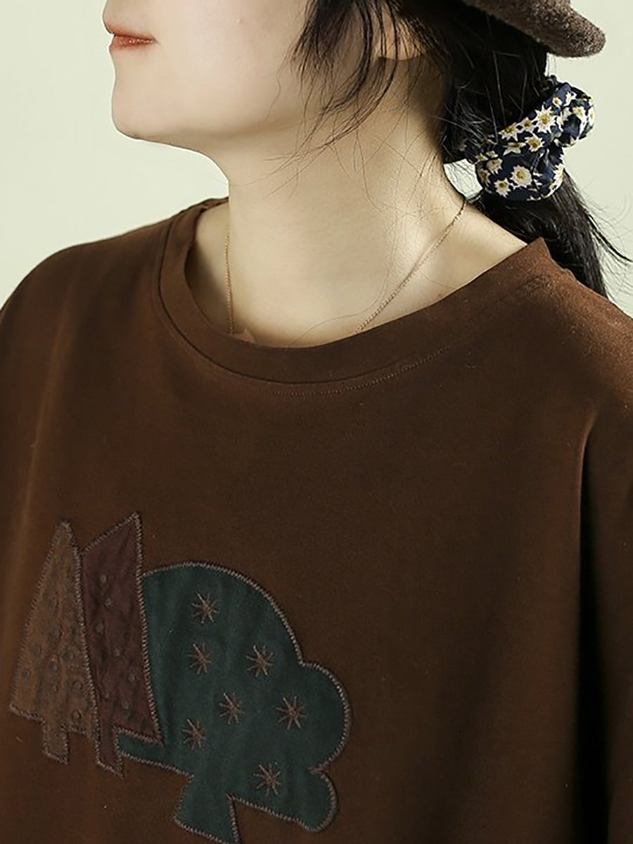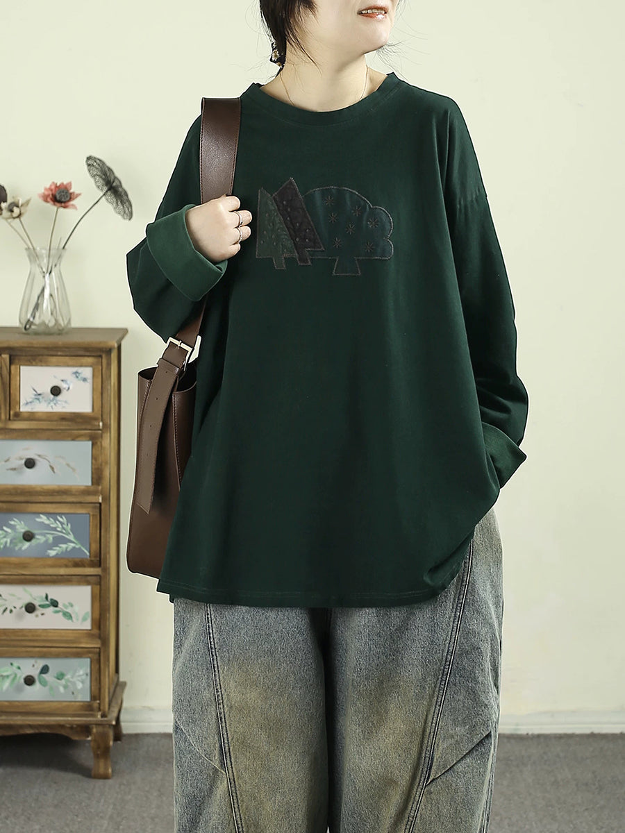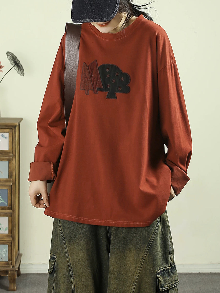 Damenbluse mit künstlerischem Baum-Patch-Muster, Rundhalsausschnitt, 100 % Baumwolle