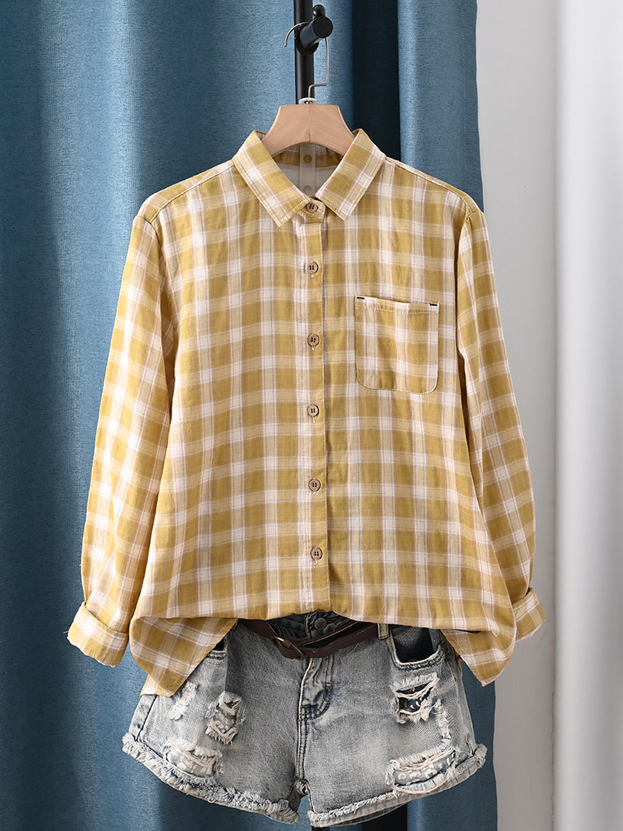 Damen Frühlingsbluse mit künstlerisch-kariertem Muster und Umlegekragen aus 100 % Baumwolle