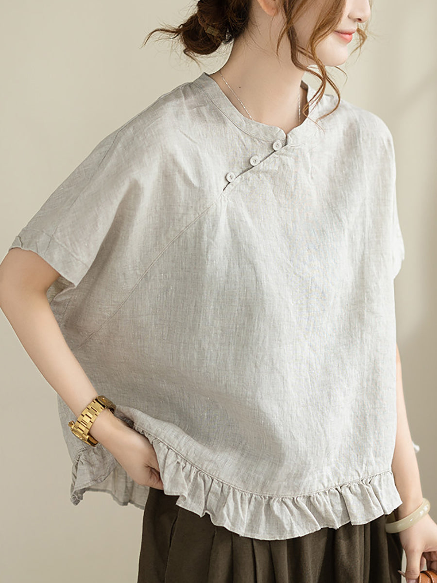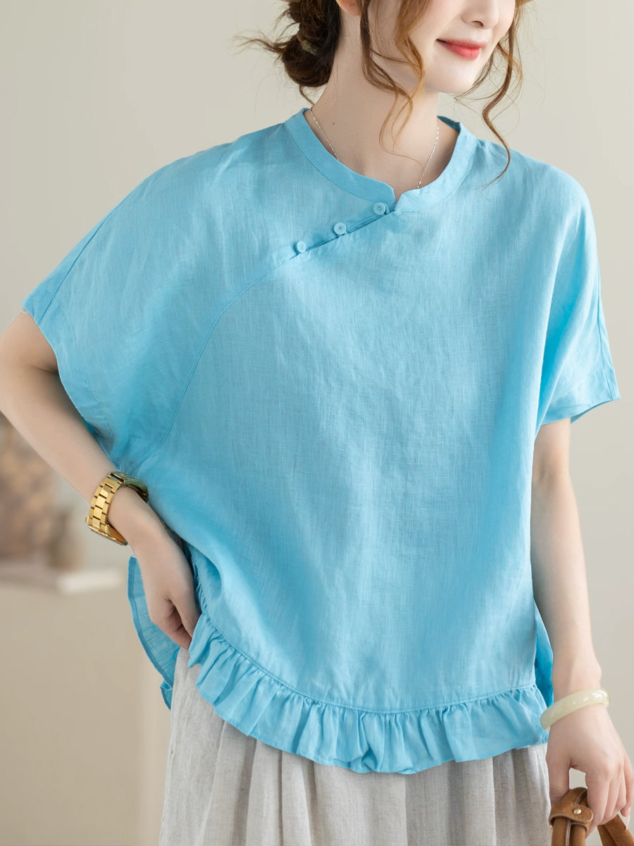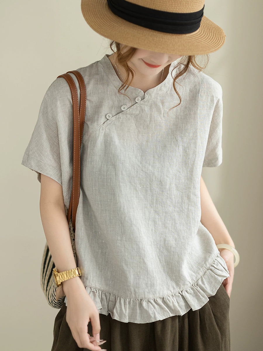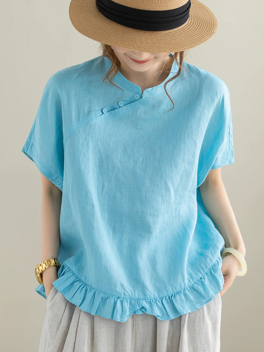 Damen Sommerbluse im Ethno-Stil, einfarbig, mit Stehkragen, 100% Leinen