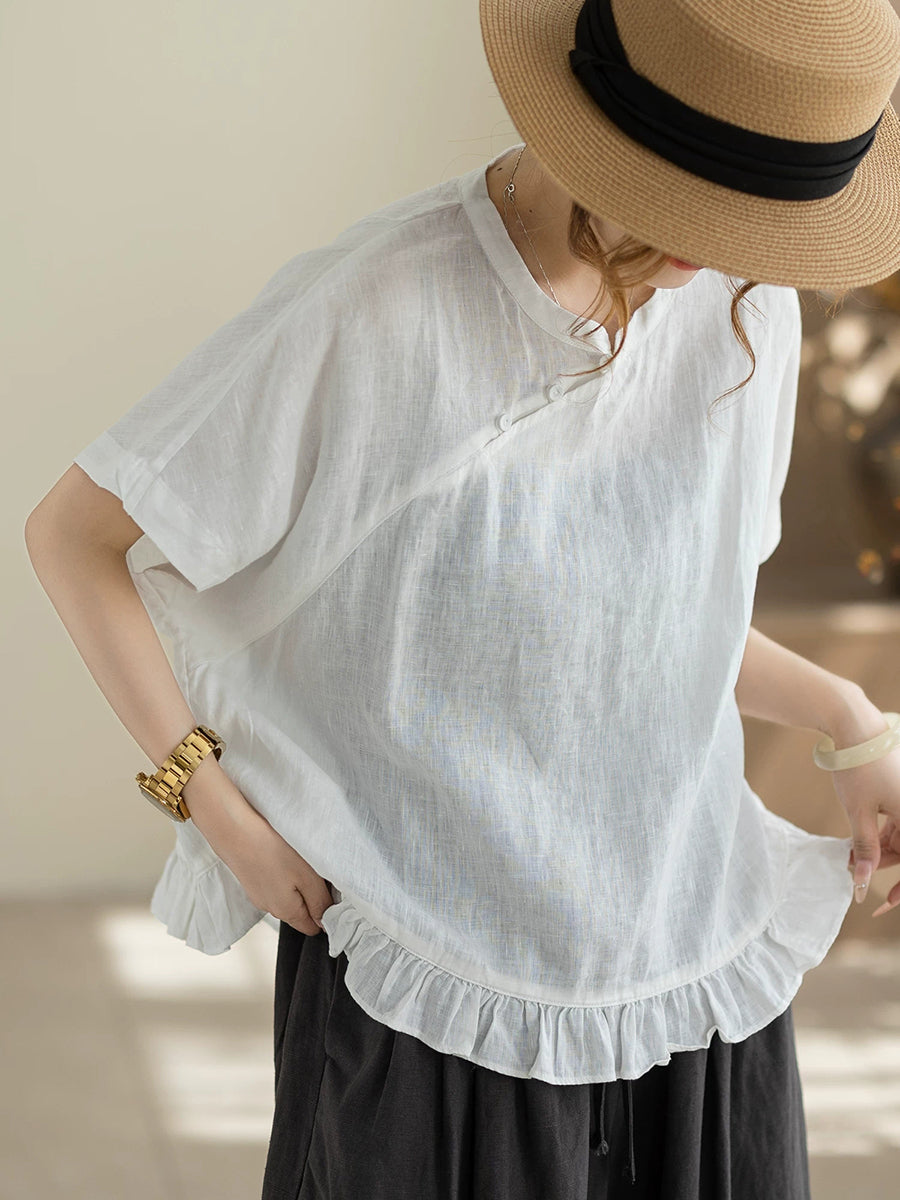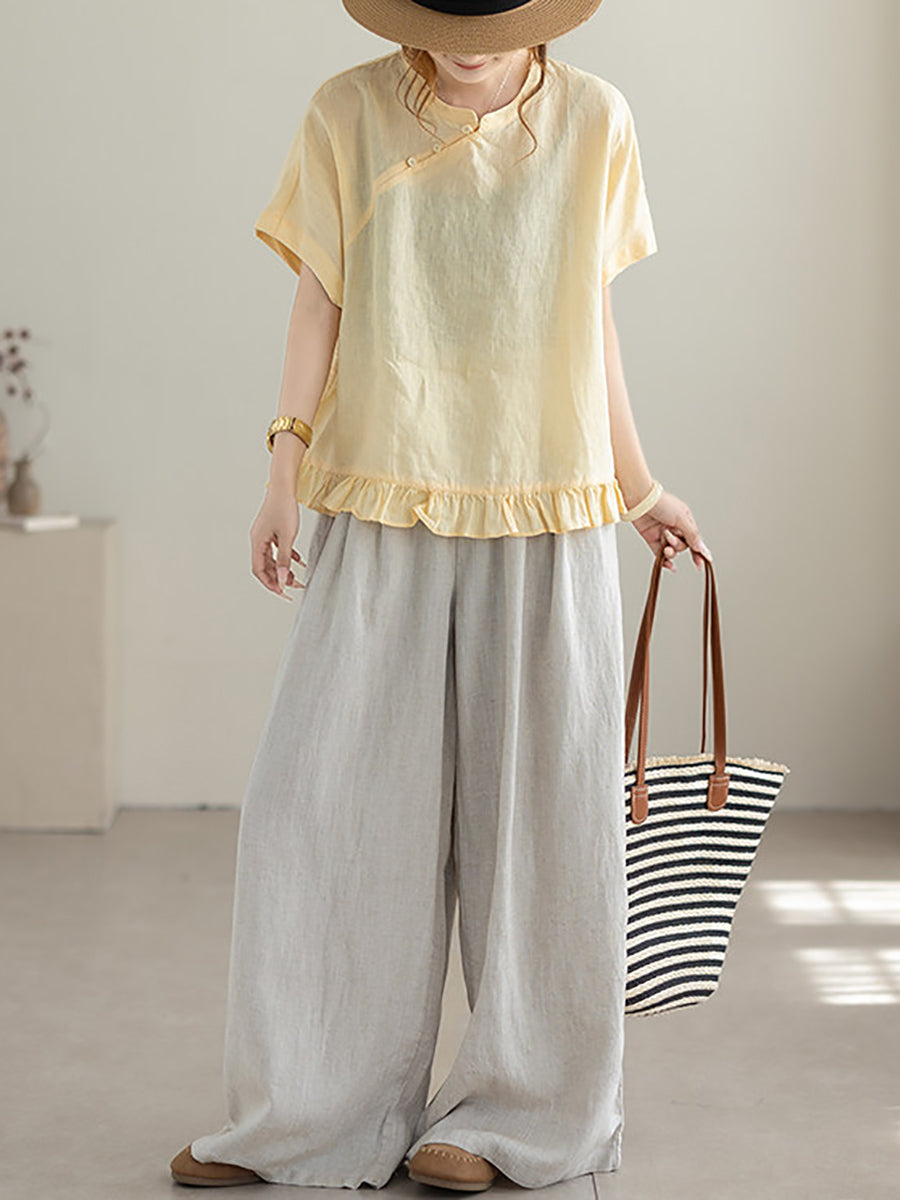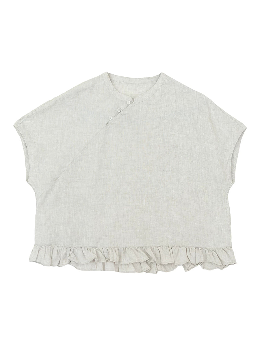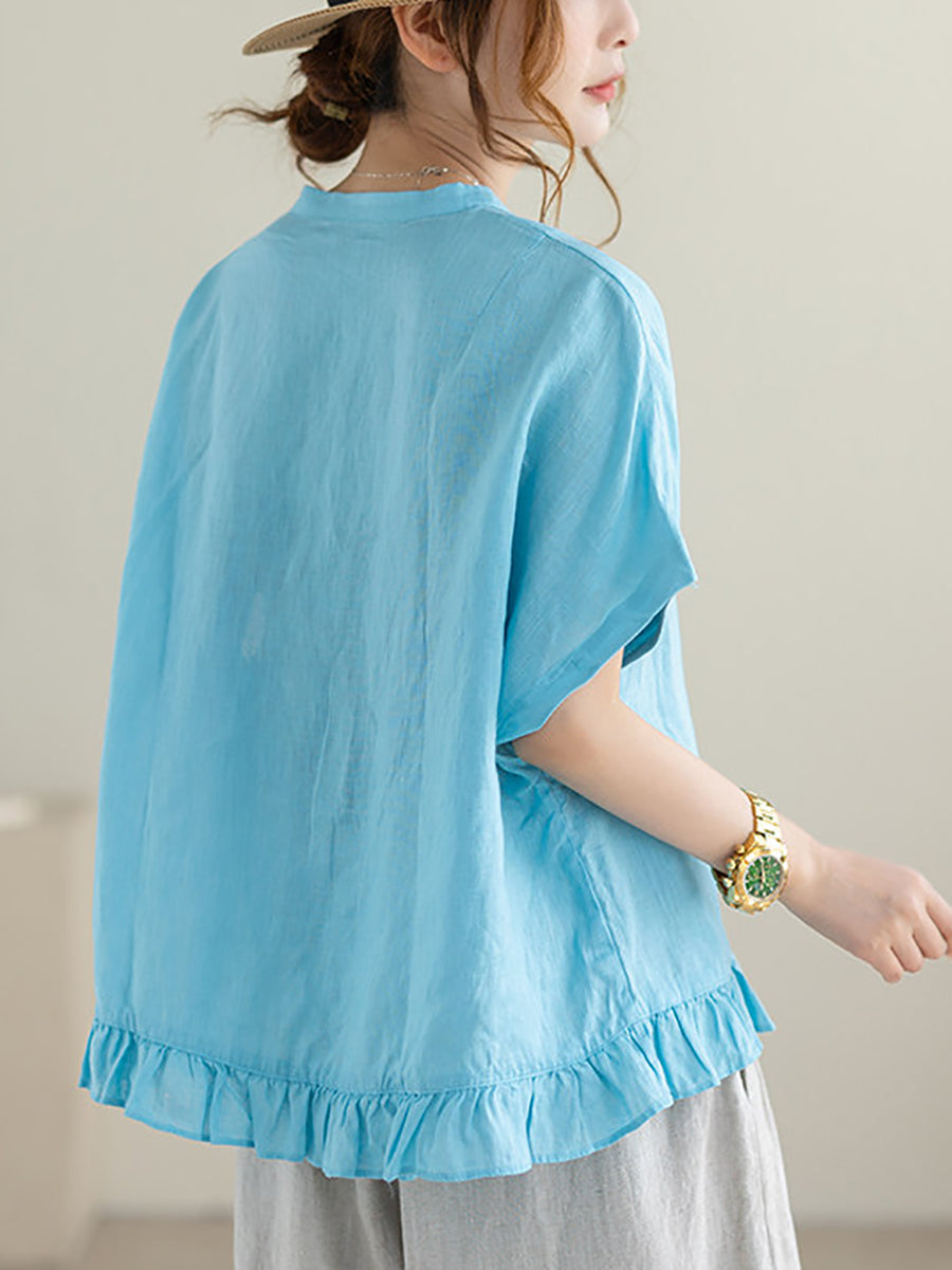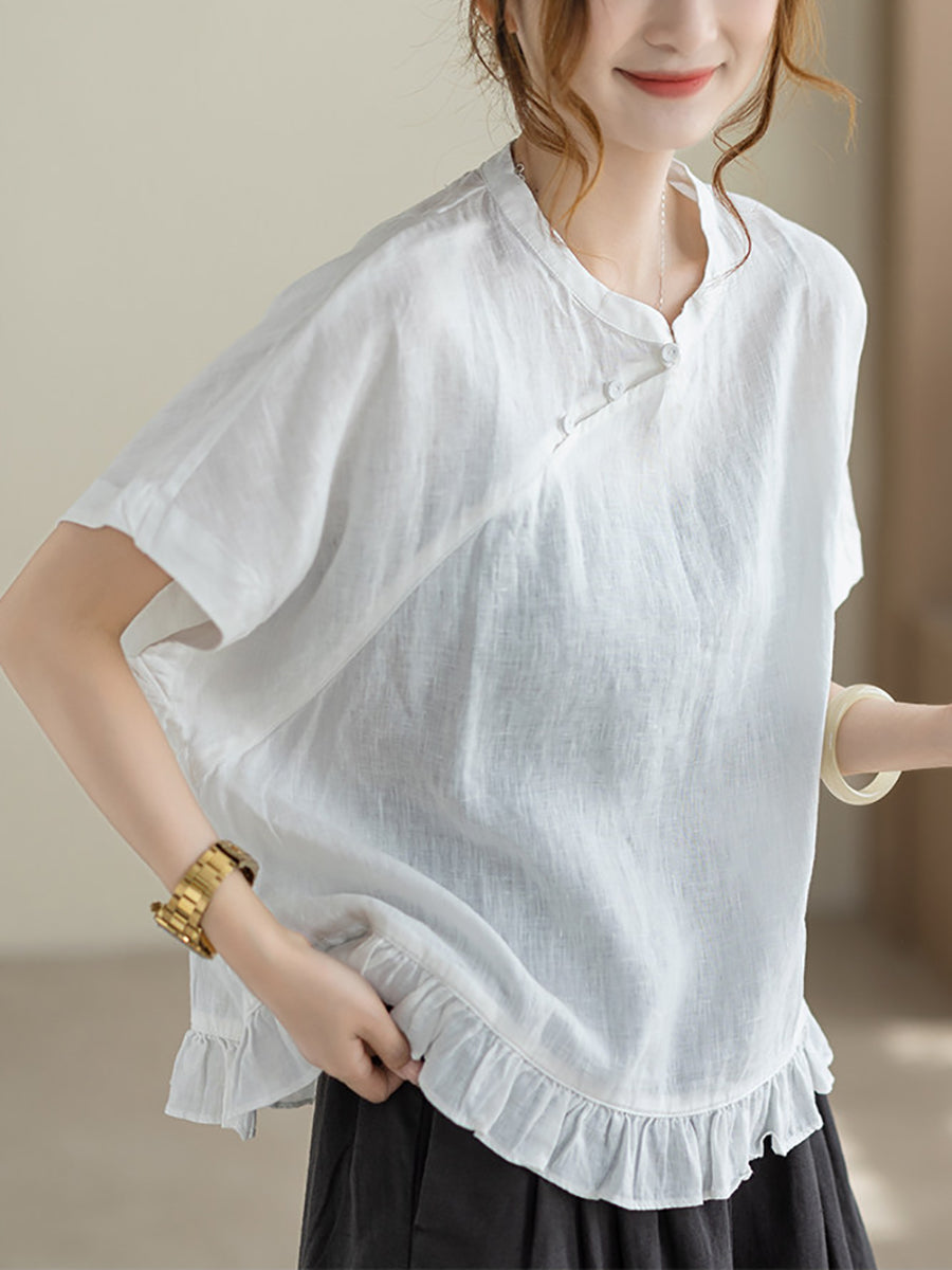 Damen Sommerbluse im Ethno-Stil, einfarbig, mit Stehkragen, 100% Leinen