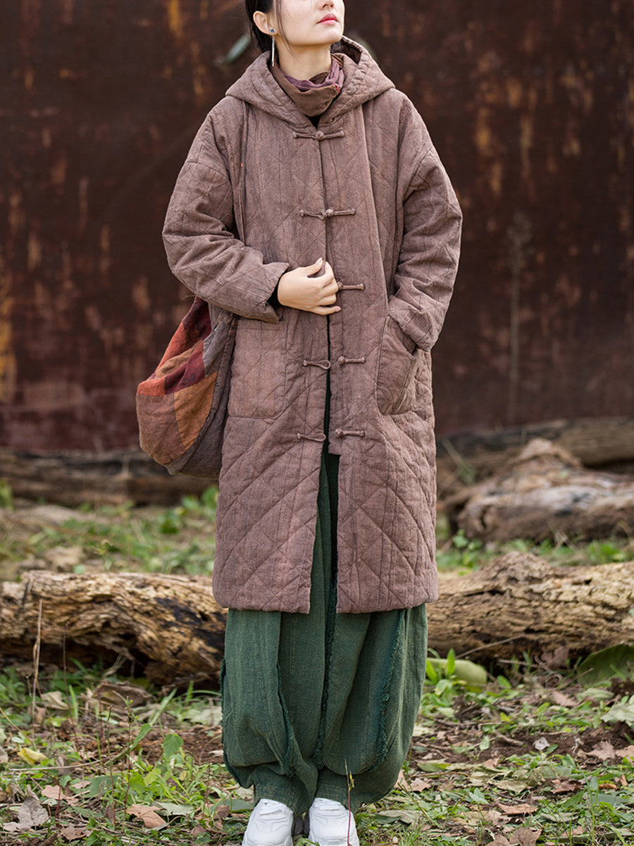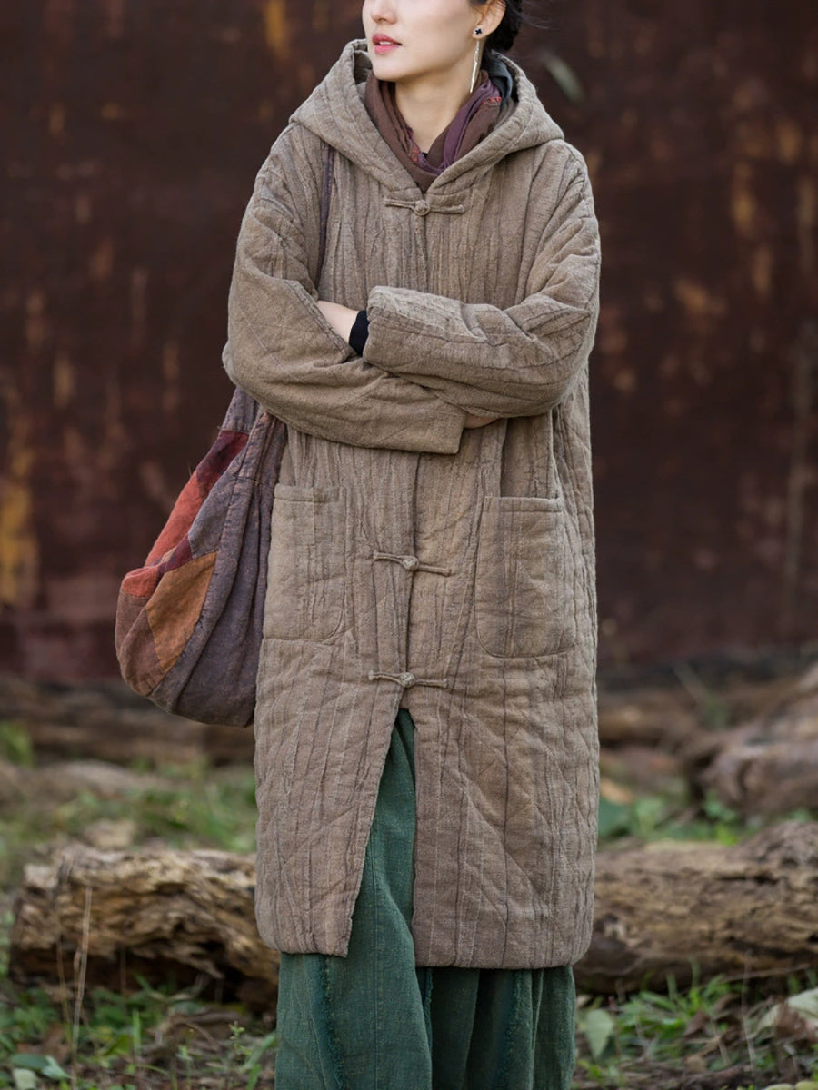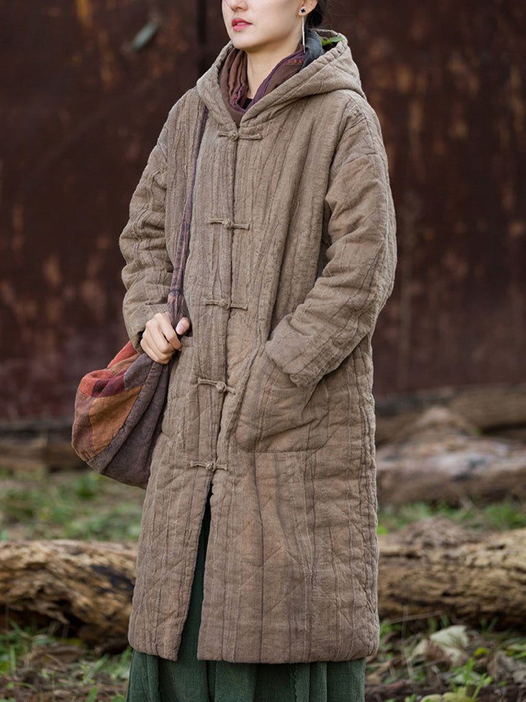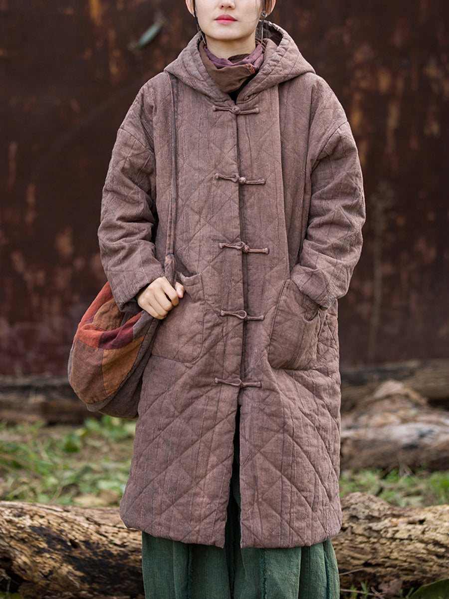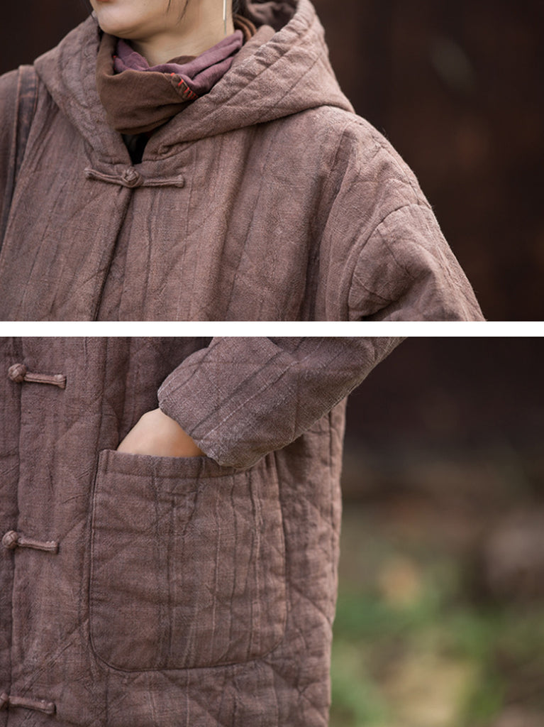 Damen Winter Retro Reiner Farb Ramie Wattierter Kapuzenmantel