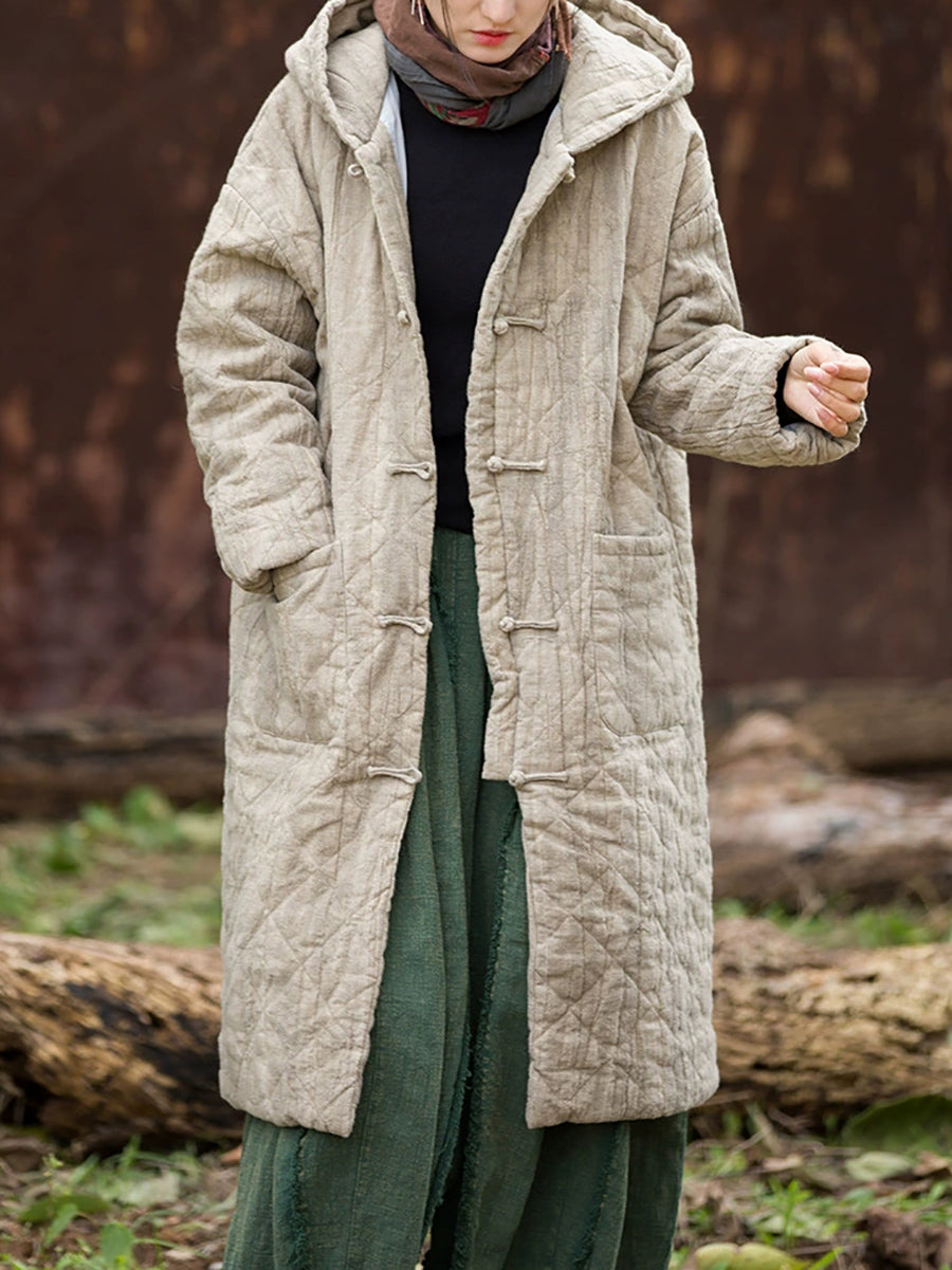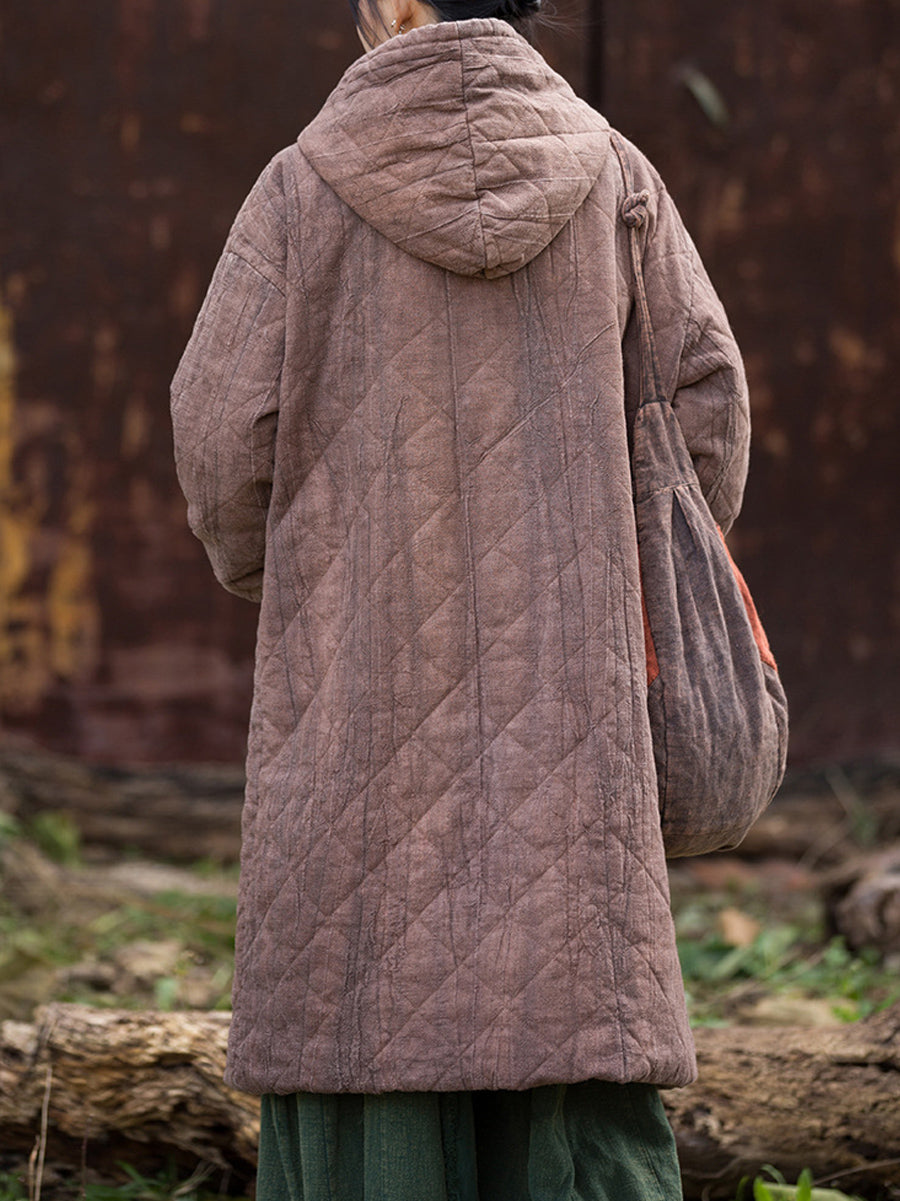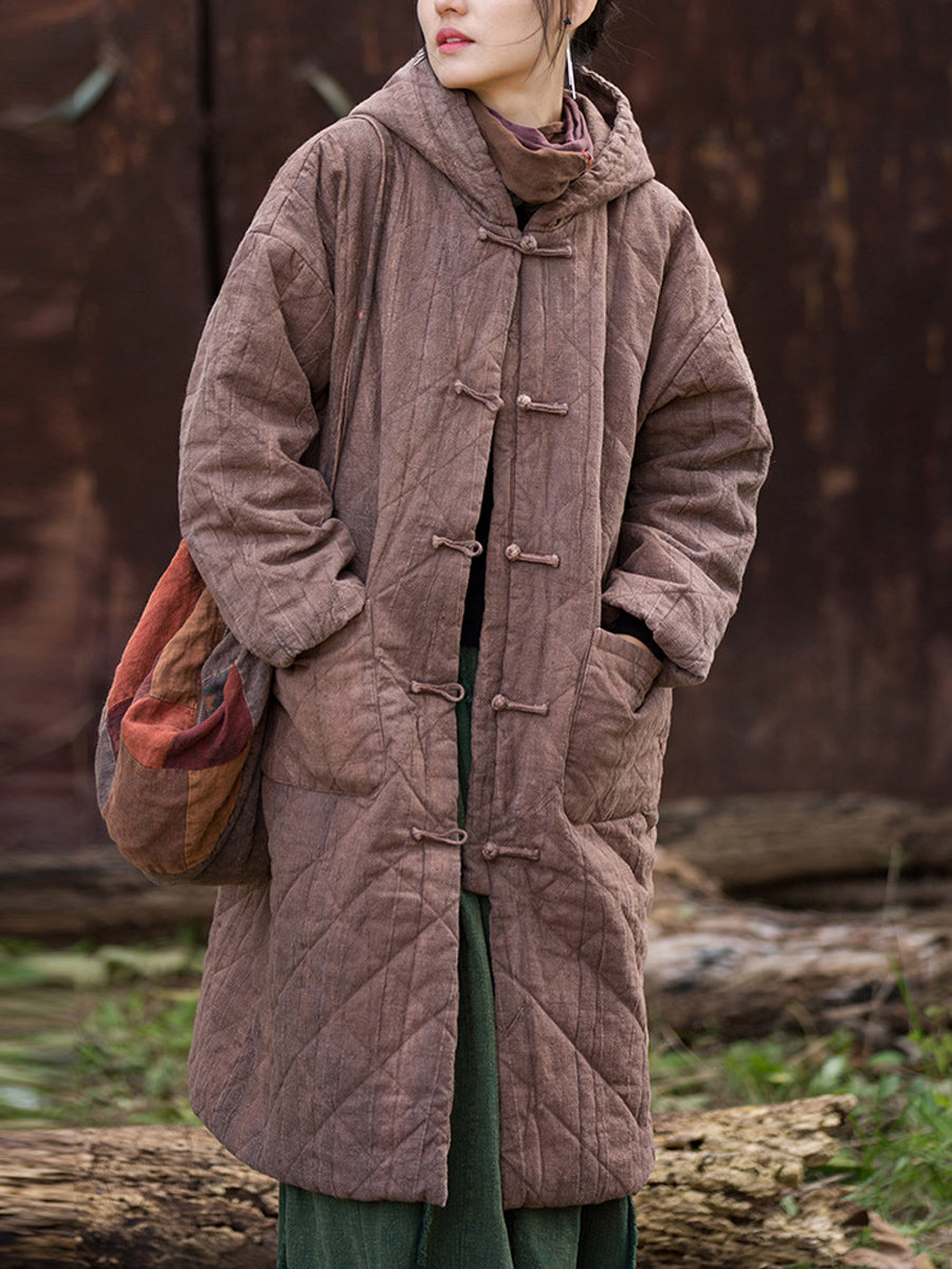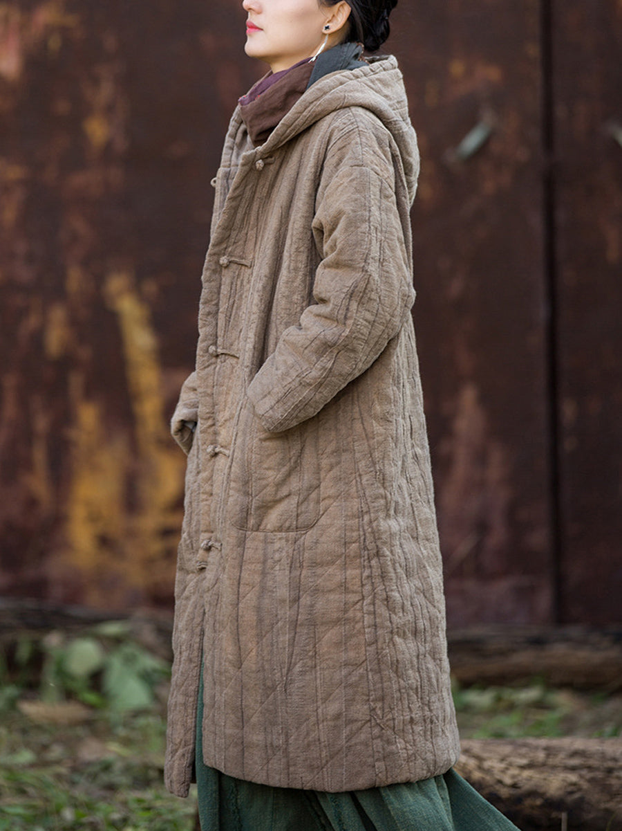 Damen Winter Retro Reiner Farb Ramie Wattierter Kapuzenmantel