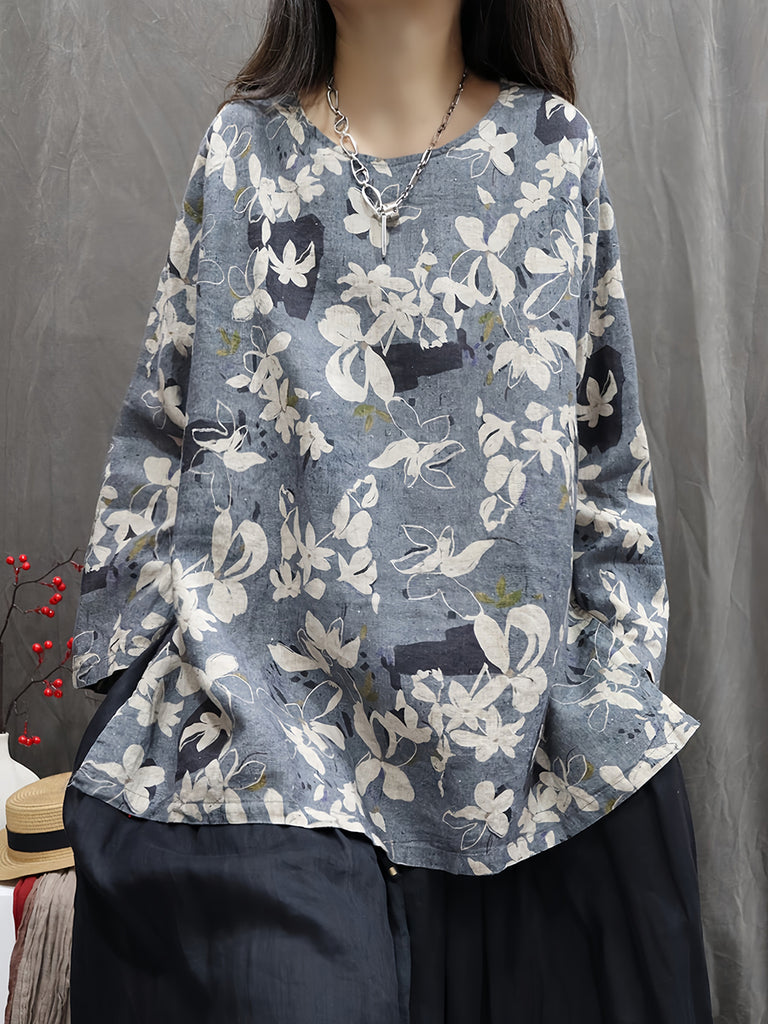 Damen Herbst Vintage Blume 100% Leinen O-Ausschnitt Shirt
