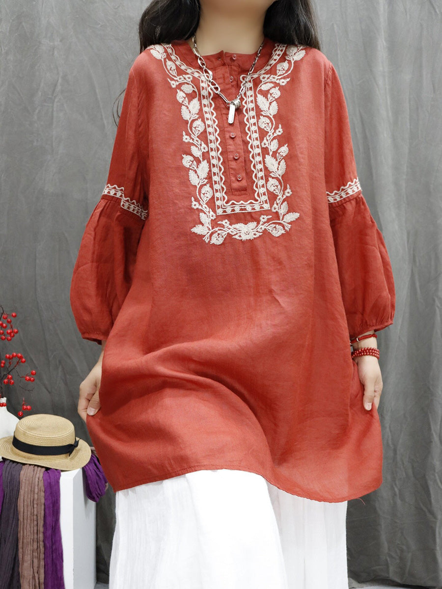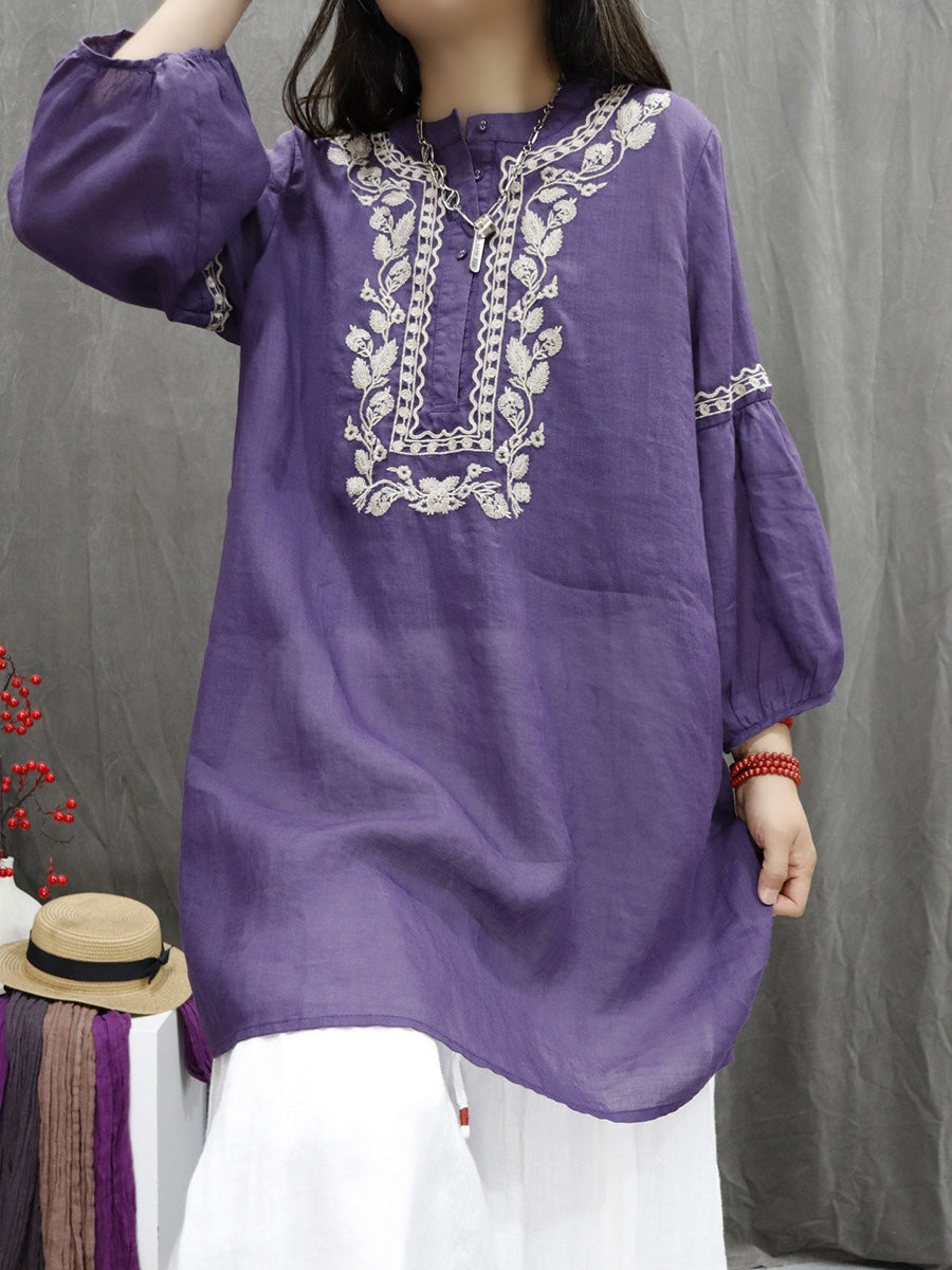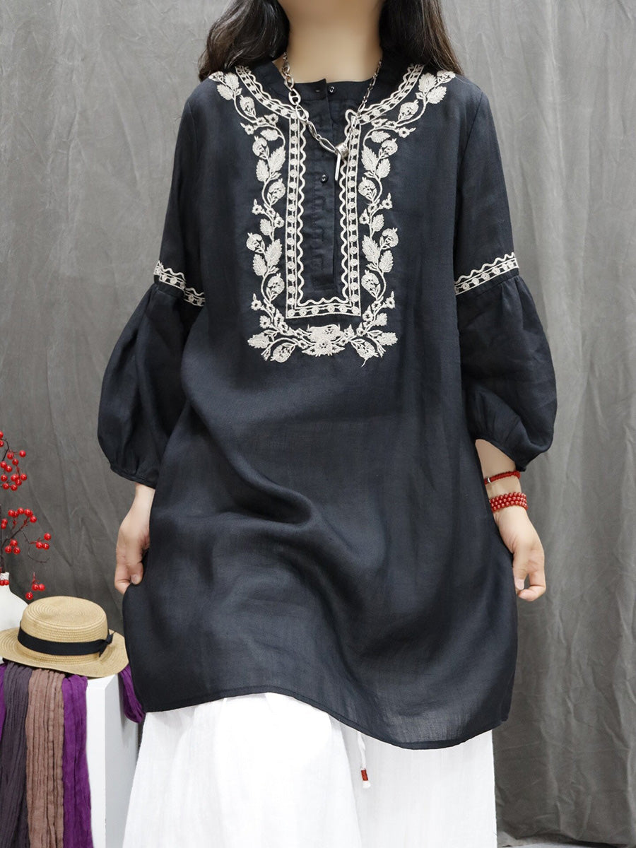Damen-Frühlingsbluse mit kunstvoller Blumenstickerei aus 100 % Ramie, Rundhalsausschnitt