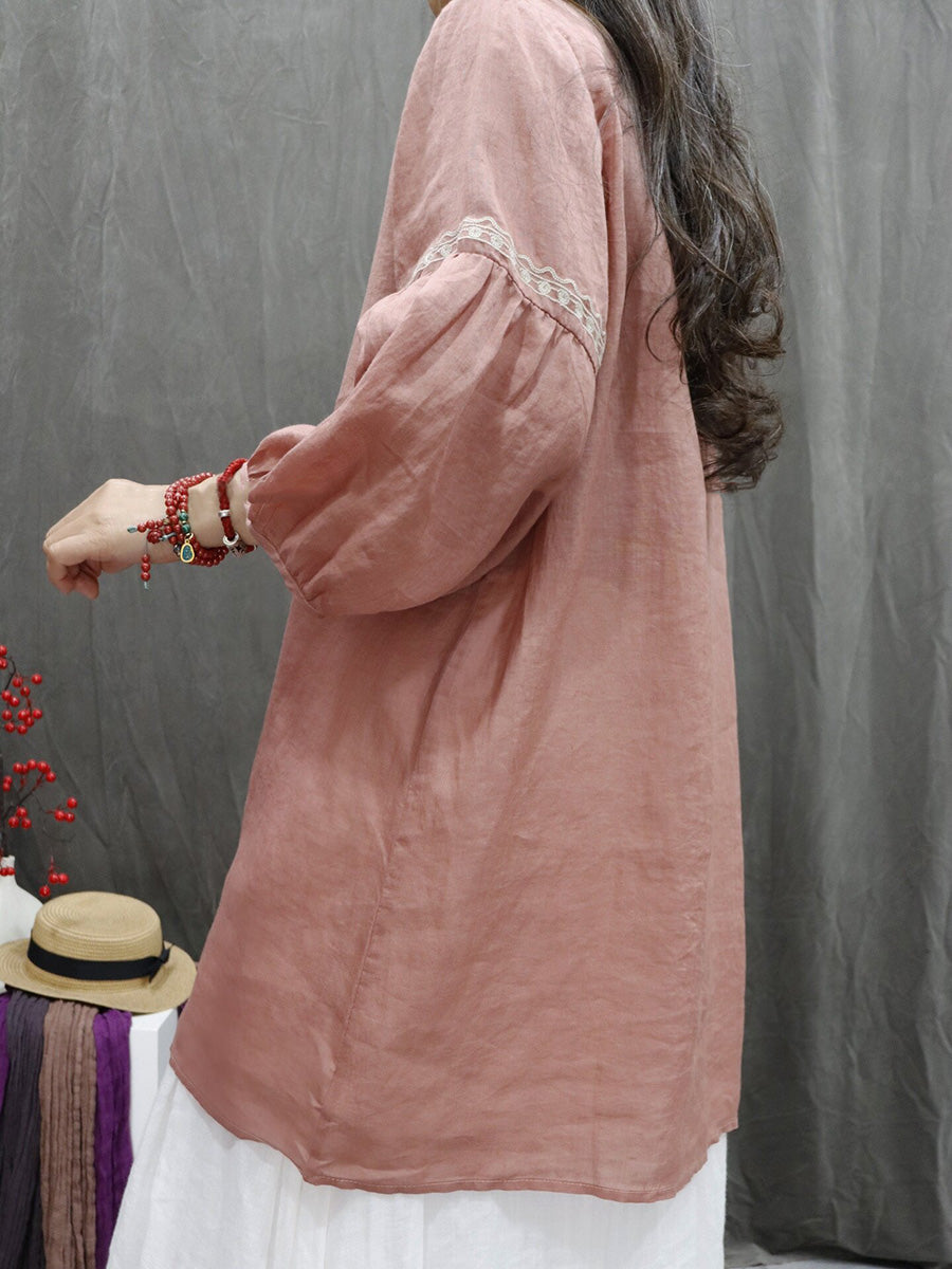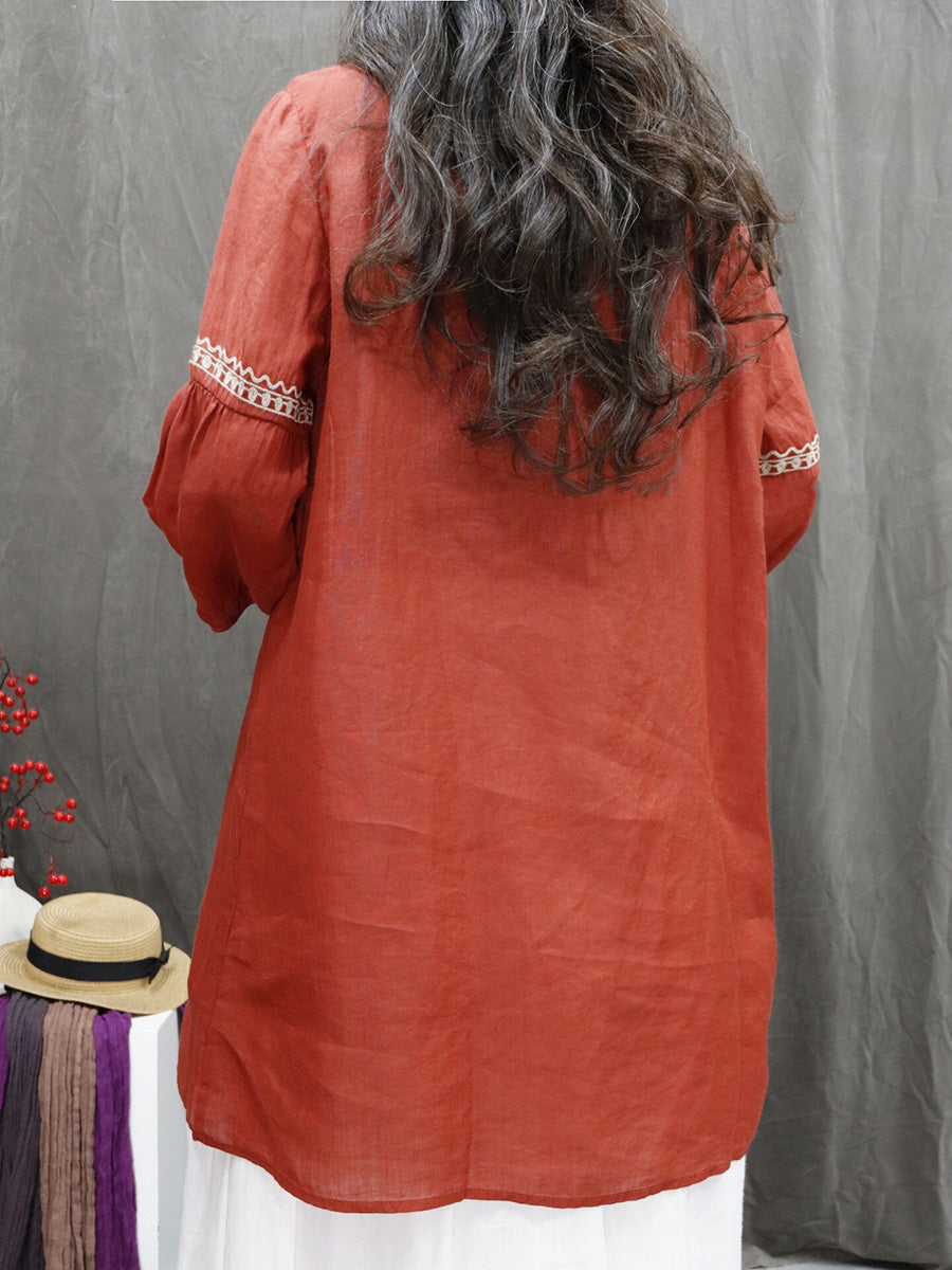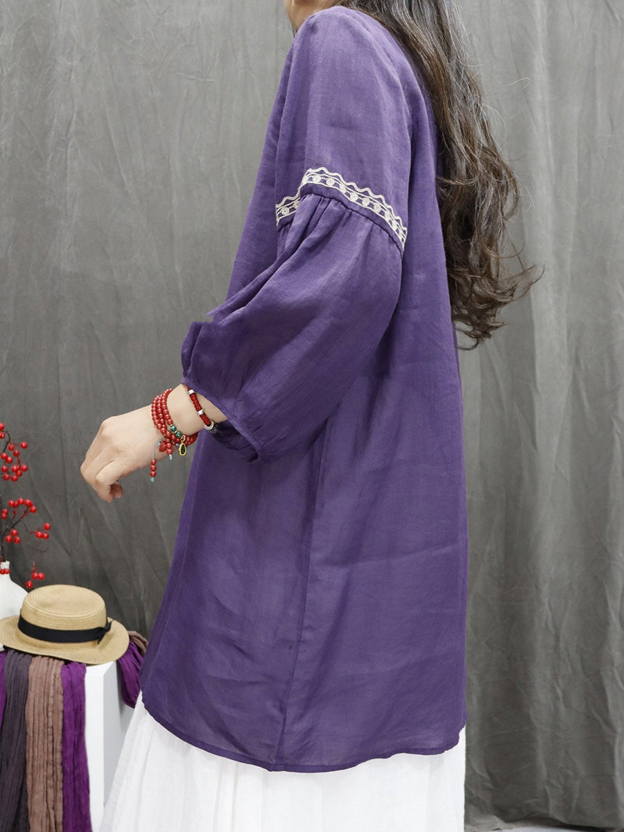 Damen-Frühlingsbluse mit kunstvoller Blumenstickerei aus 100 % Ramie, Rundhalsausschnitt