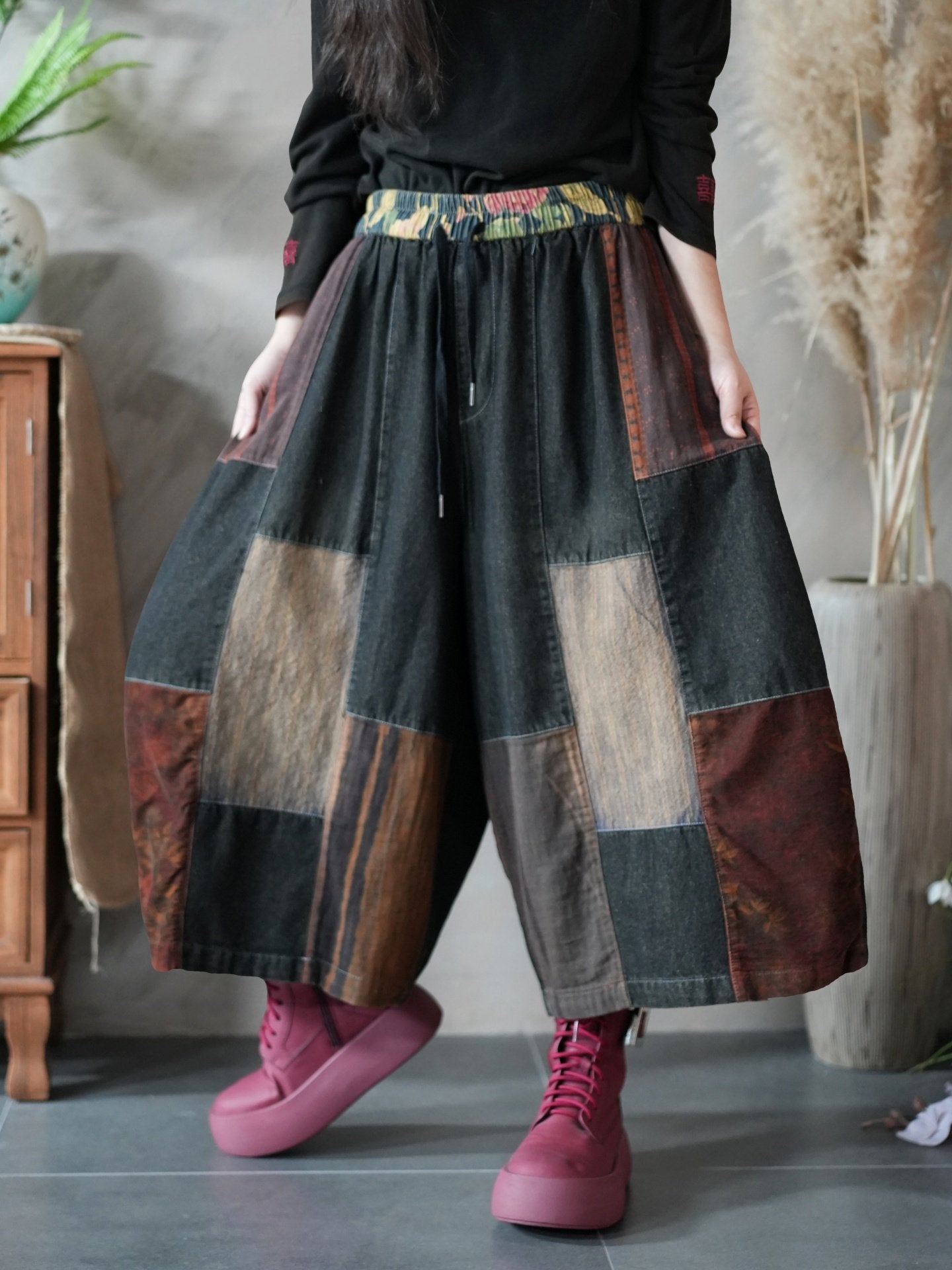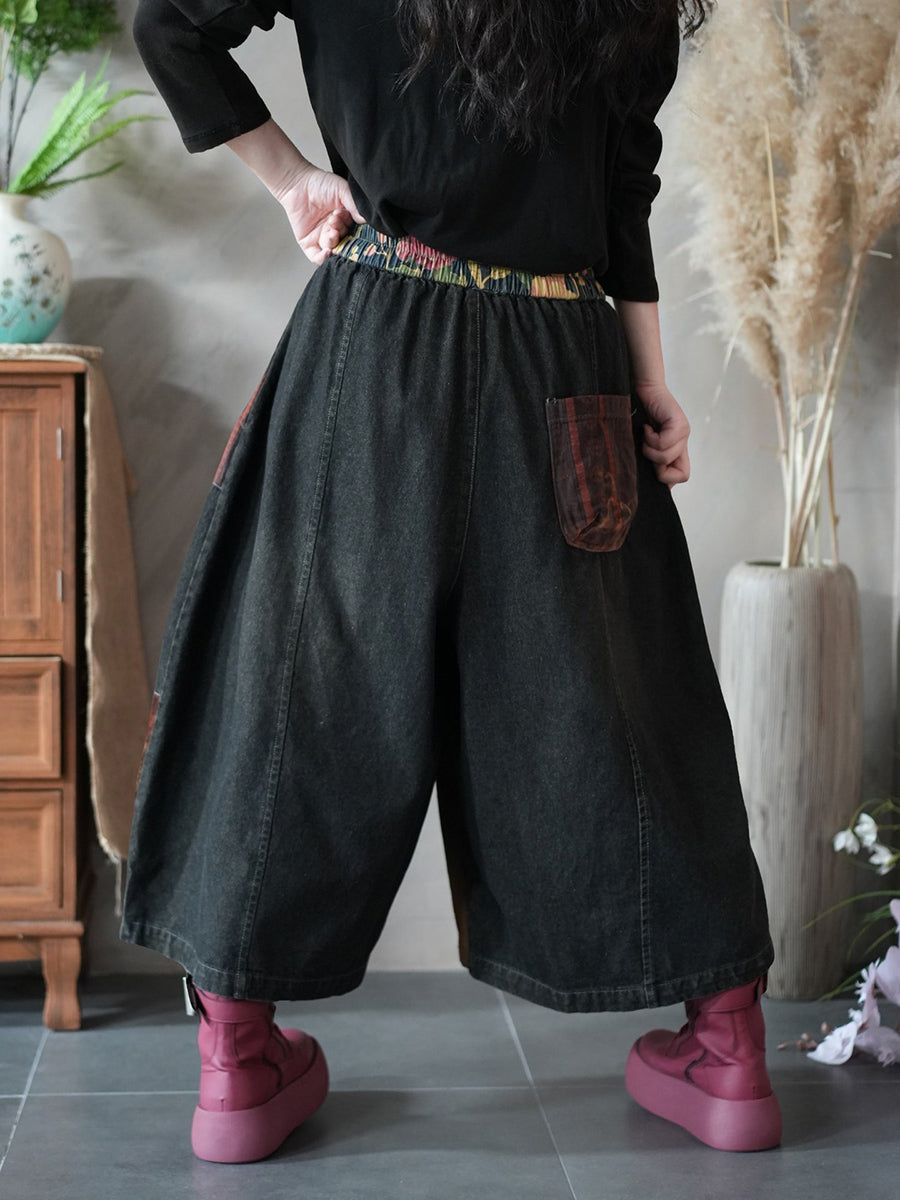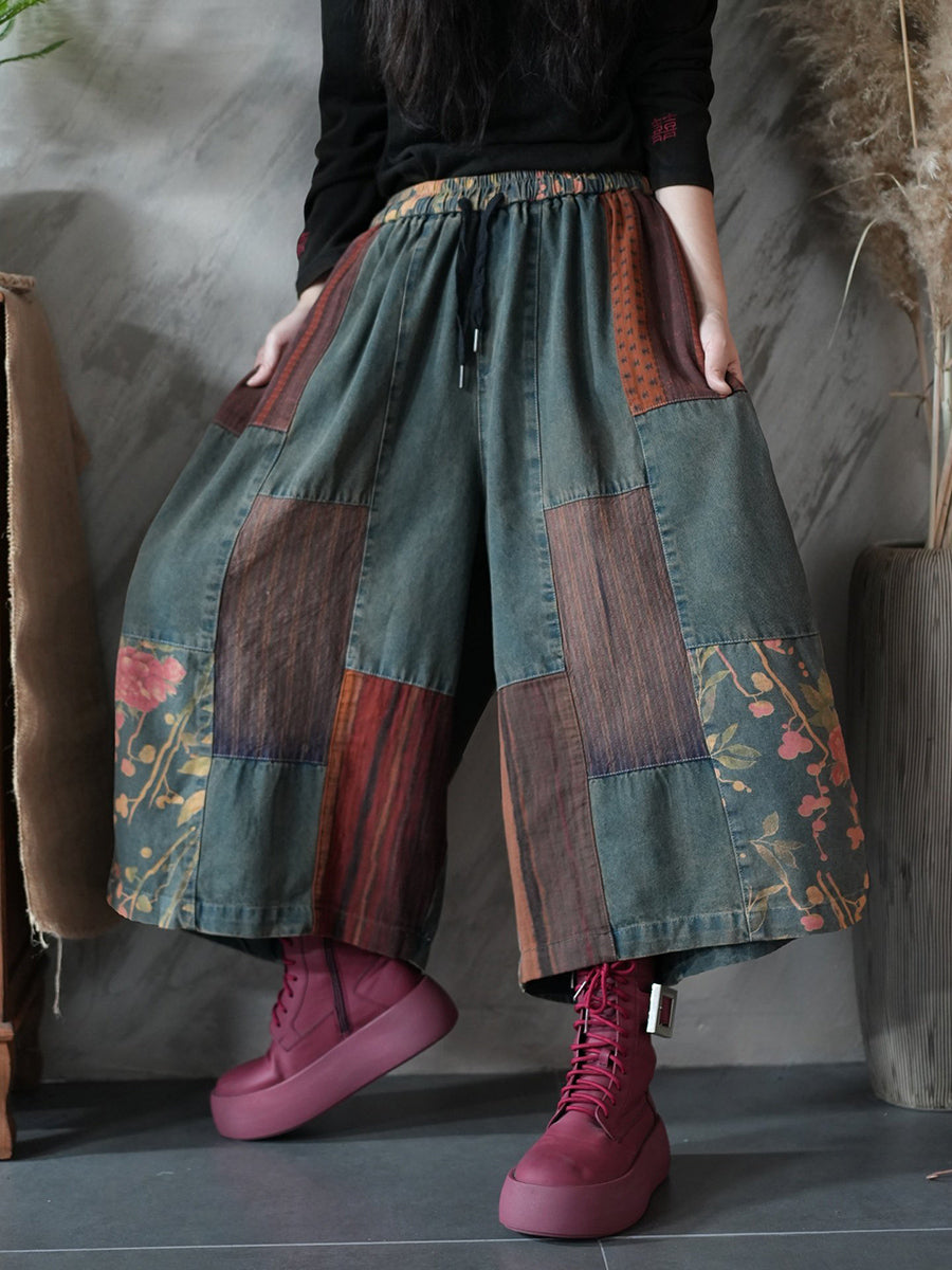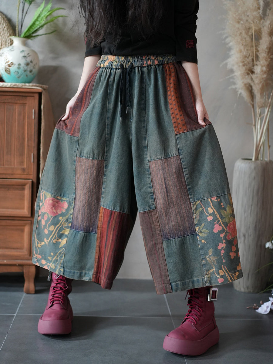 Damen Frühlingshose im Vintage-Patchwork-Stil mit weitem Bein