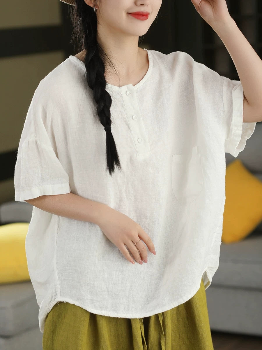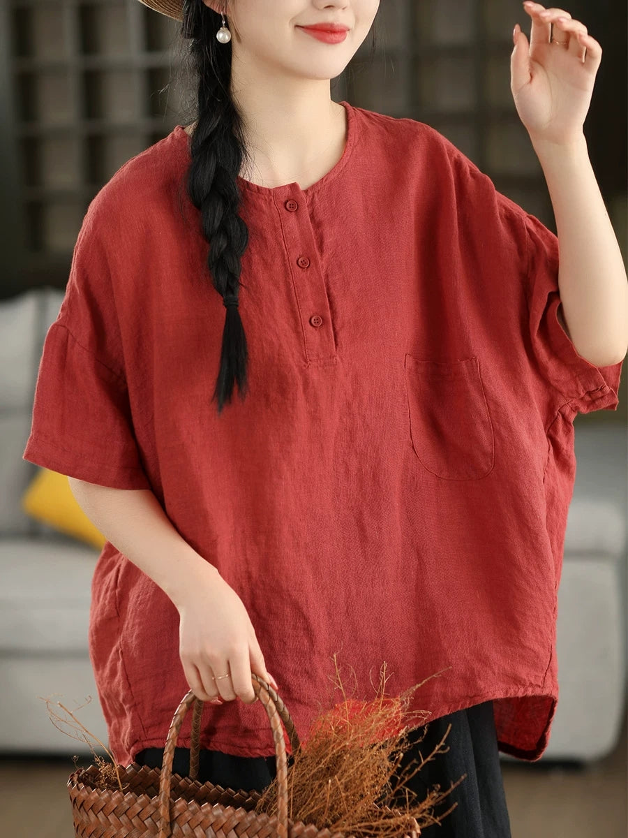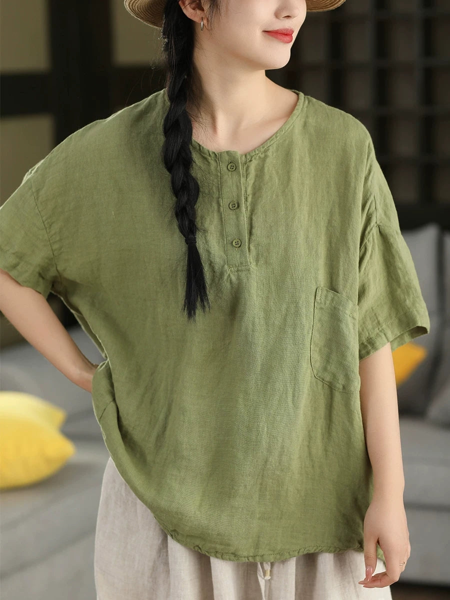 Sommerbluse für Damen, künstlerisch, einfarbig, 100 % Leinen, Rundhalsausschnitt