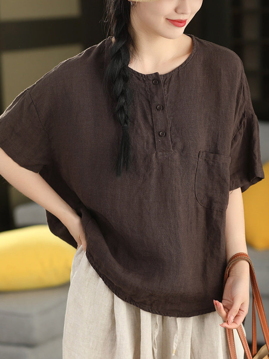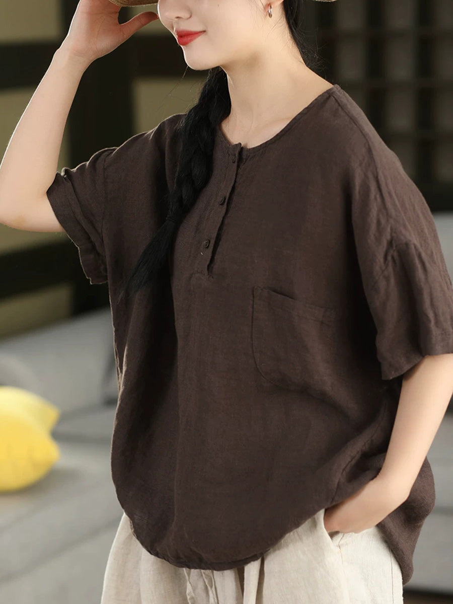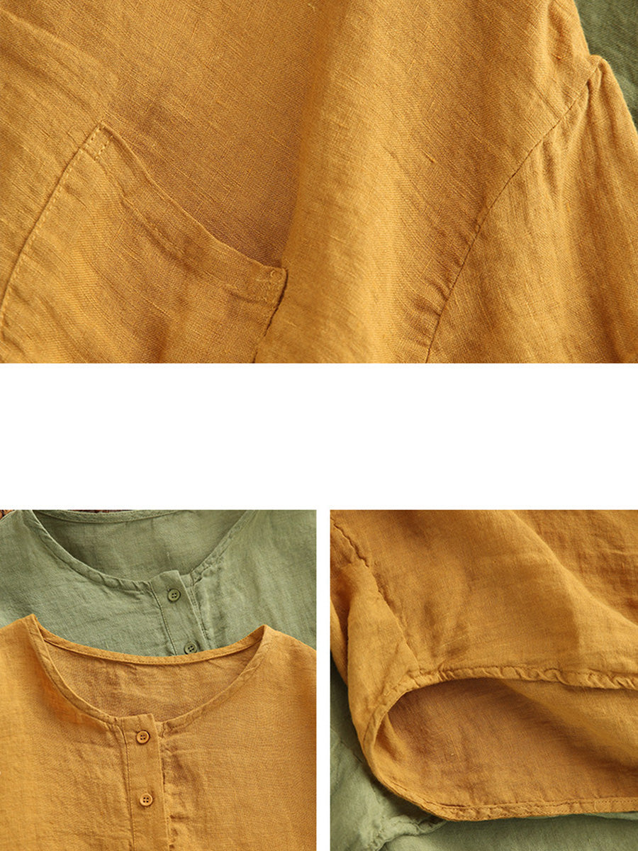Sommerbluse für Damen, künstlerisch, einfarbig, 100 % Leinen, Rundhalsausschnitt