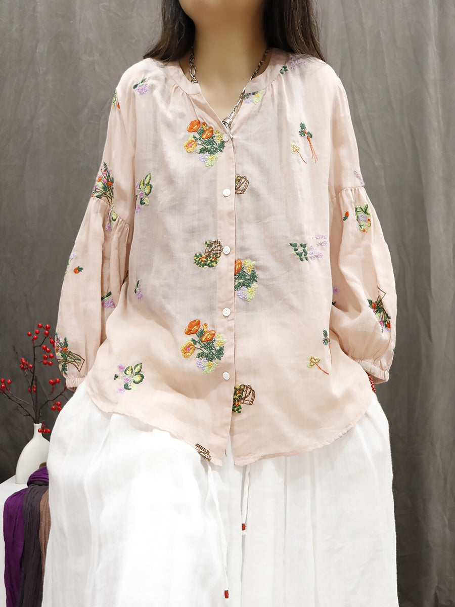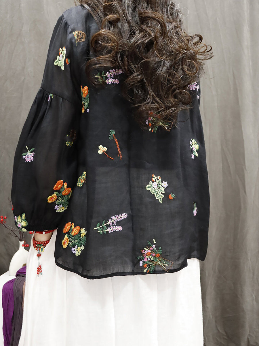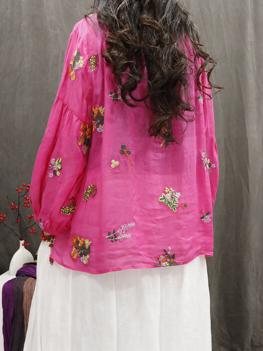 Damen-Sommerbluse mit Blumenstickerei, 100 % Ramie, V-Ausschnitt
