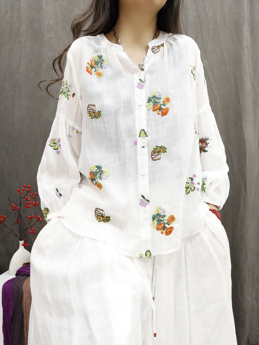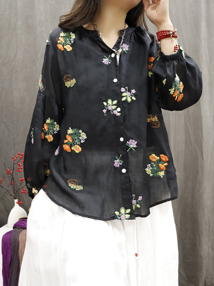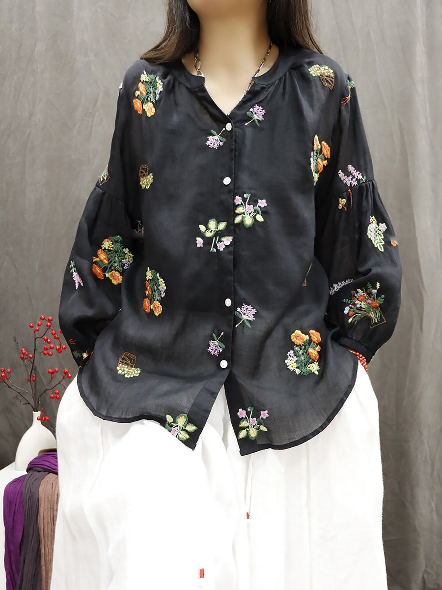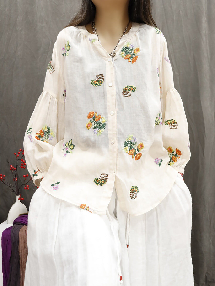 Damen-Sommerbluse mit Blumenstickerei, 100 % Ramie, V-Ausschnitt