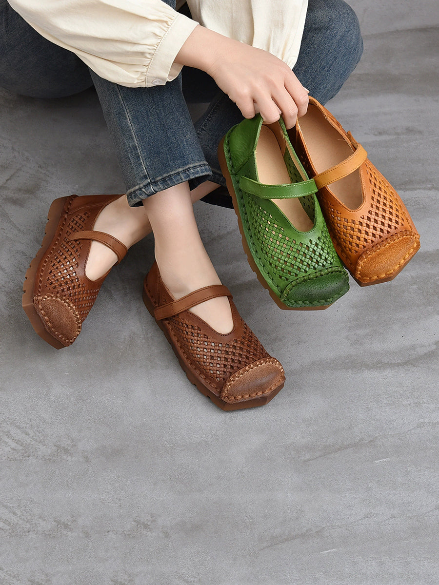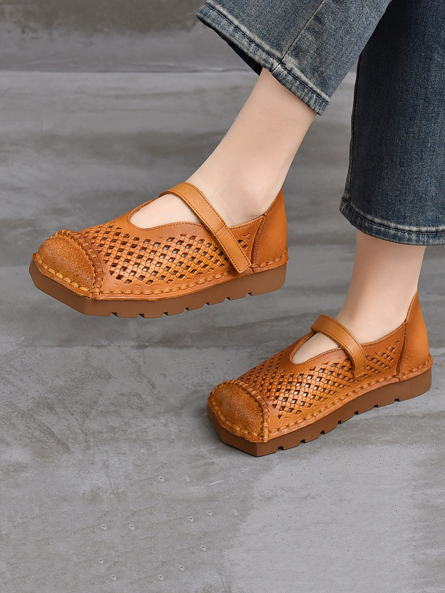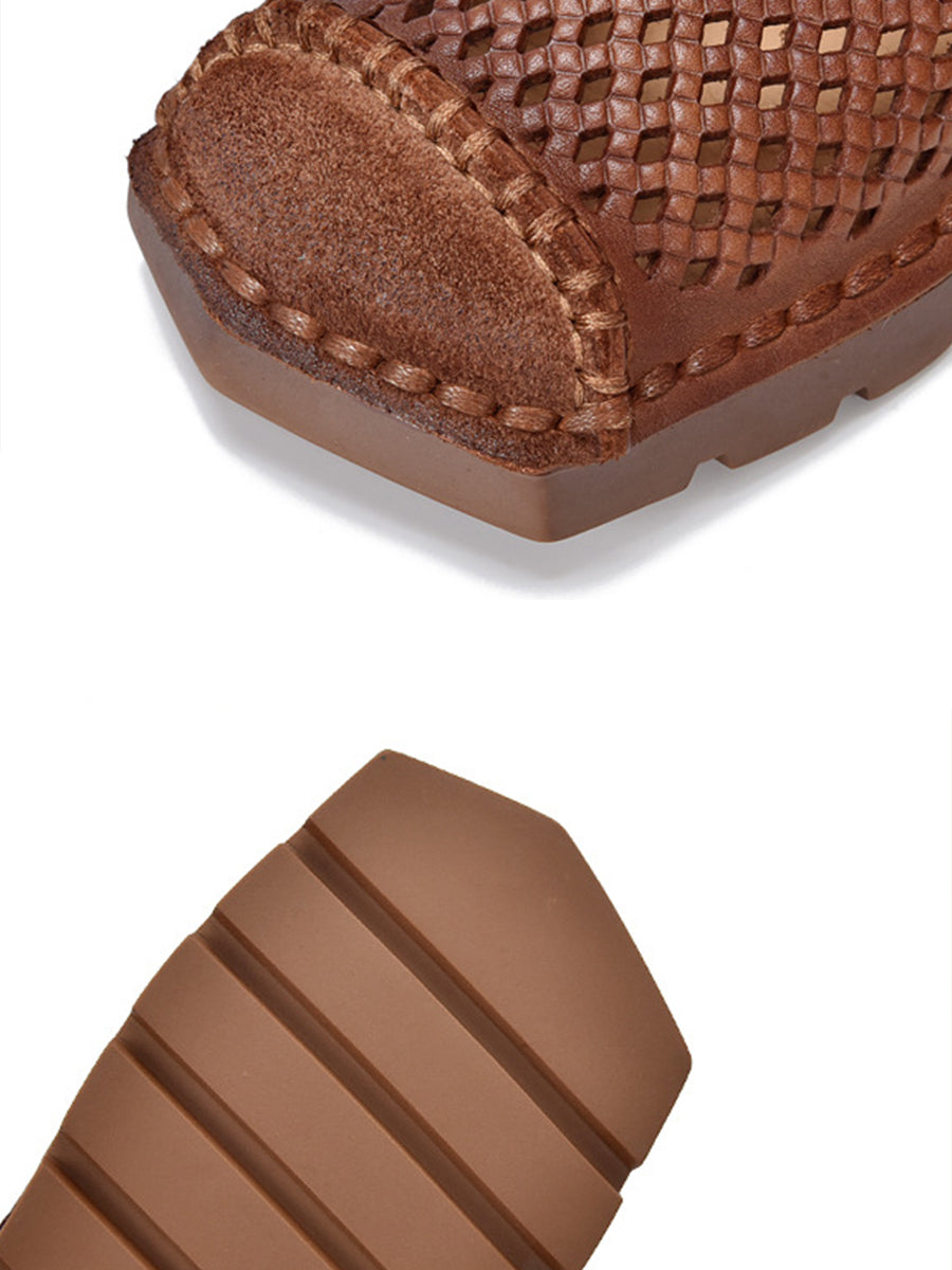 Damen Sommer Vintage Echtleder Sandalen mit Lochmuster