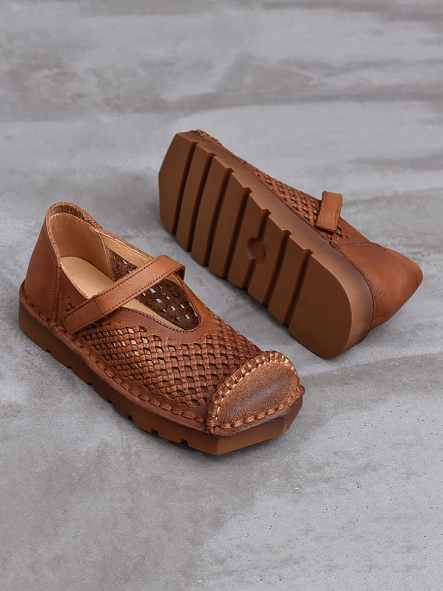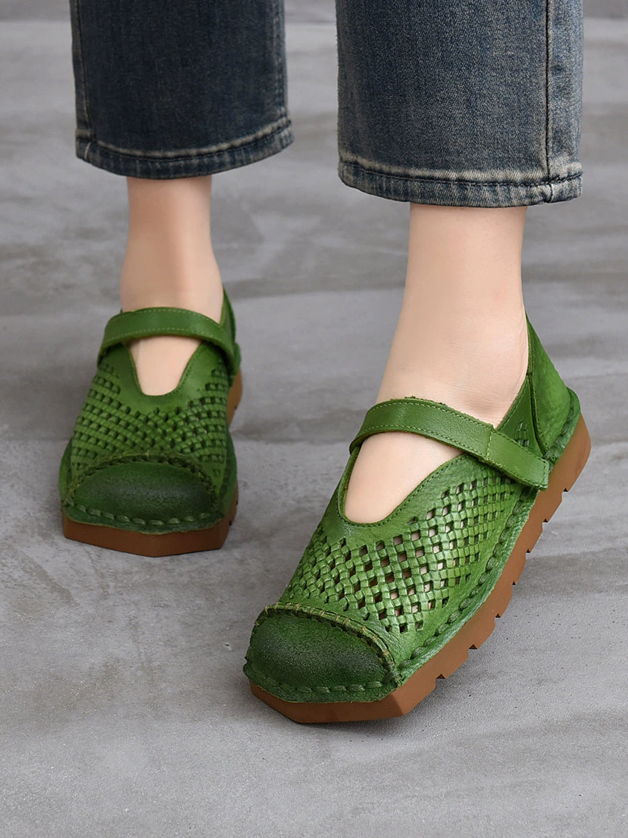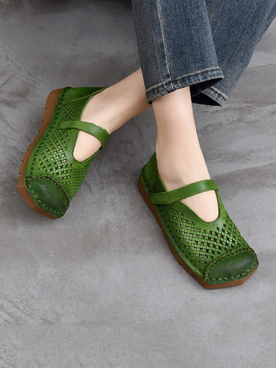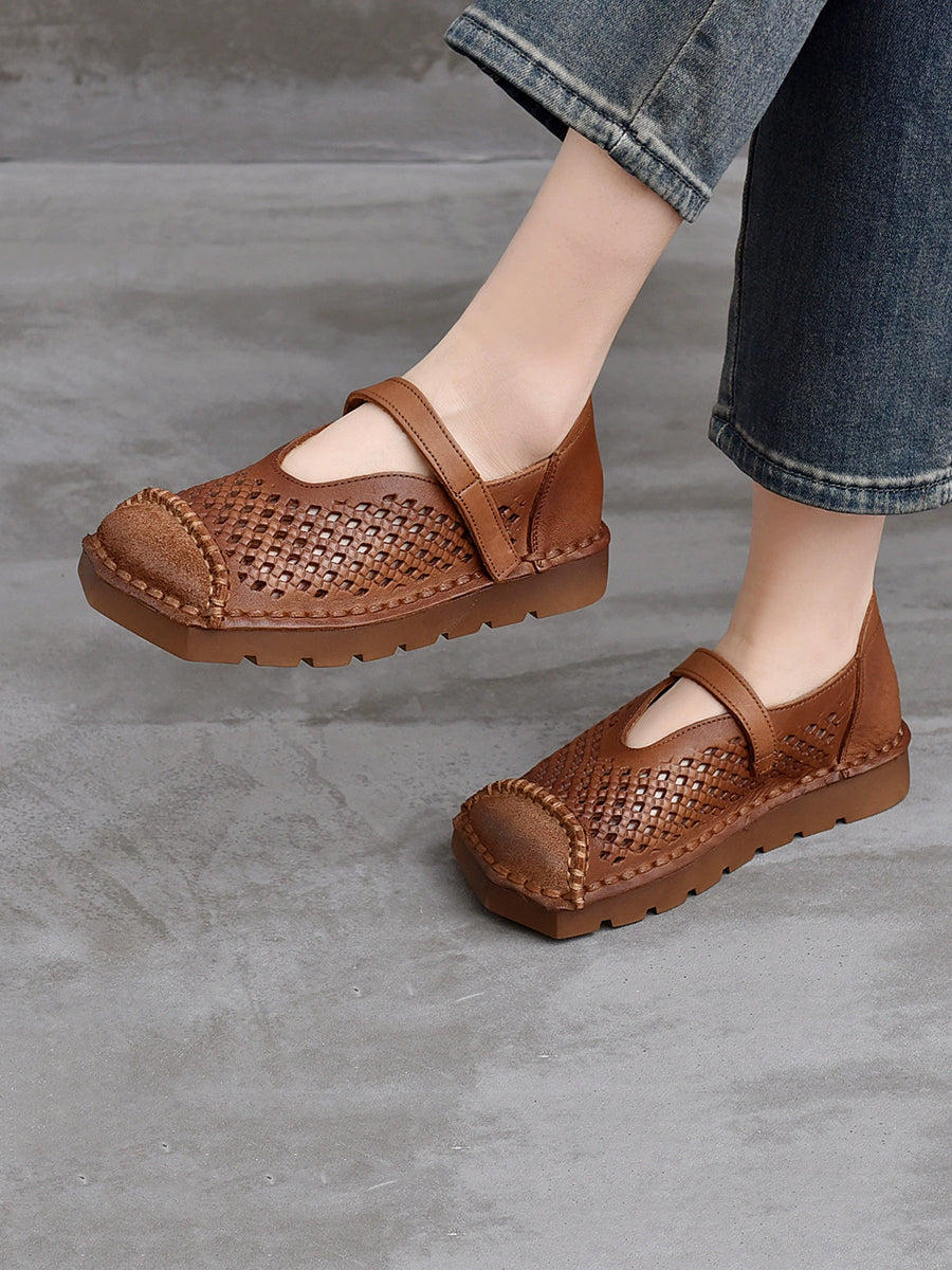Damen Sommer Vintage Echtleder Sandalen mit Lochmuster