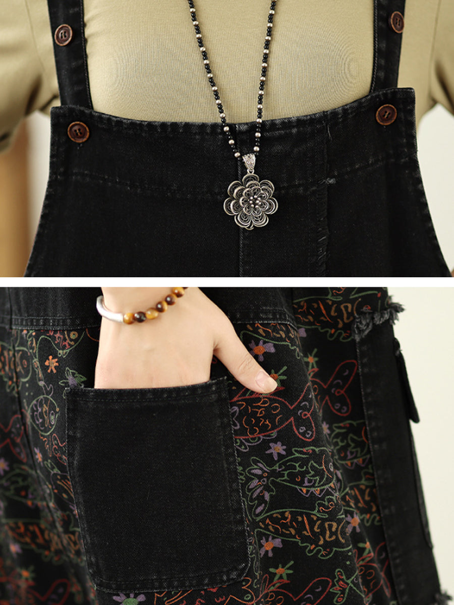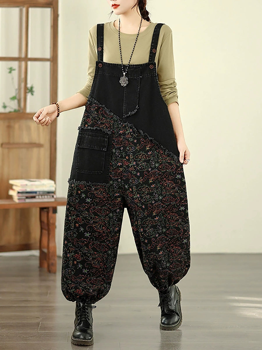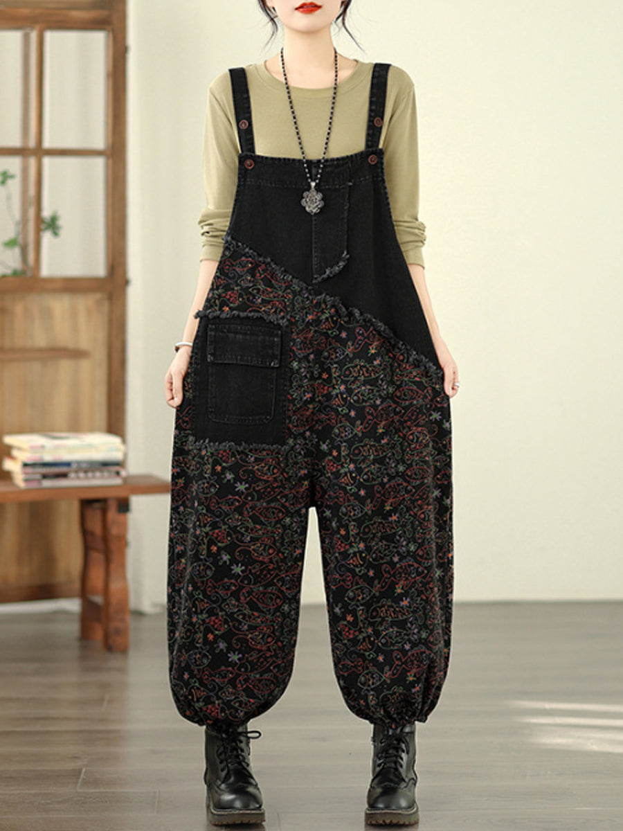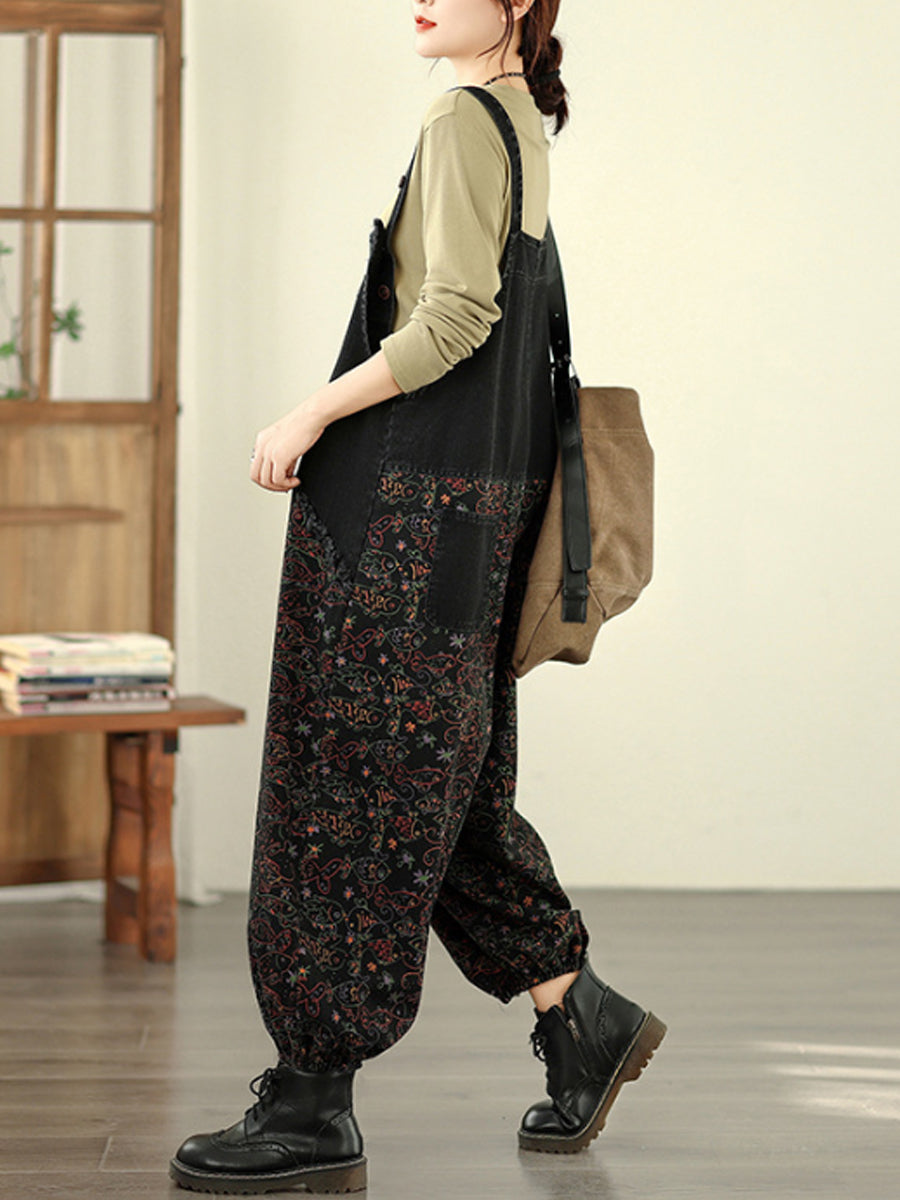 Damen Vintage Jumpsuit aus Baumwoll-Denim mit Blumenmuster und lockerer Passform