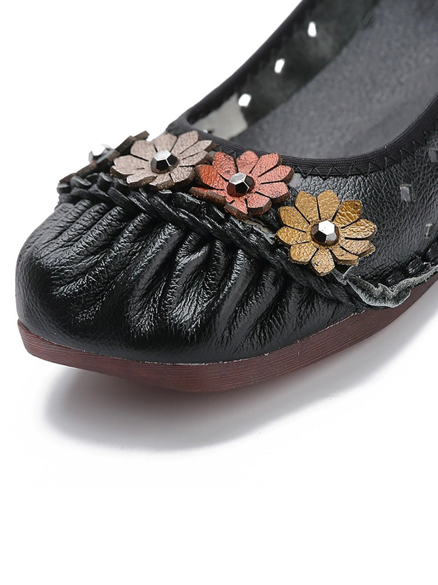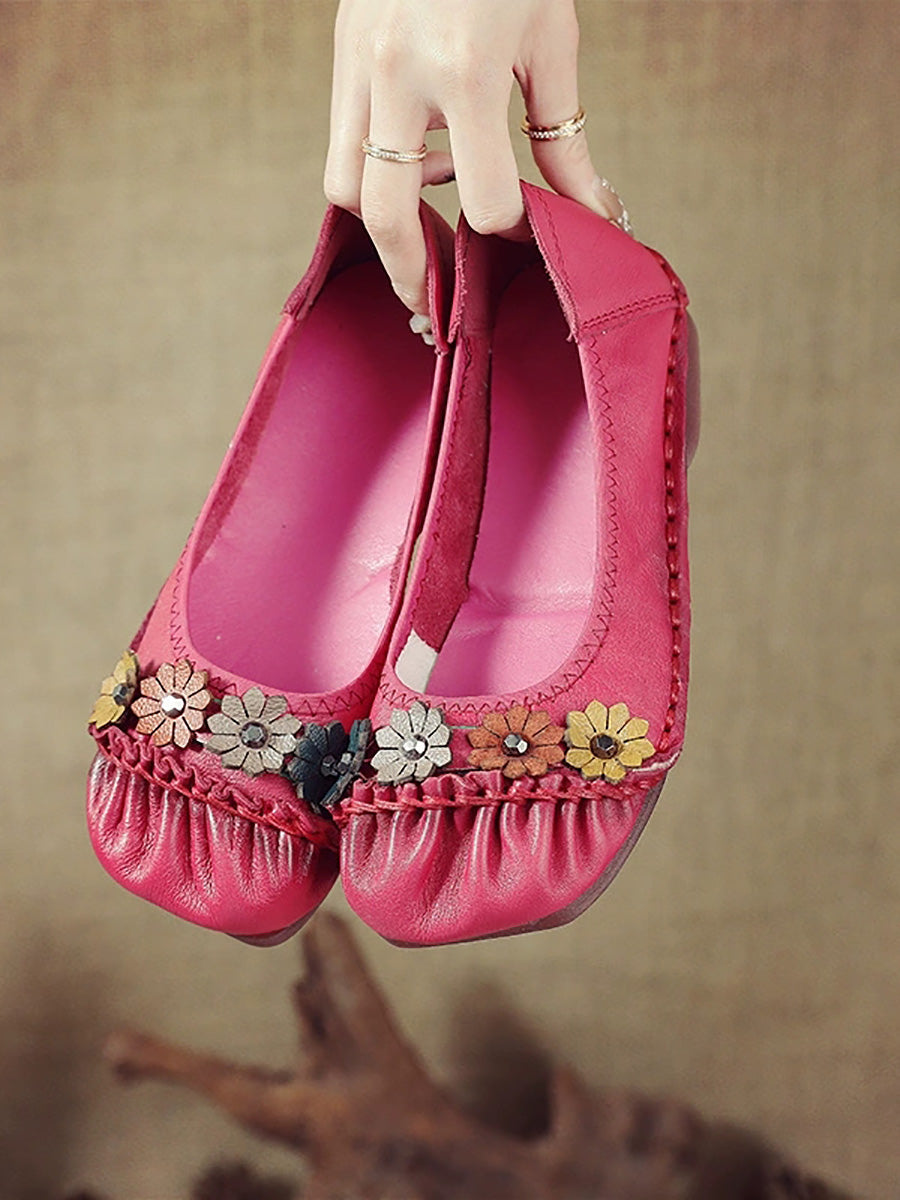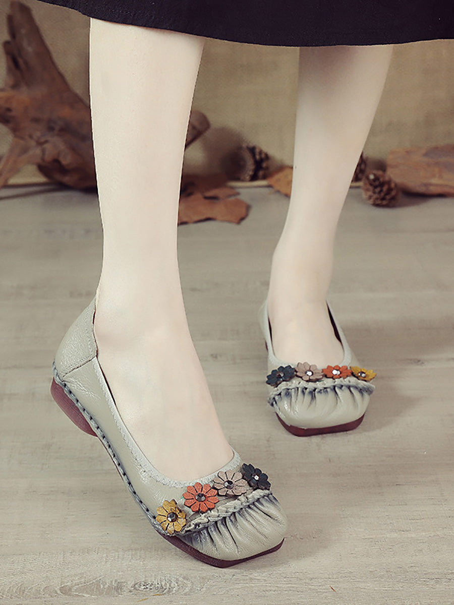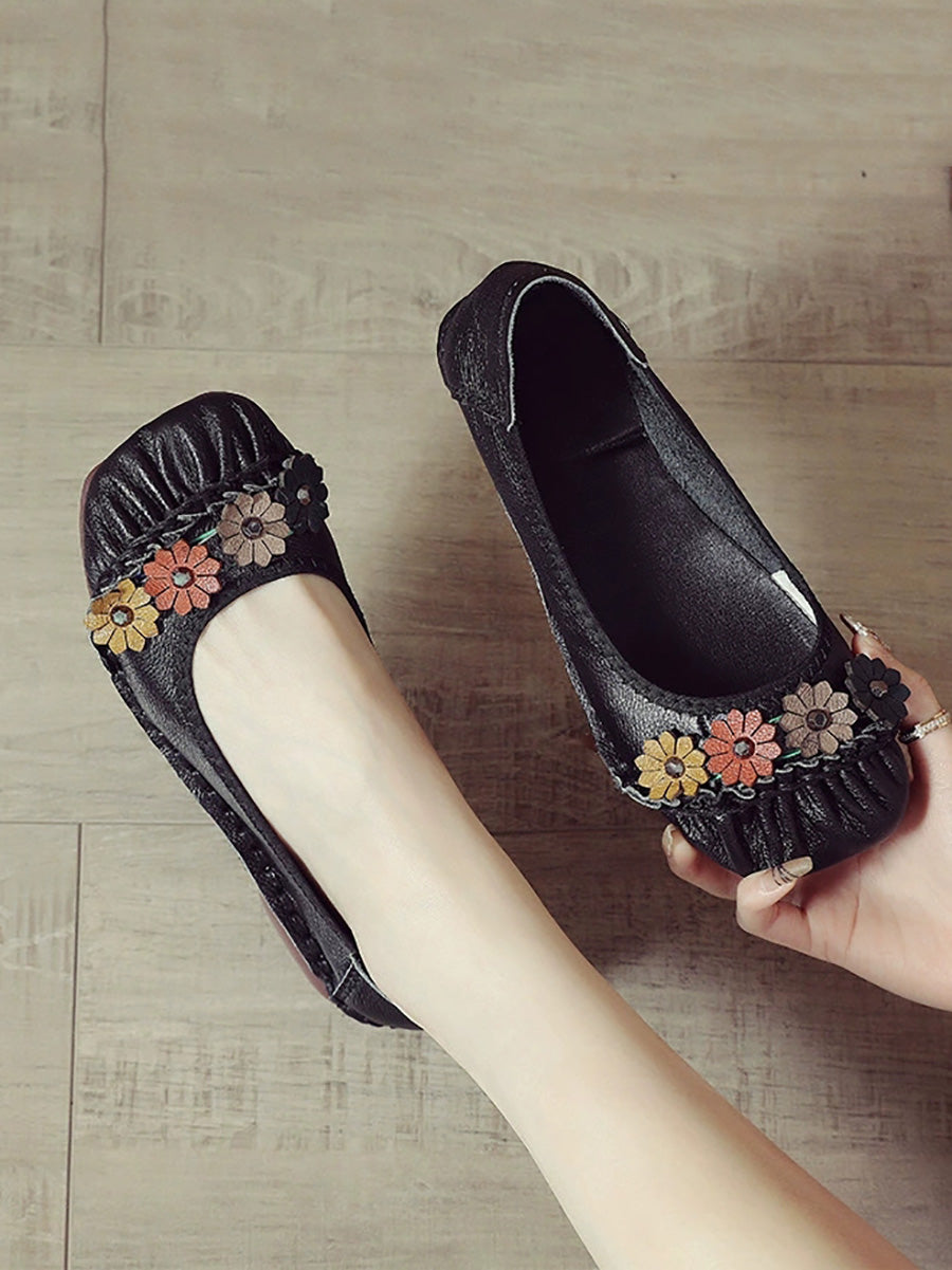Damen Vintage Schuhe mit Blumenmuster aus echtem Leder, niedriger Absatz