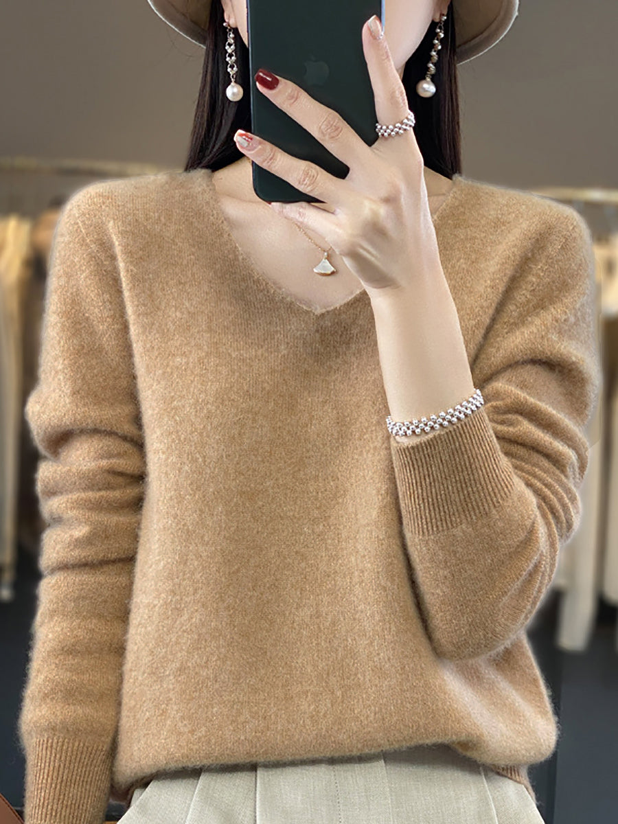 Γυναικείο πουλόβερ με πλεκτό φθινοπωρινό καθαρό χρώμα σε V λαιμόκοψη
