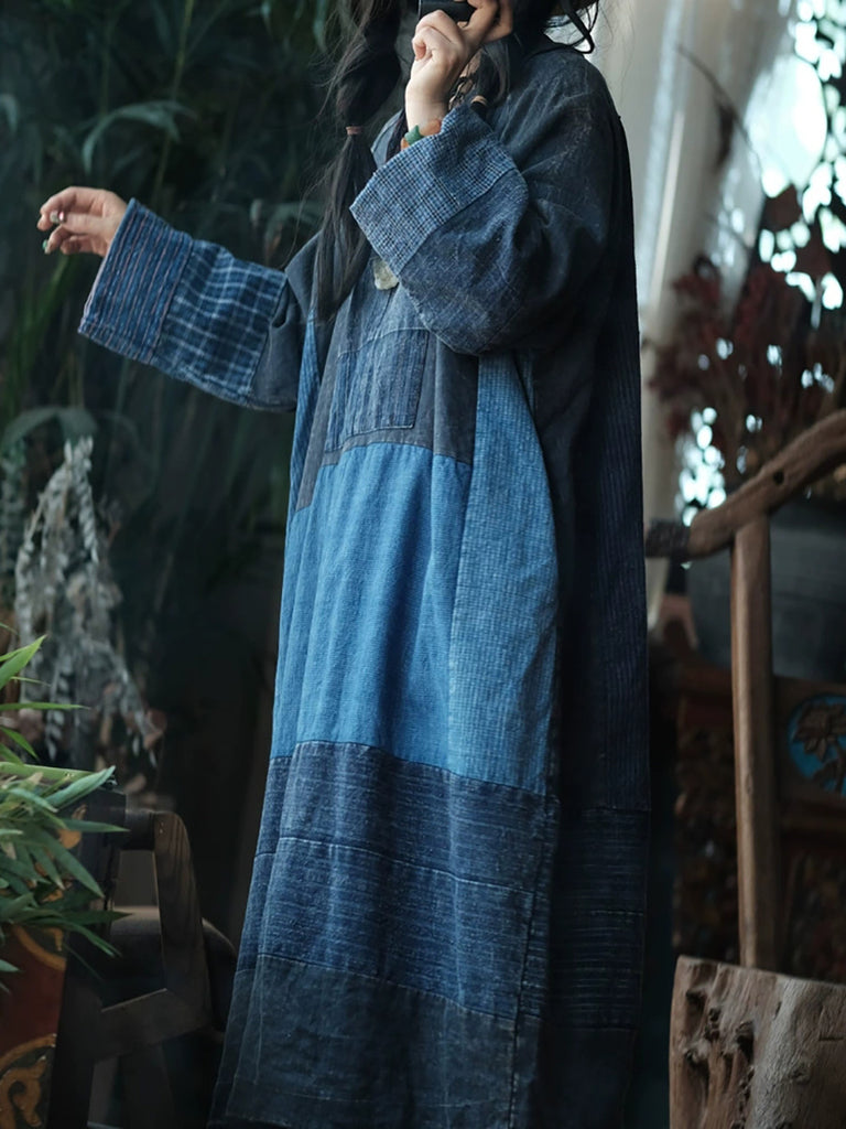 Γυναικείο Φθινοπωρινό Ρετρό Φόρεμα με V-Neck και Καθαρό Χρώμα Τζιν