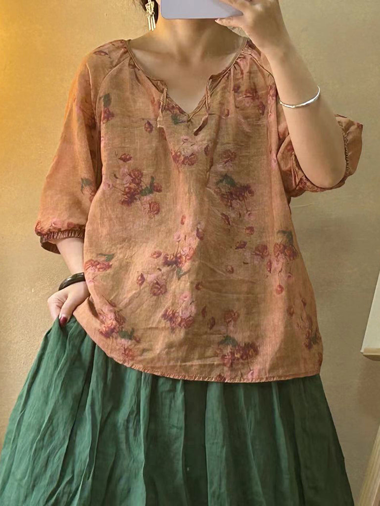 Γυναικείο πουκάμισο Ramie με Vintage λουλούδι με λαιμόκοψη