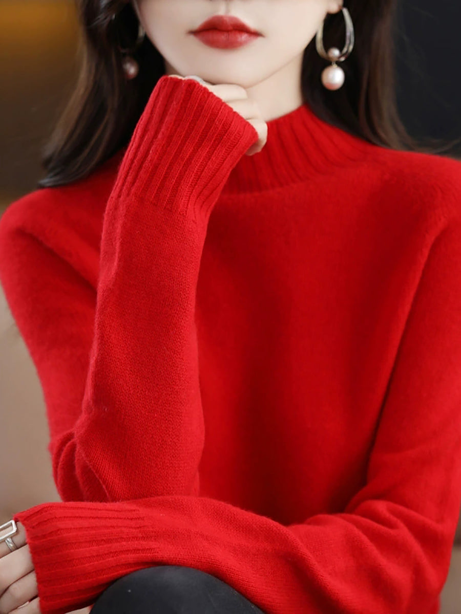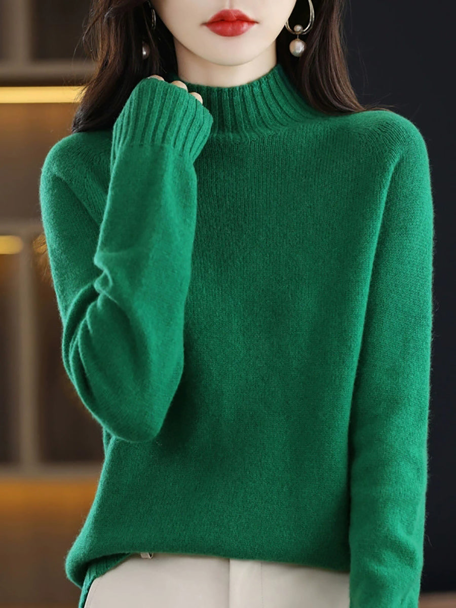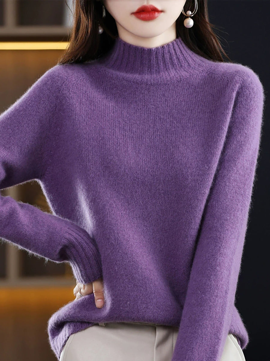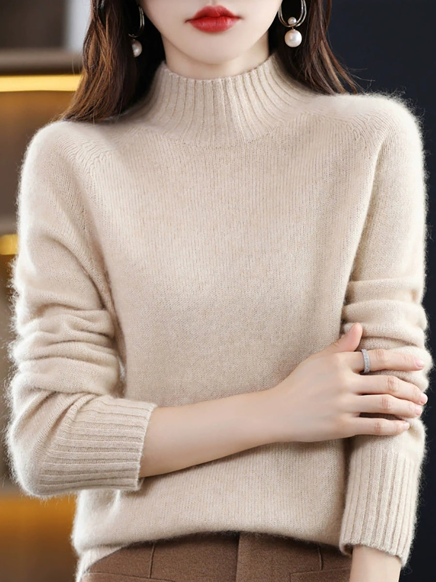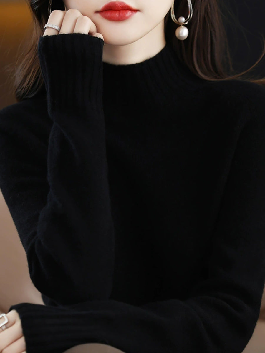 Suéter de punto con cuello alto medio de color puro y estilo artístico de otoño para mujer