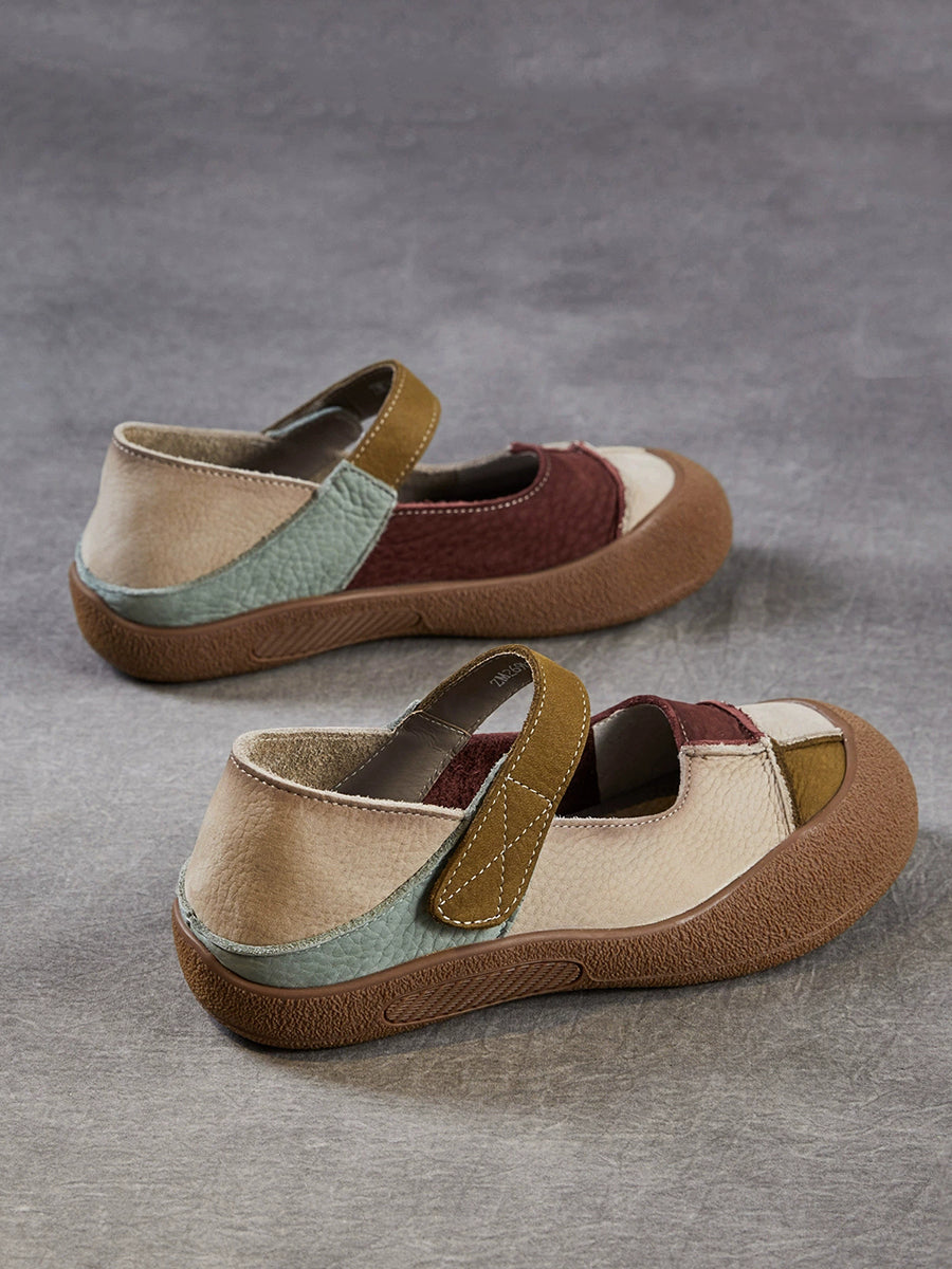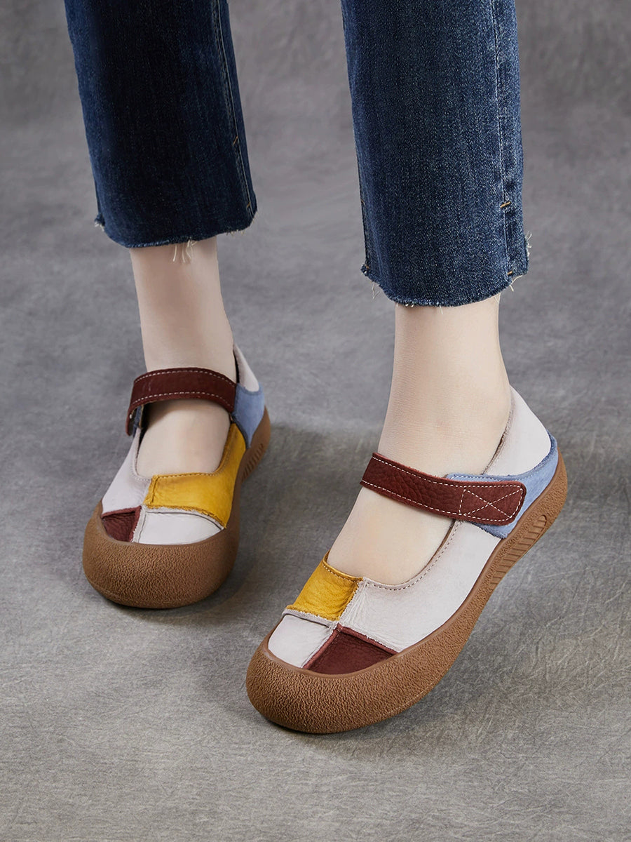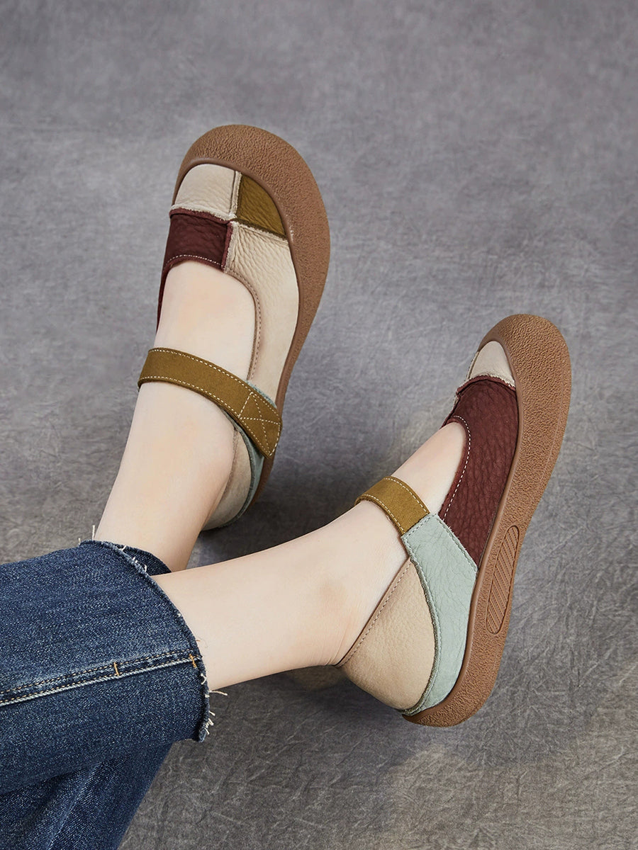 Zapatos retro de verano con bloques de color en piel auténtica para mujer