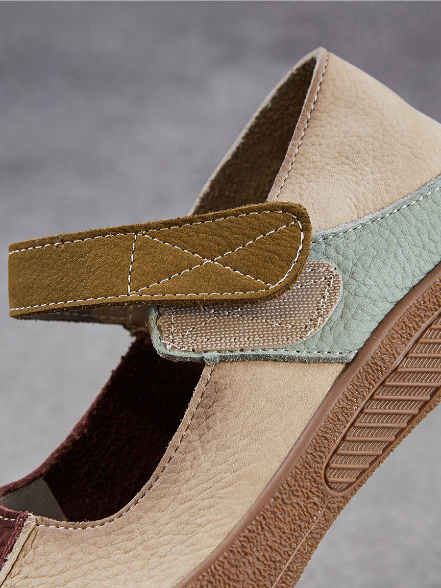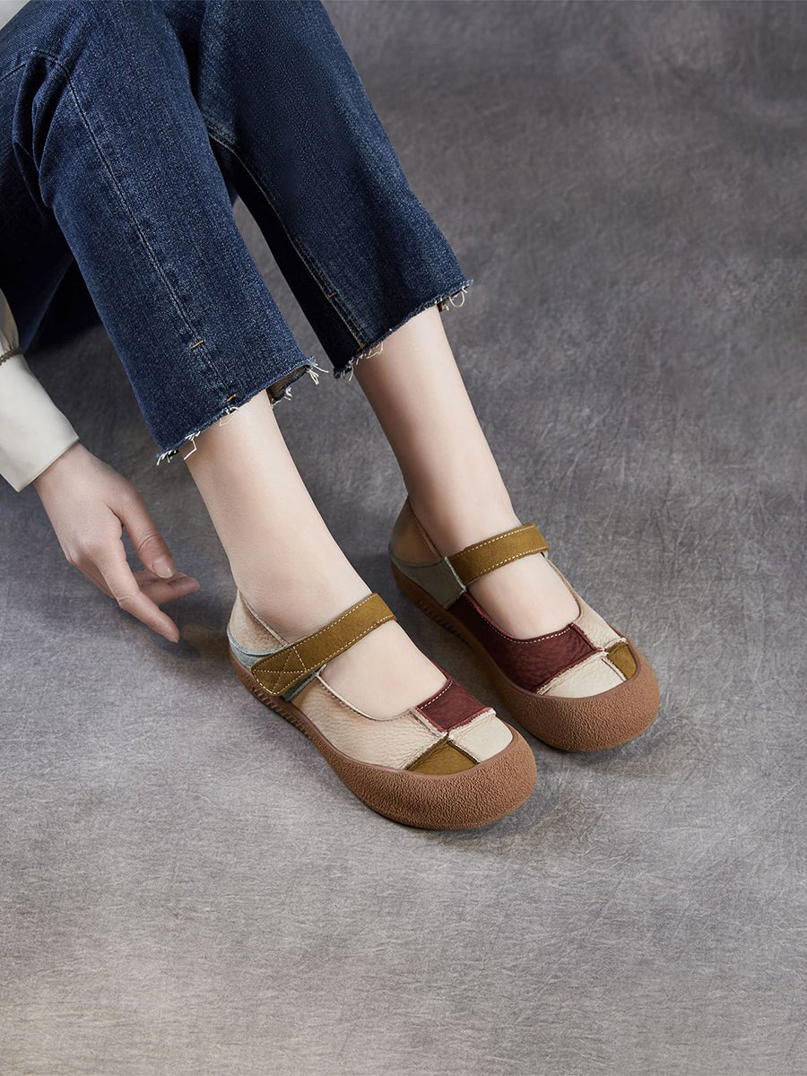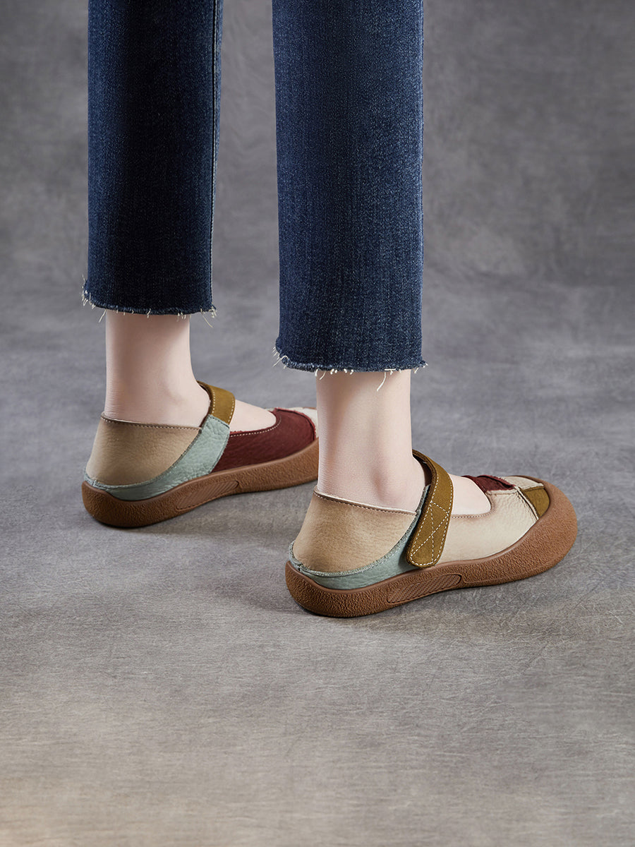 Zapatos retro de verano con bloques de color en piel auténtica para mujer