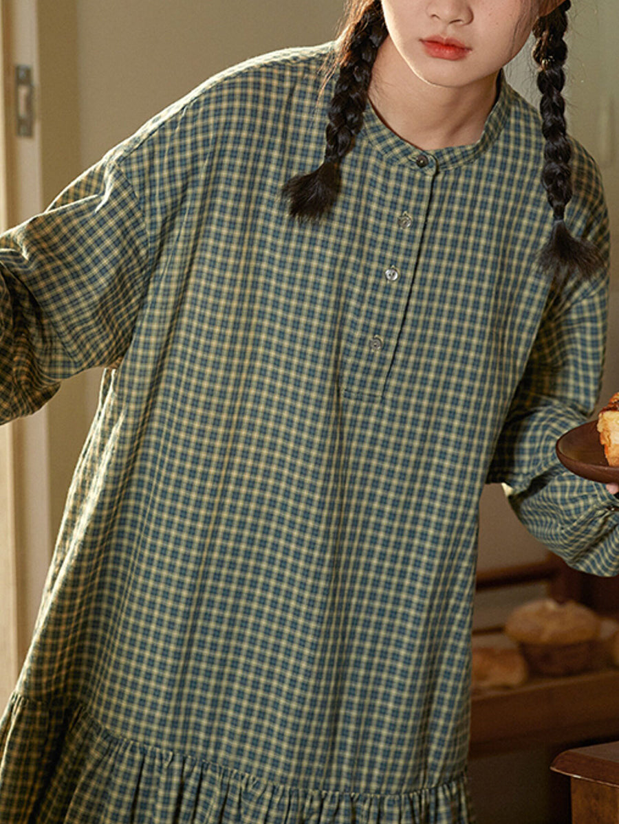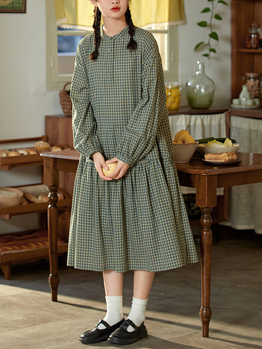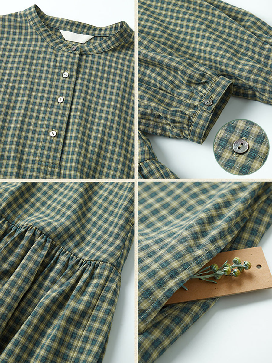 Vestido de primavera para mujer, 100 % algodón, con cuello redondo y estampado artístico a cuadros