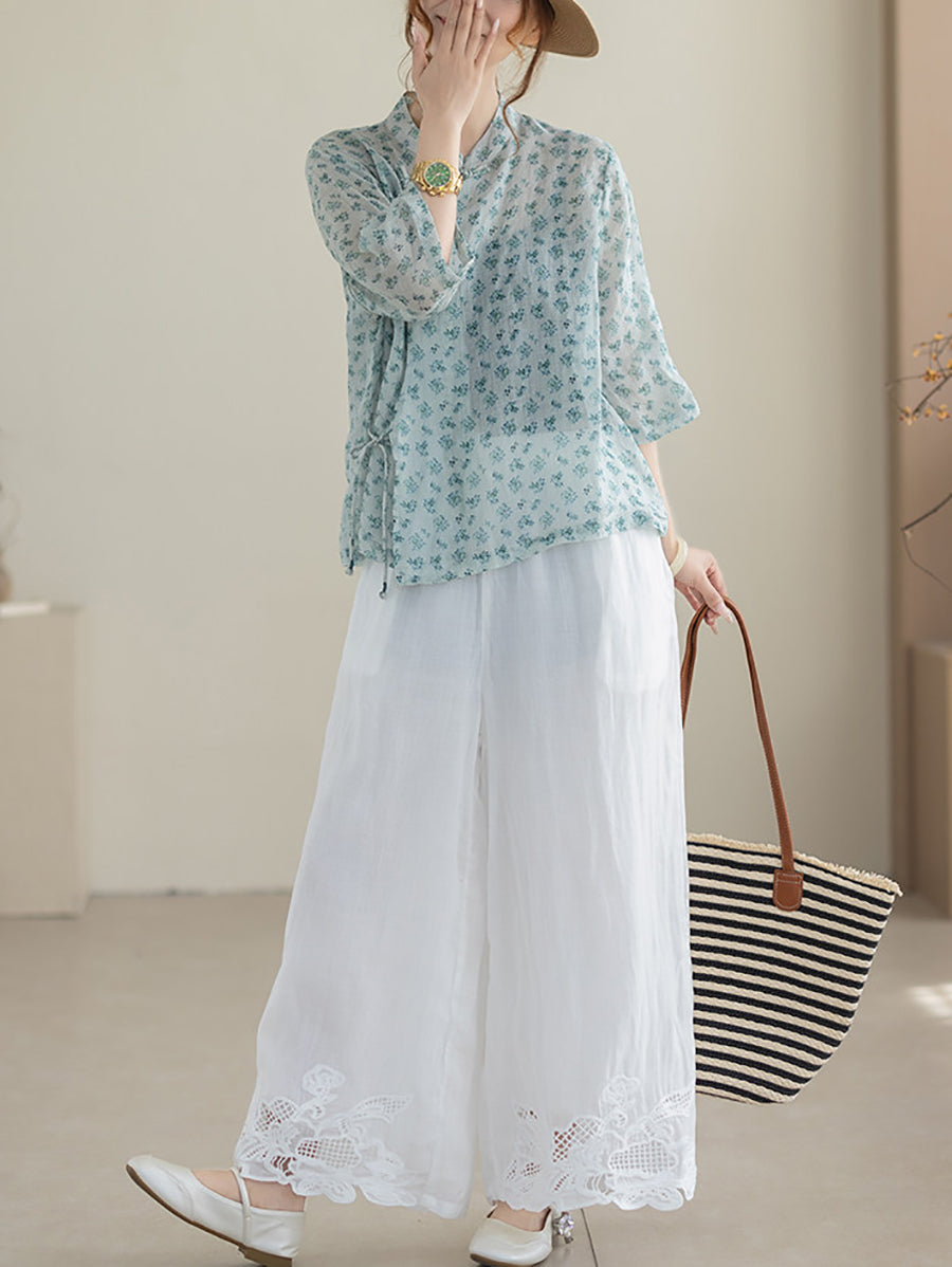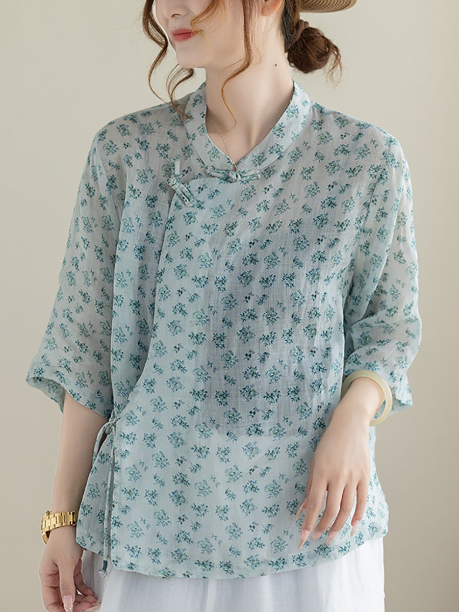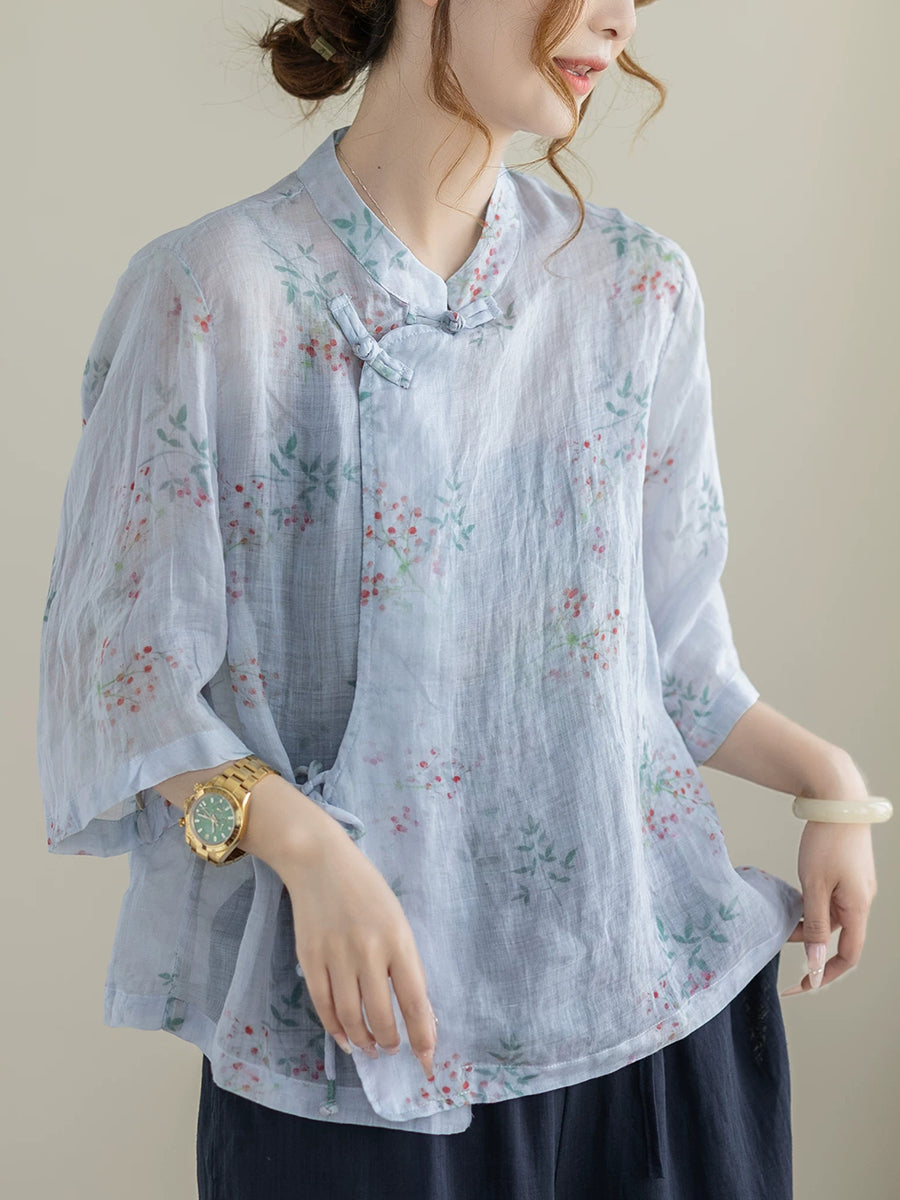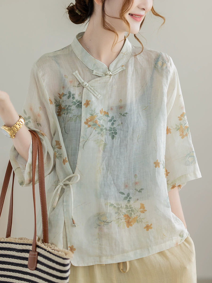 Blusa étnica de verano para mujer con cuello alto y estampado floral, 100% ramio.