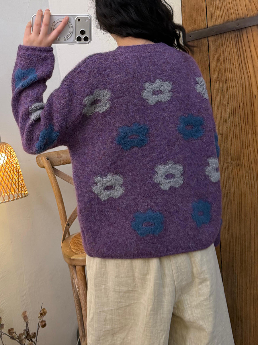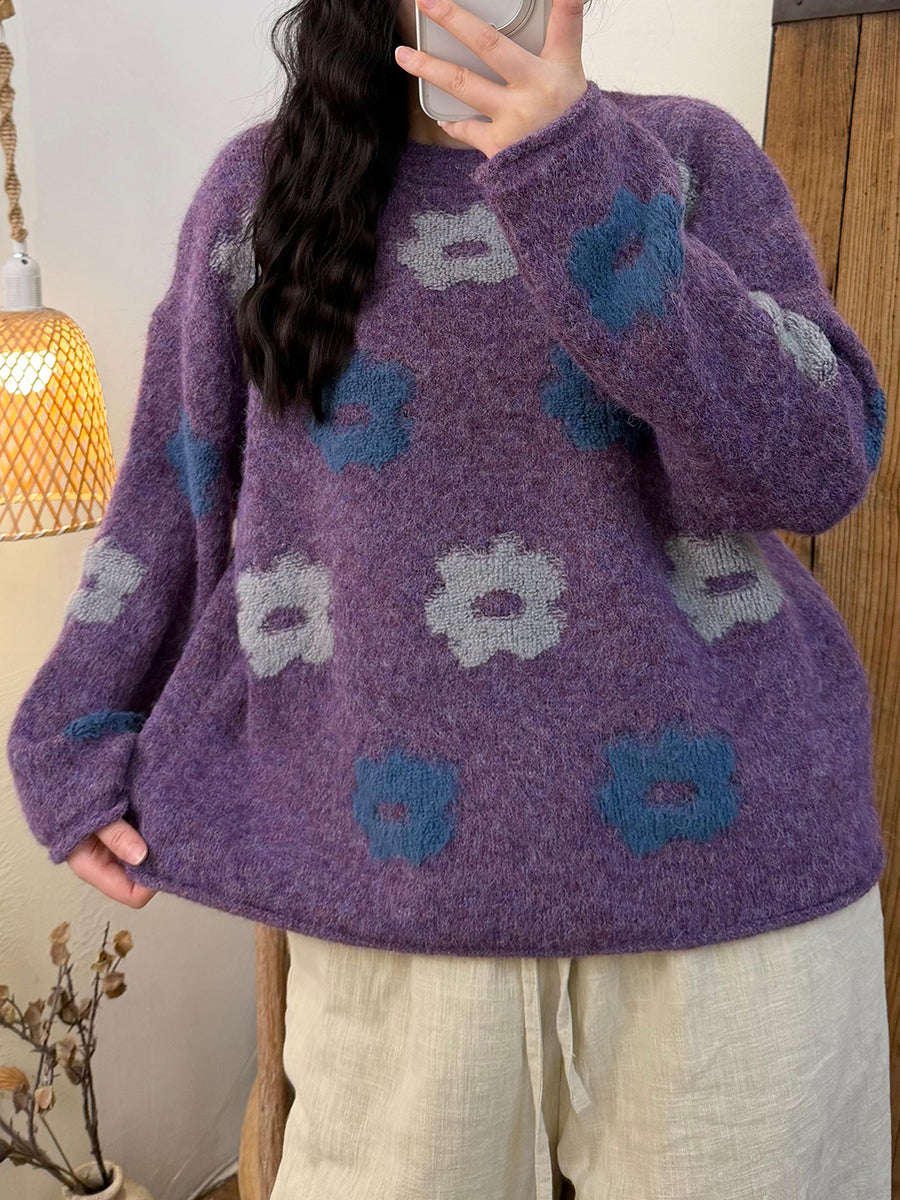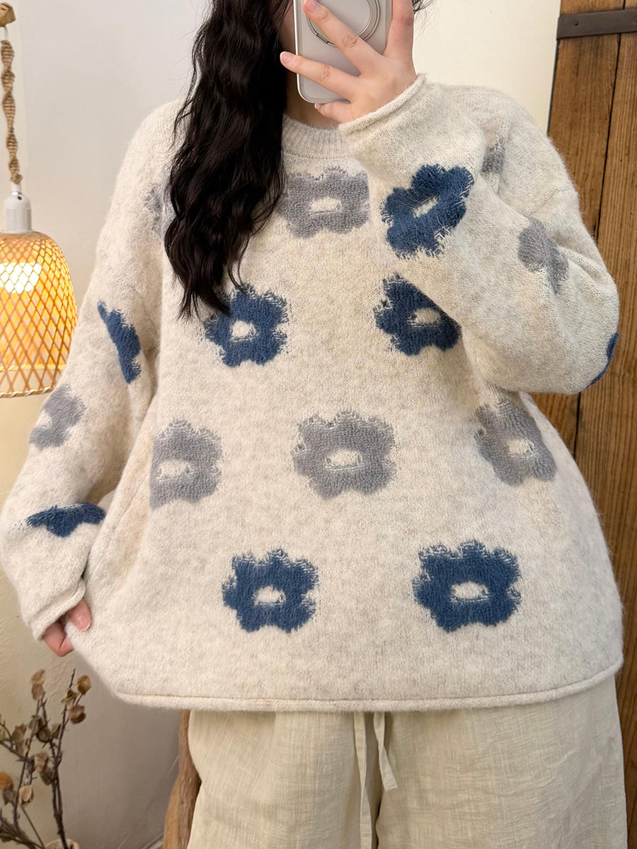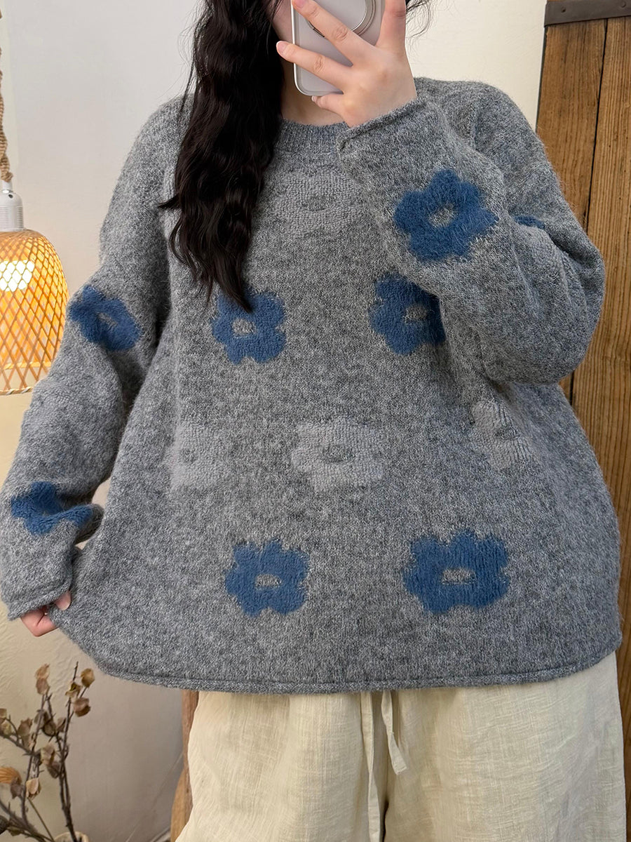 Suéter de punto con cuello redondo y flores artísticas de invierno para mujer