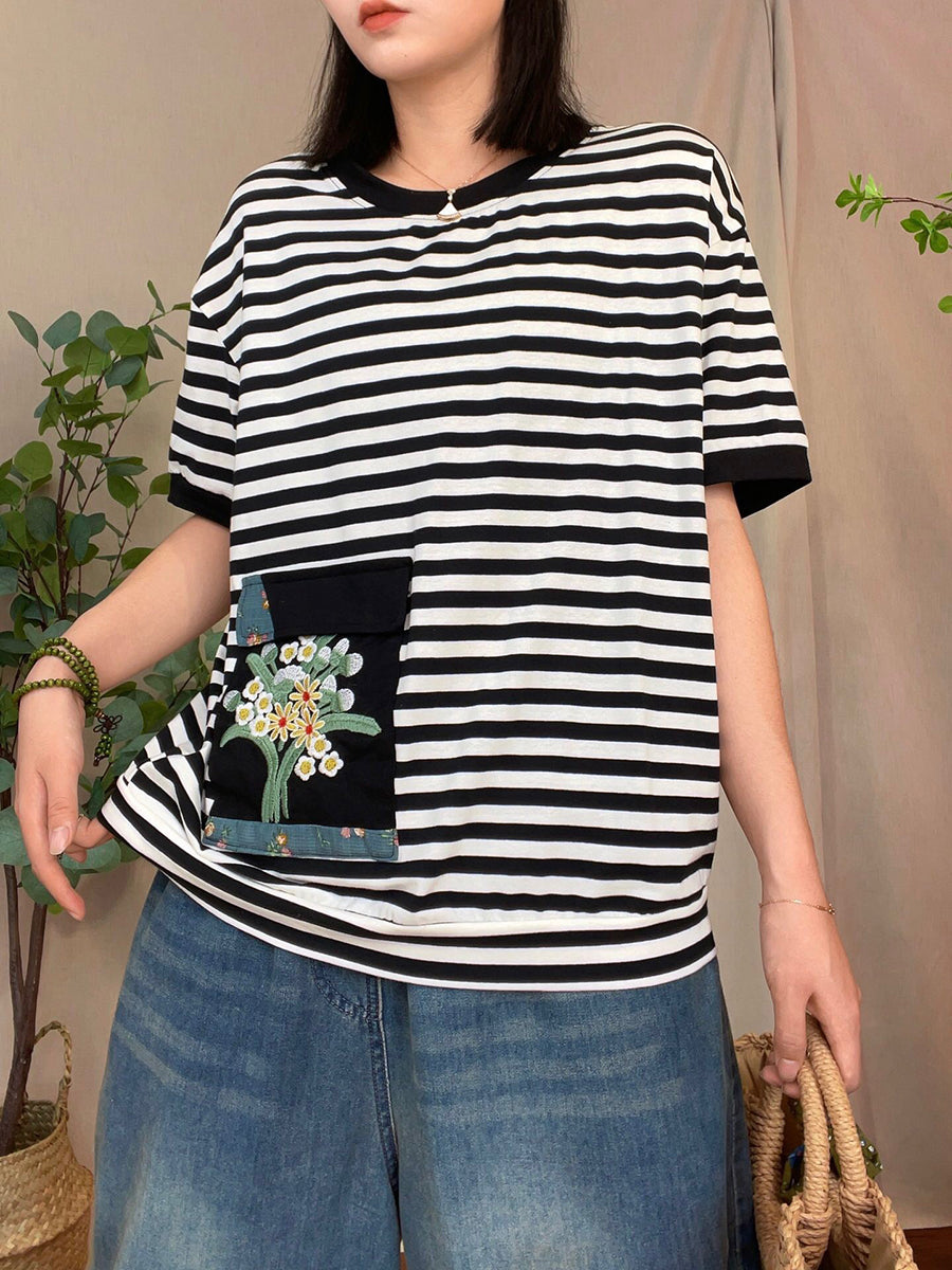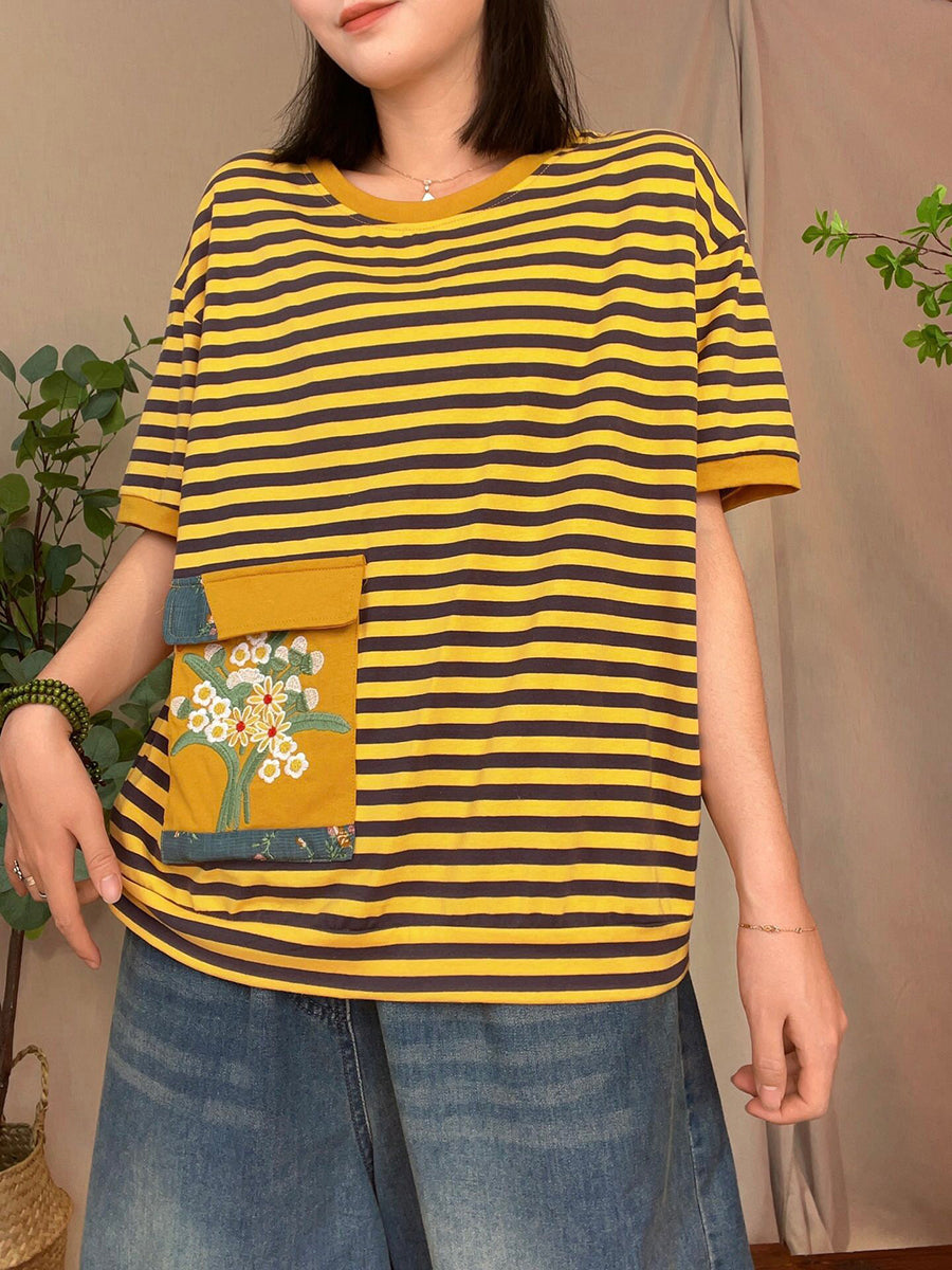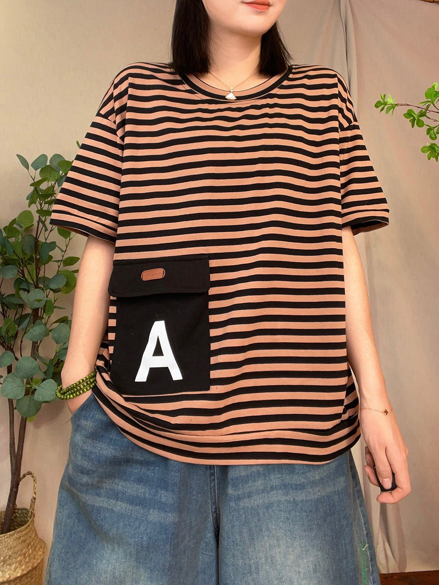 Camisa casual de verano con bolsillo tipo parche a rayas para mujer