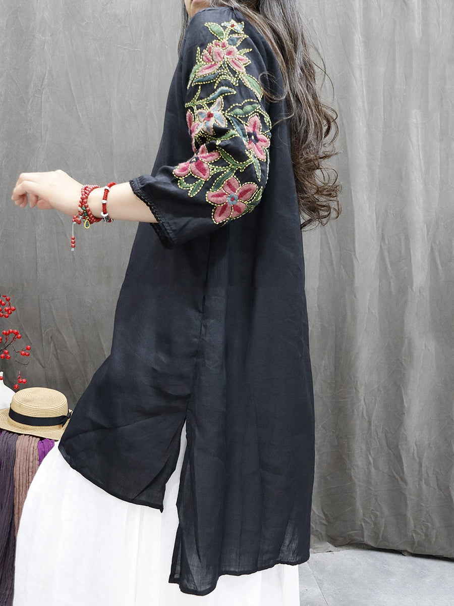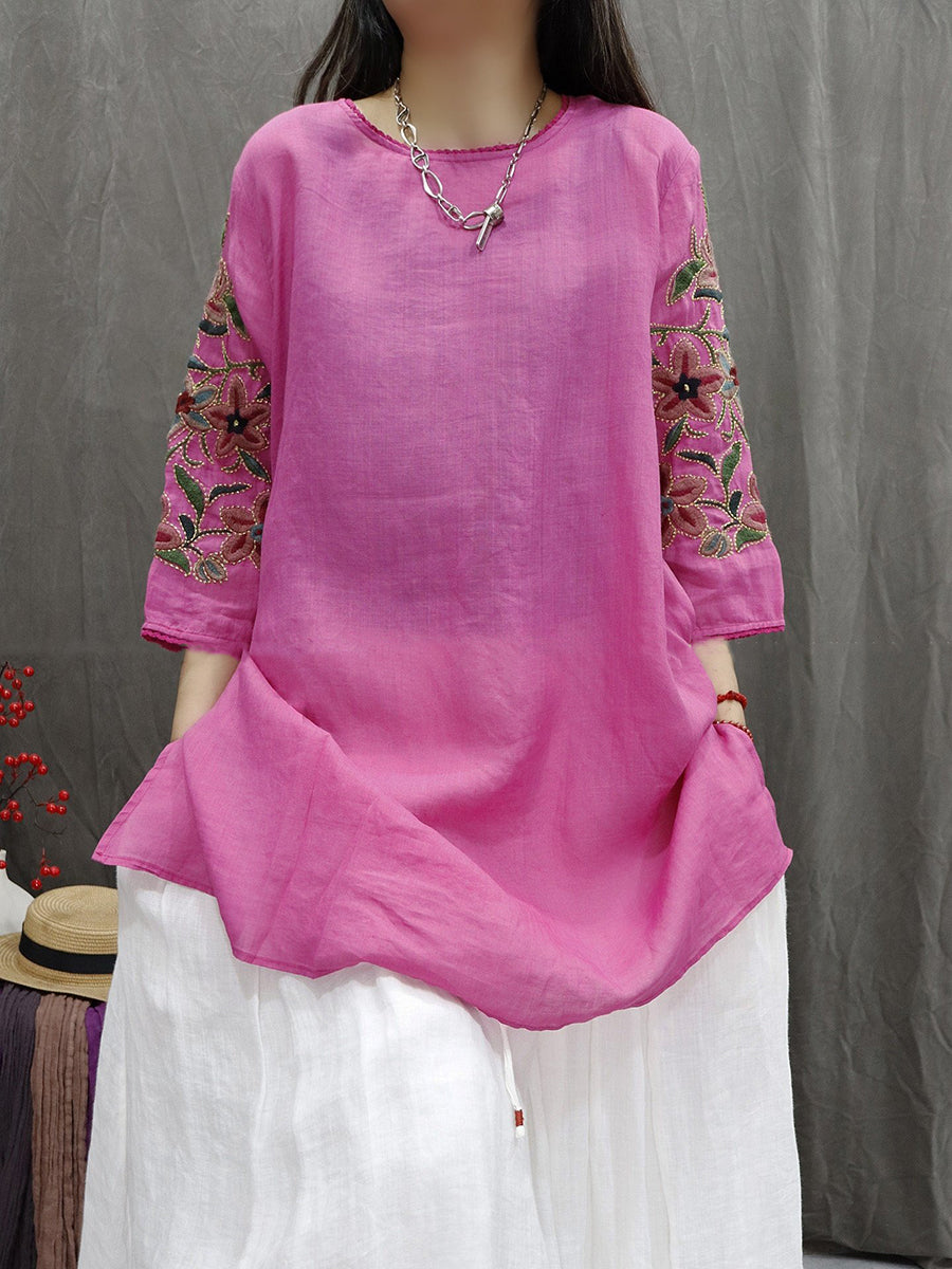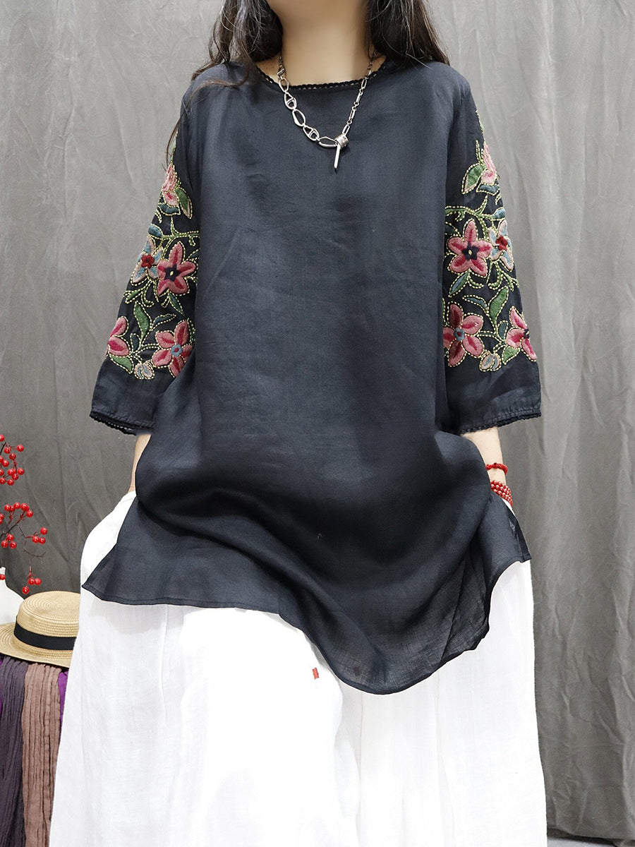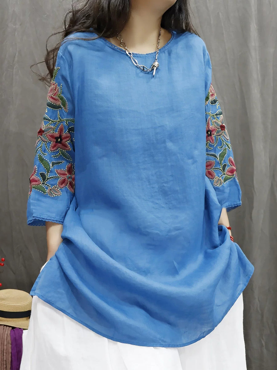 Blusa de mujer con cuello redondo y bordado floral 100 % ramio