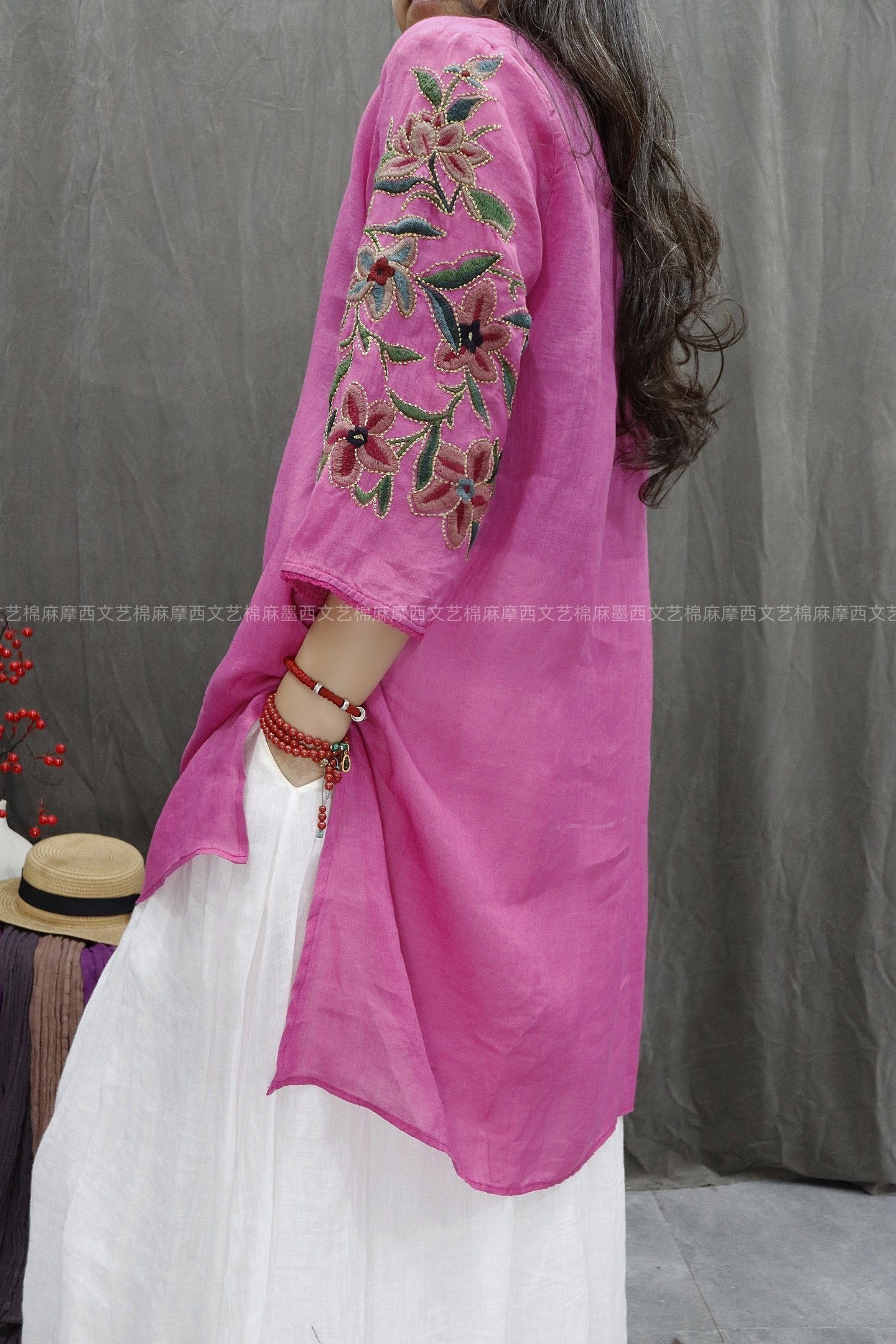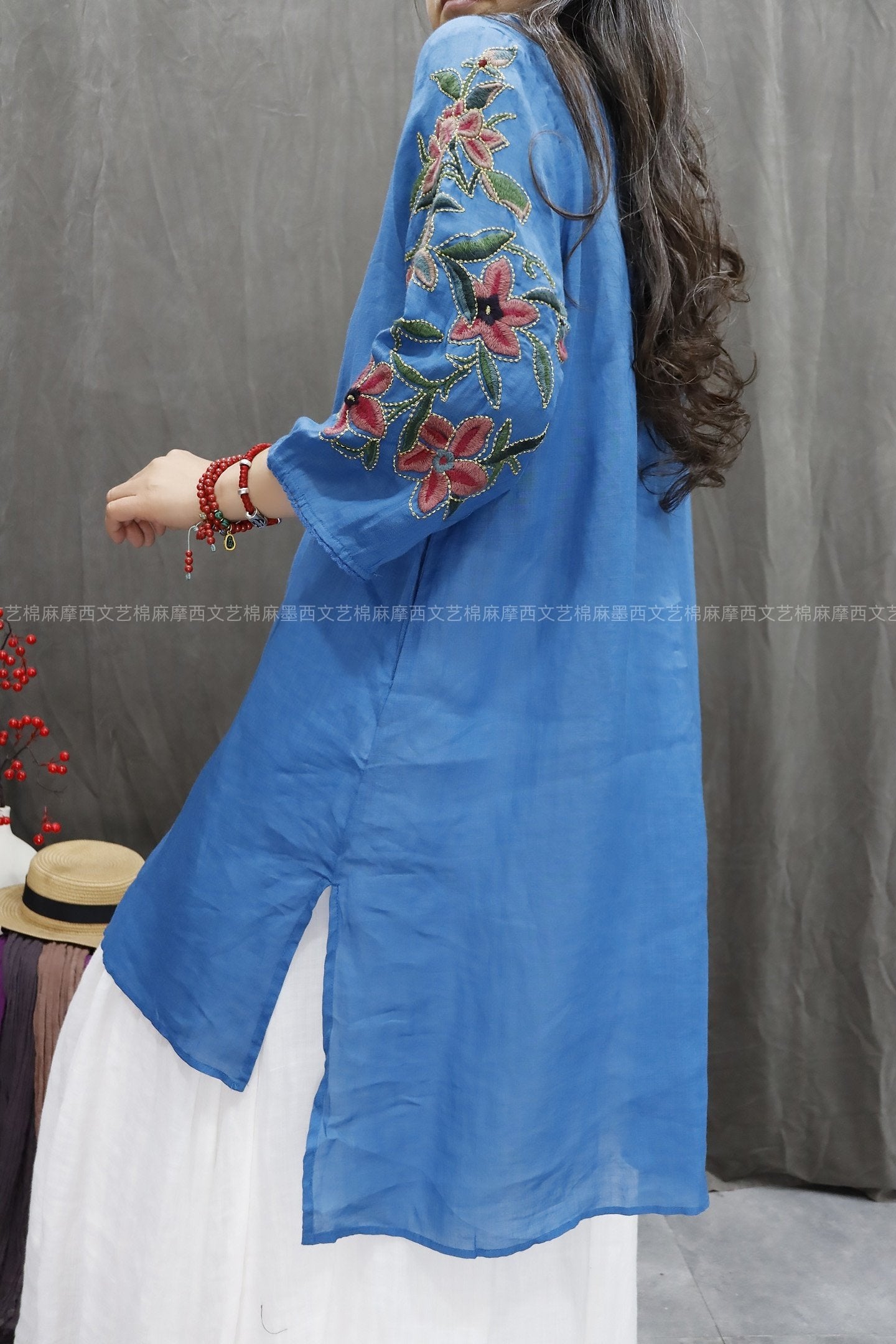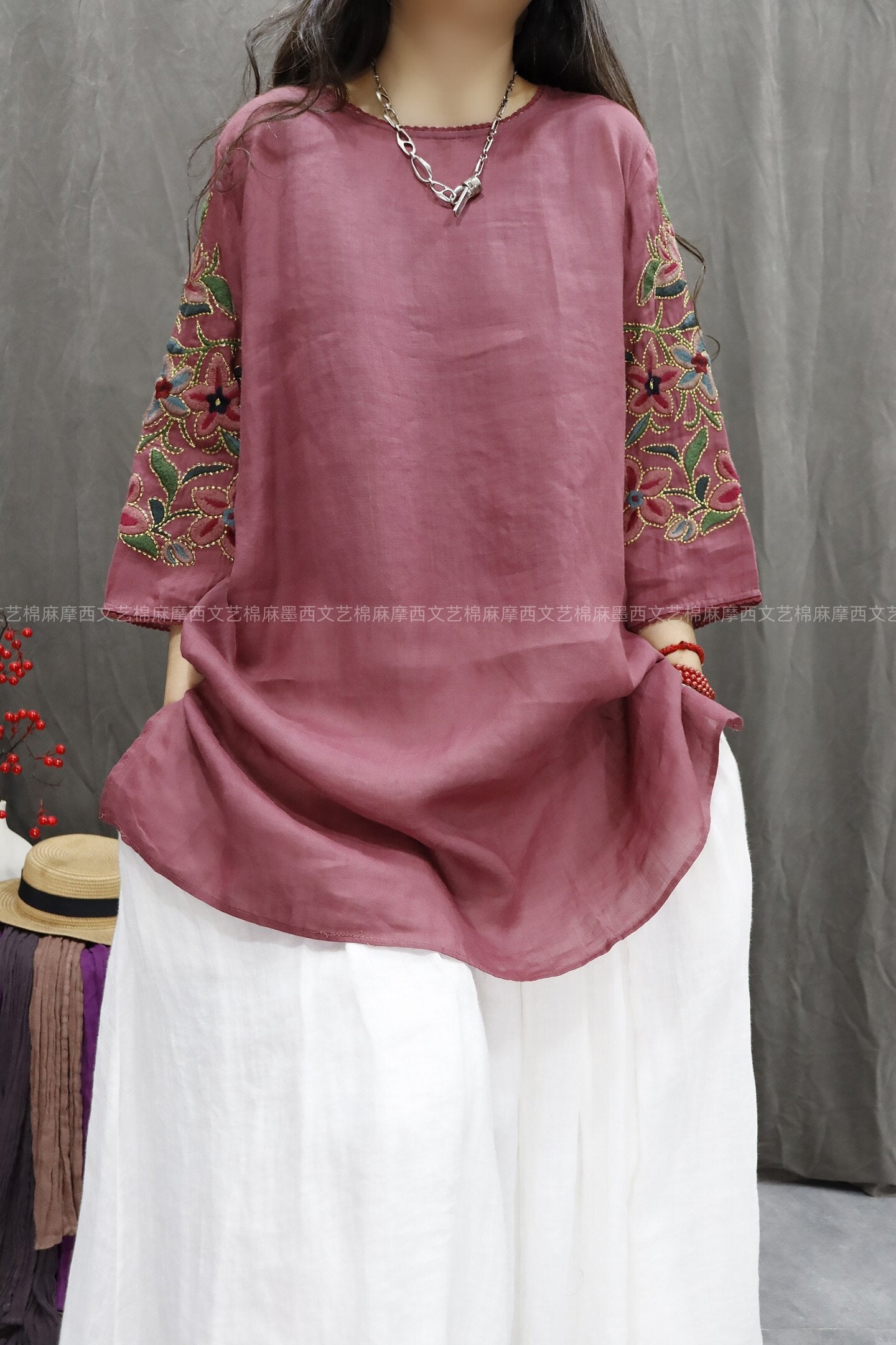 Blusa de mujer con cuello redondo y bordado floral 100 % ramio