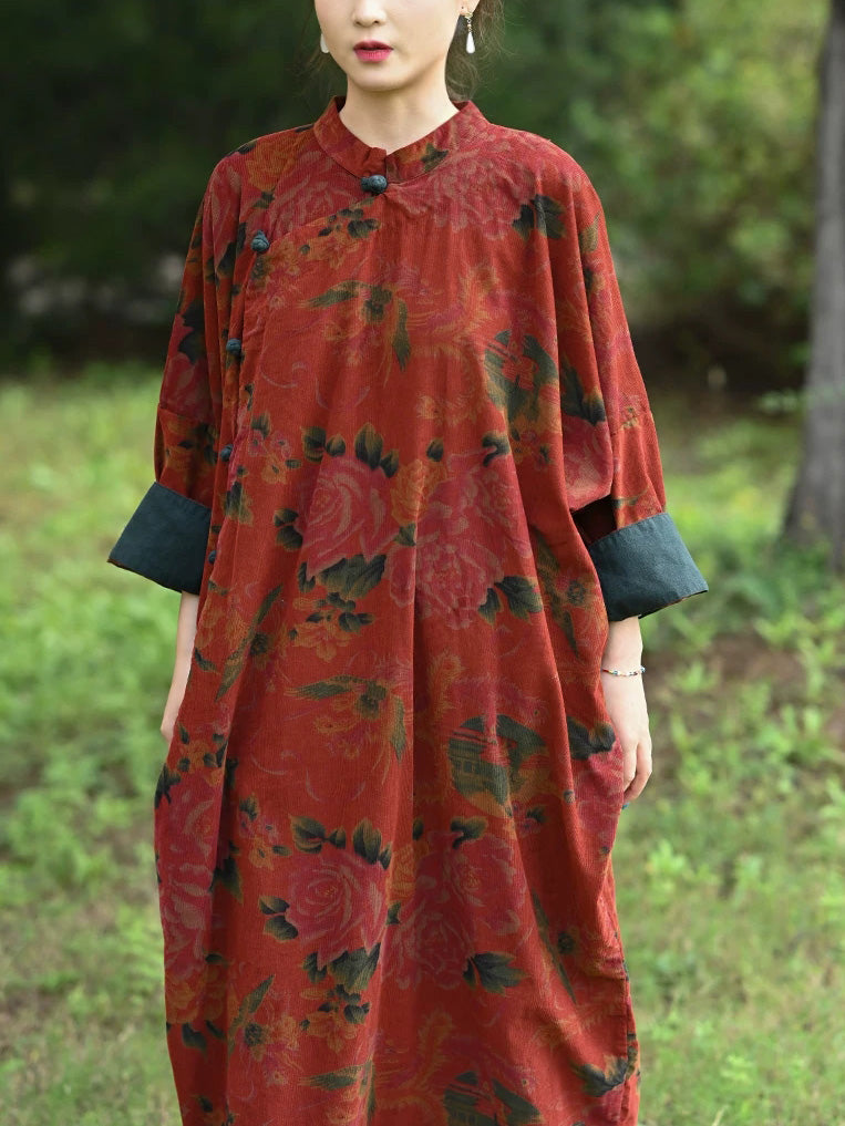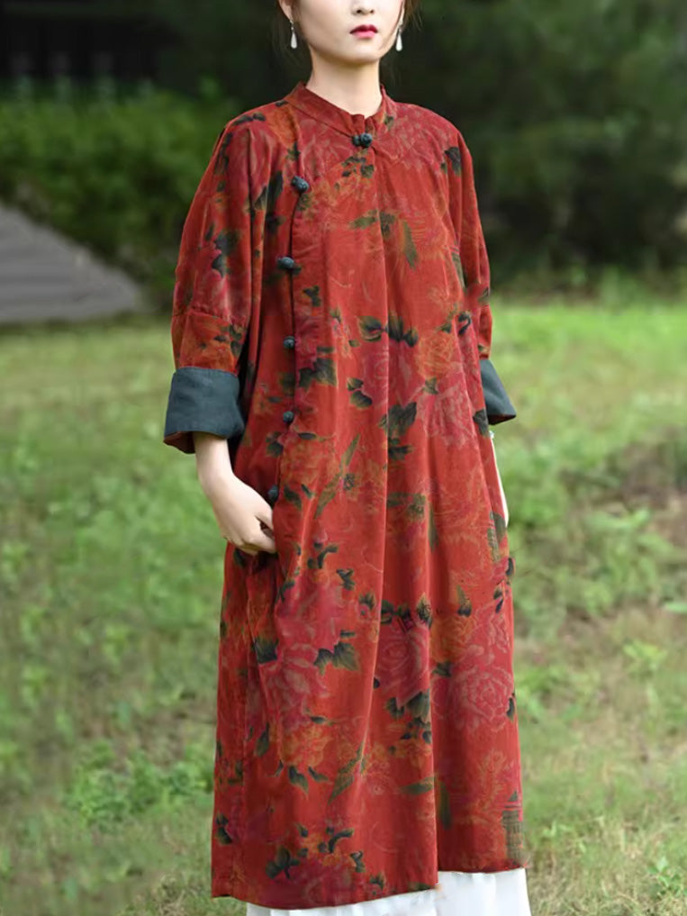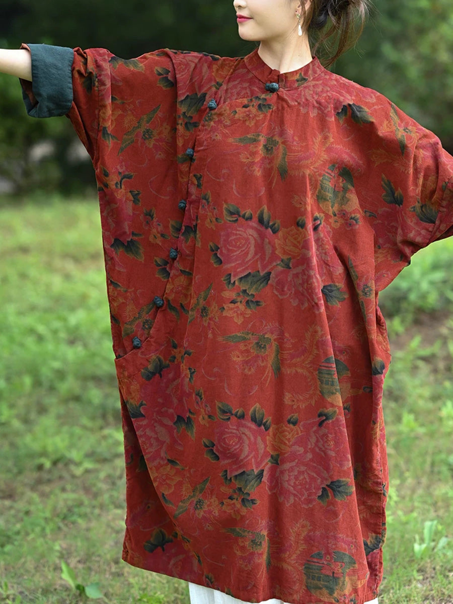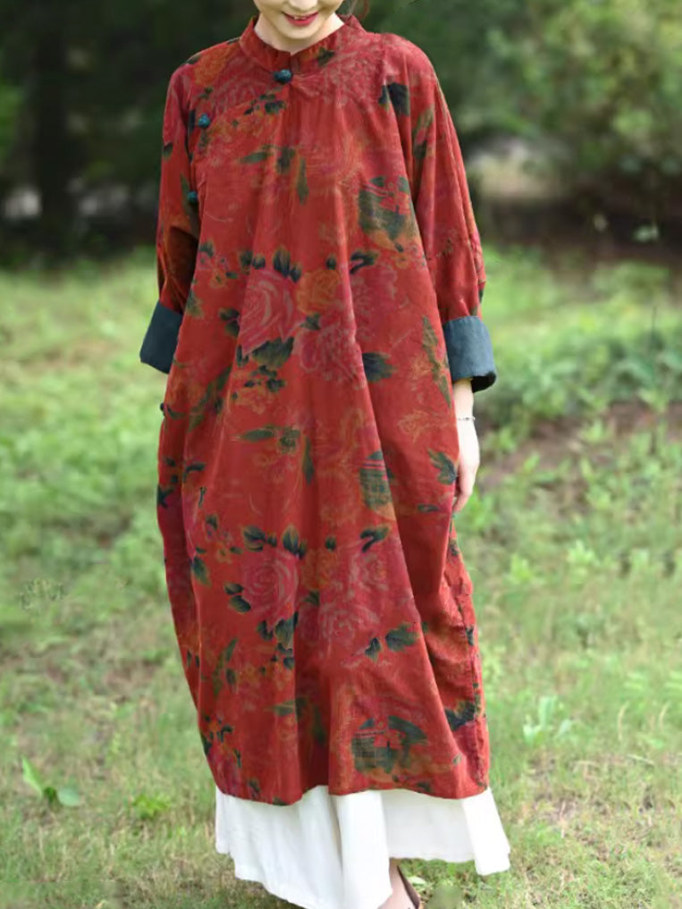 Vestido vintage de otoño con cuello alto y flores para mujer, 100 % algodón