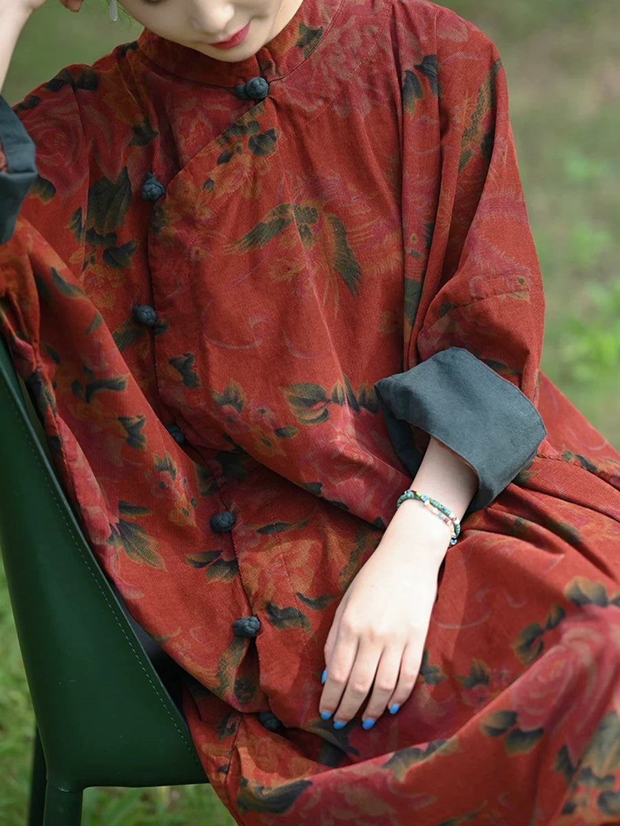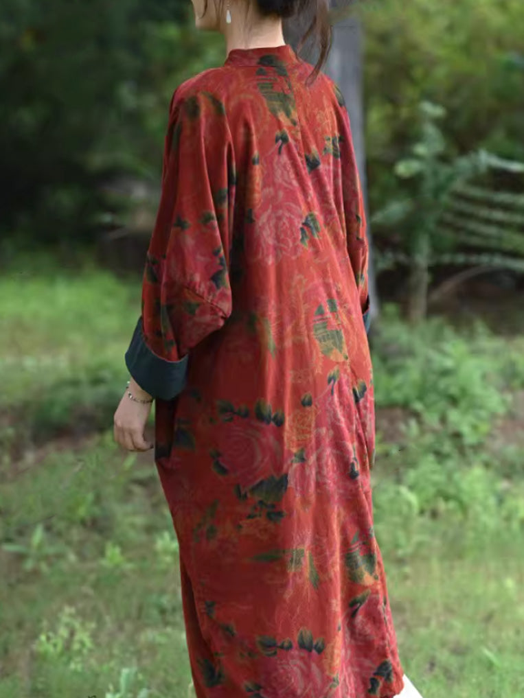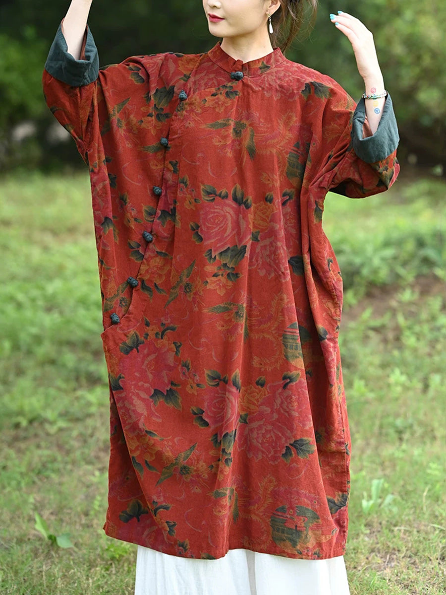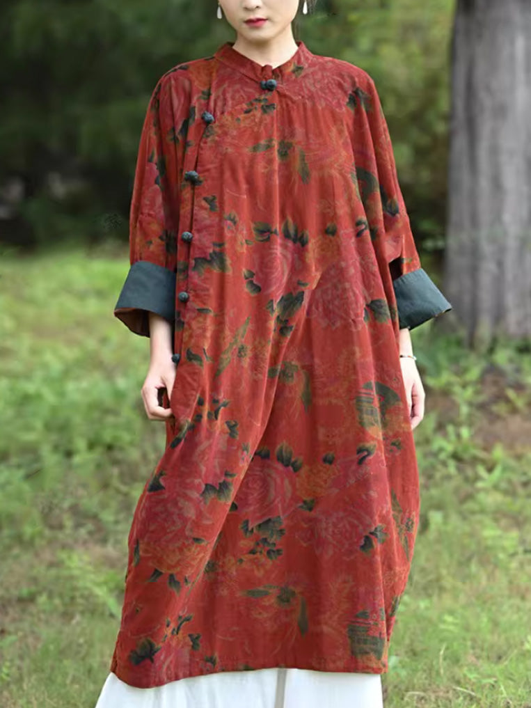 Vestido vintage de otoño con cuello alto y flores para mujer, 100 % algodón