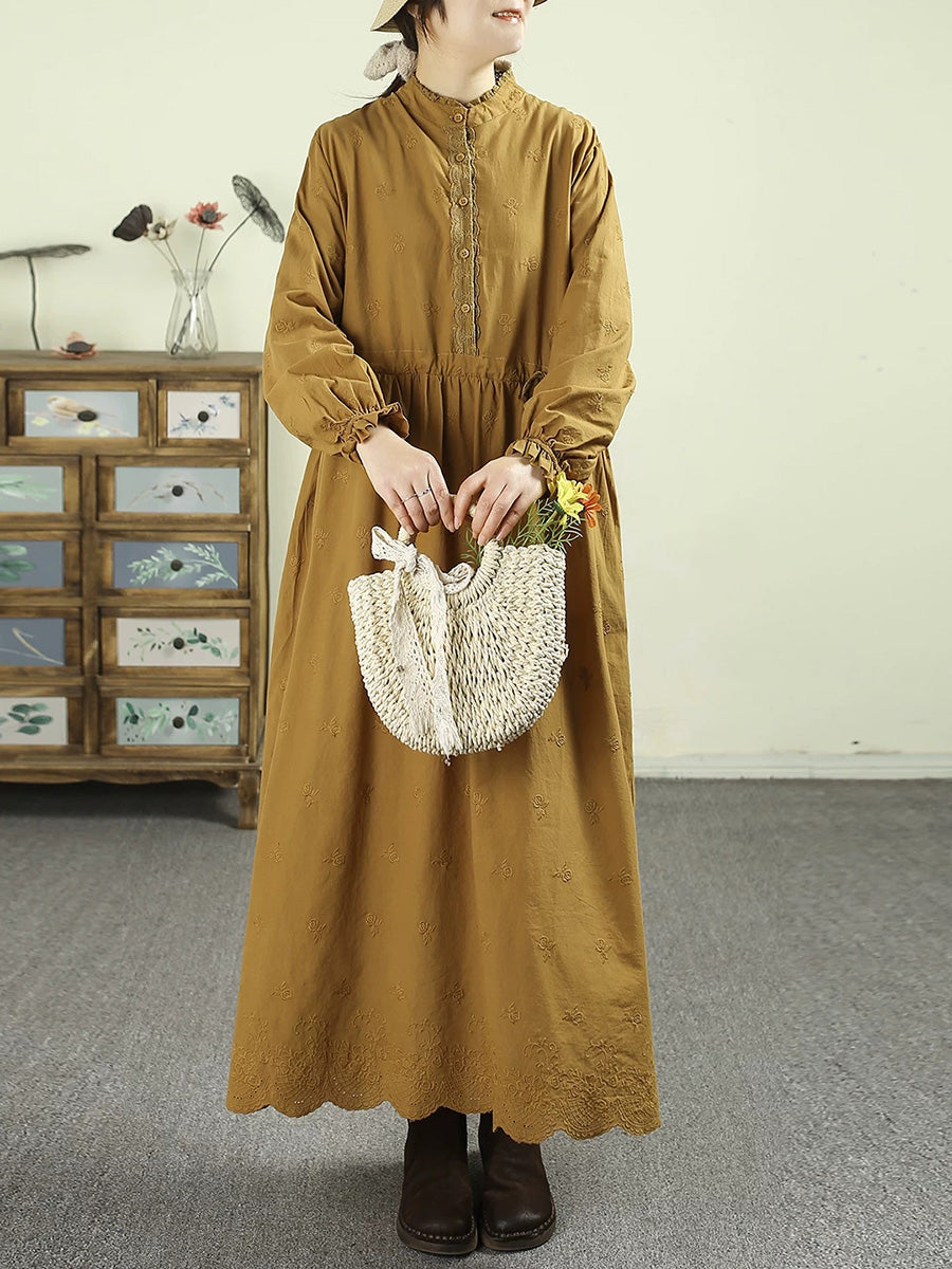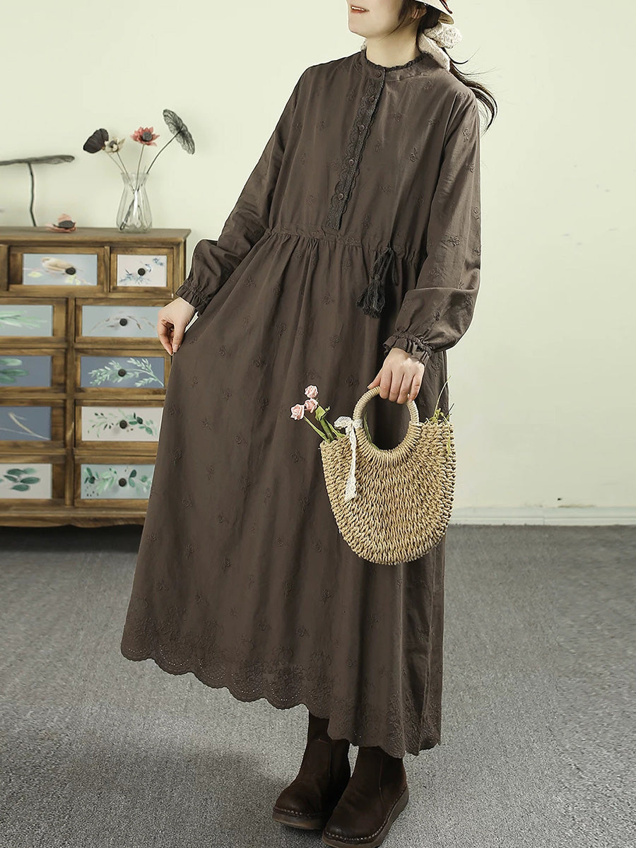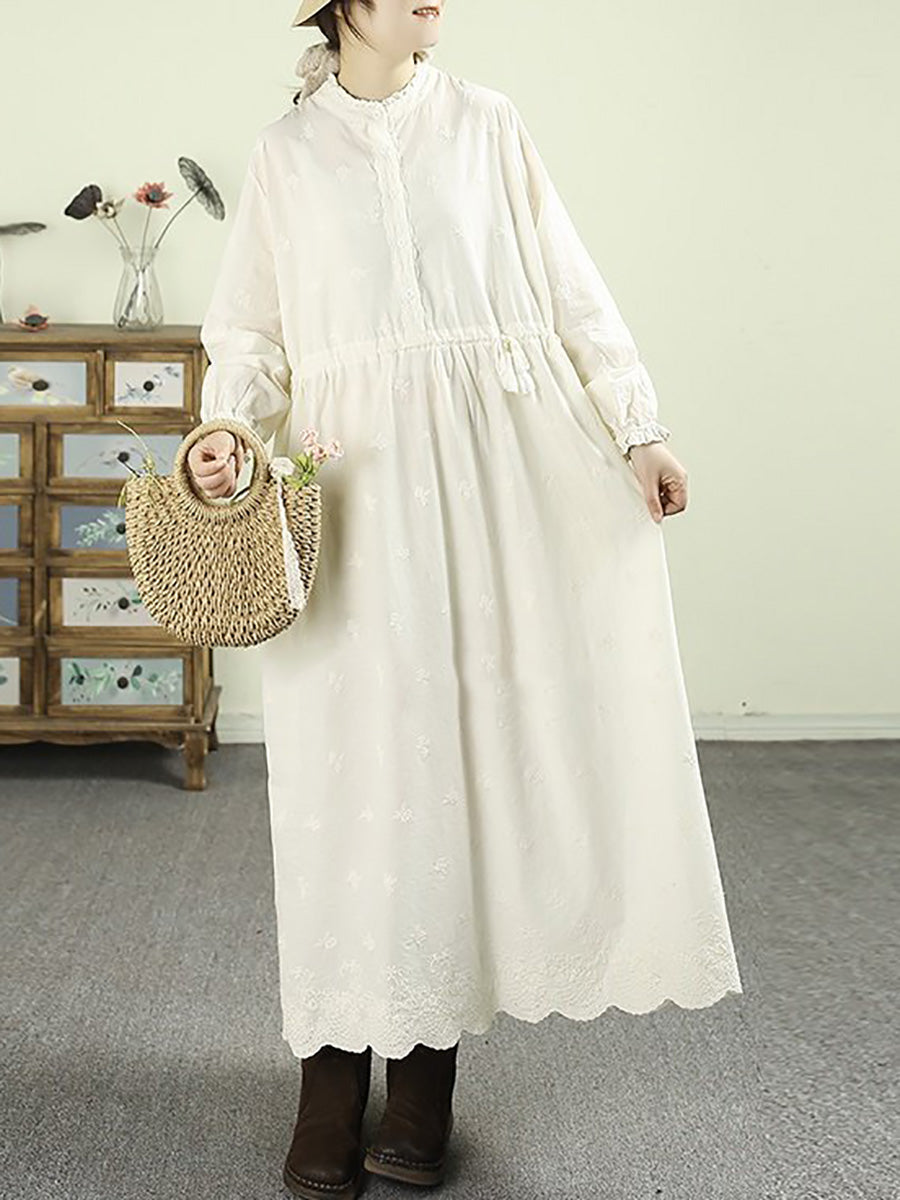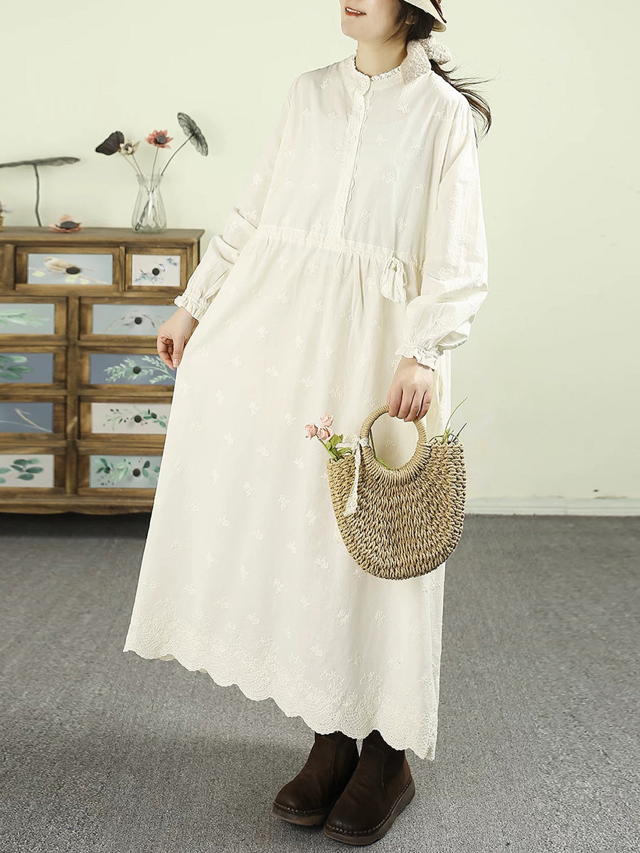 Vestido de primavera para mujer, 100 % algodón, con cuello alto y bordado artístico